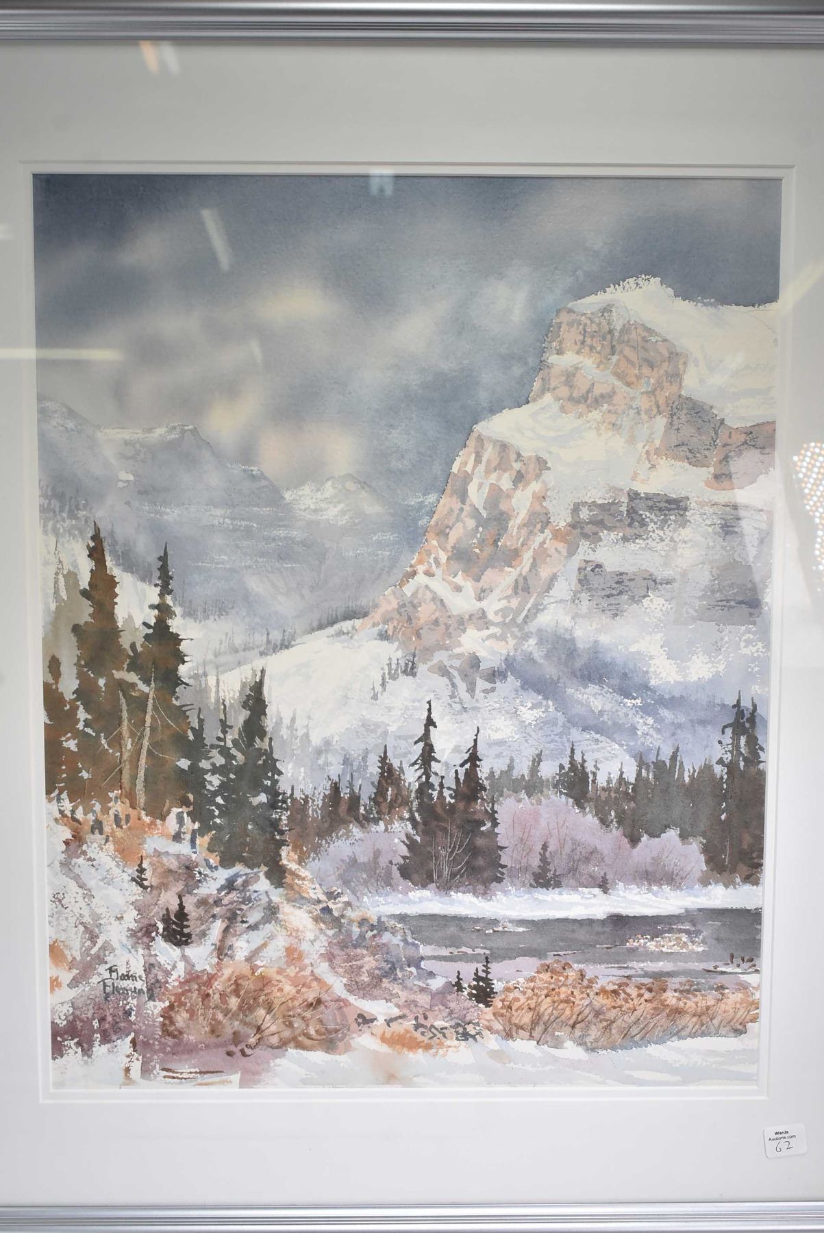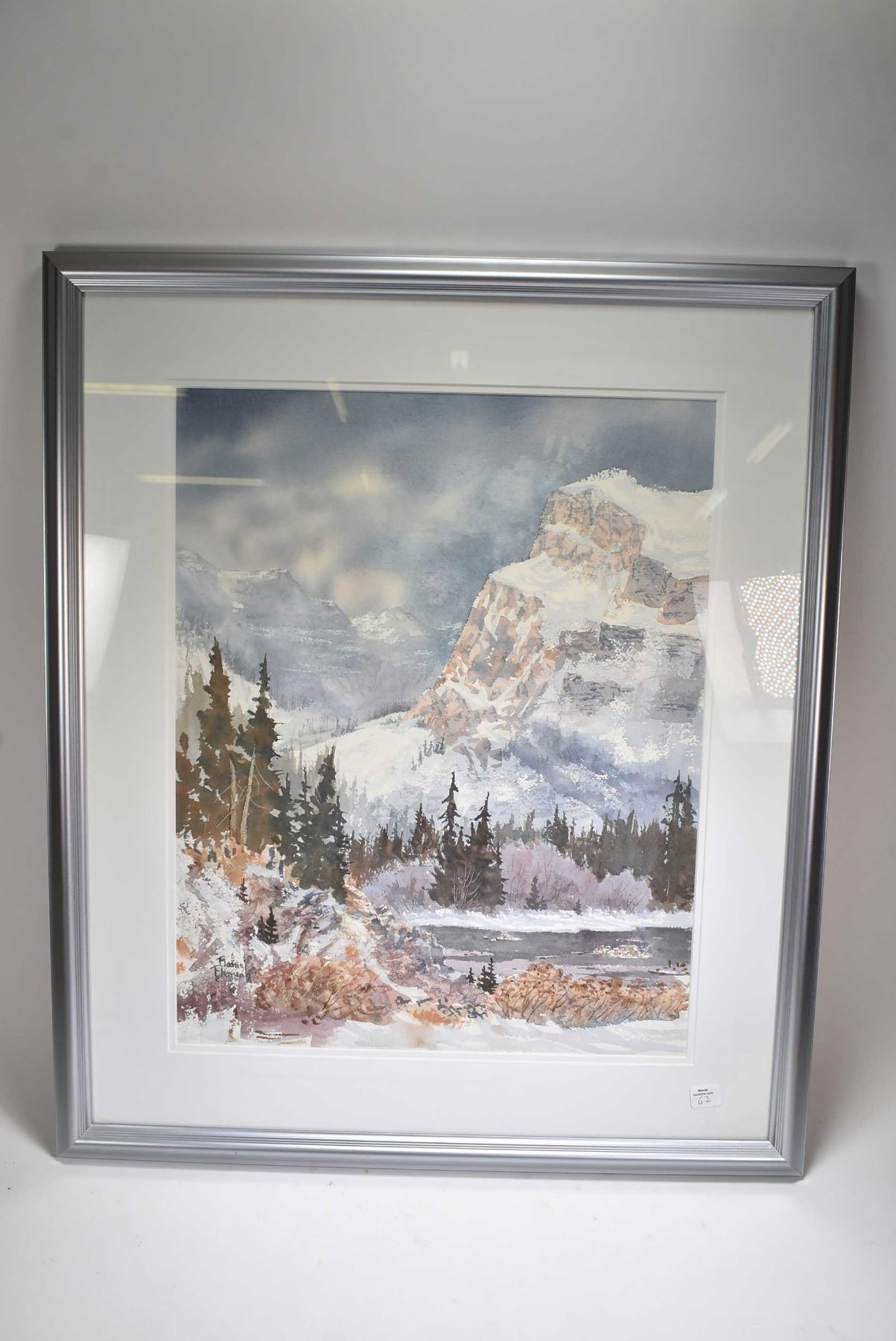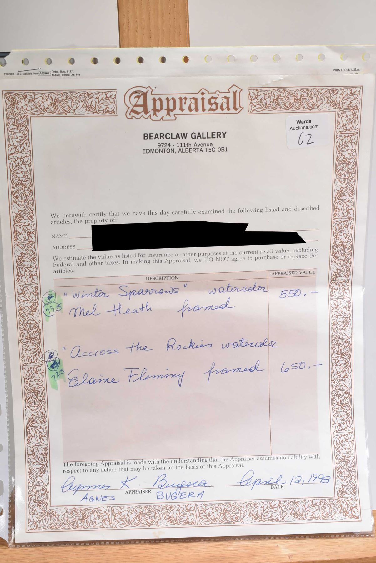 Framed original watercolour painting possibly titled "Across the Rockies" by artist Elaine Fleming 22" X 18", includes an appraisal dated 1993 from Bear Claw Gallery for $650.00