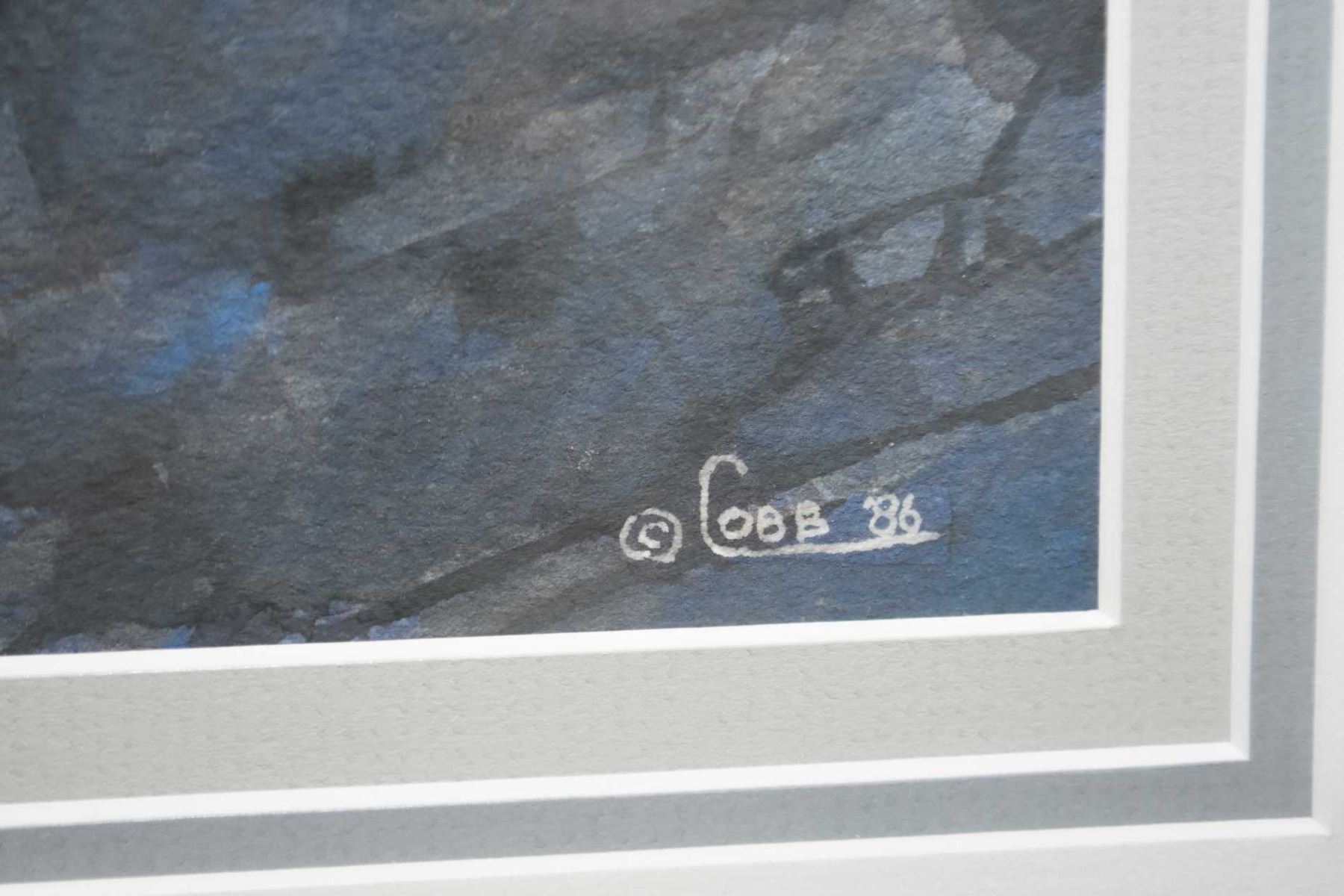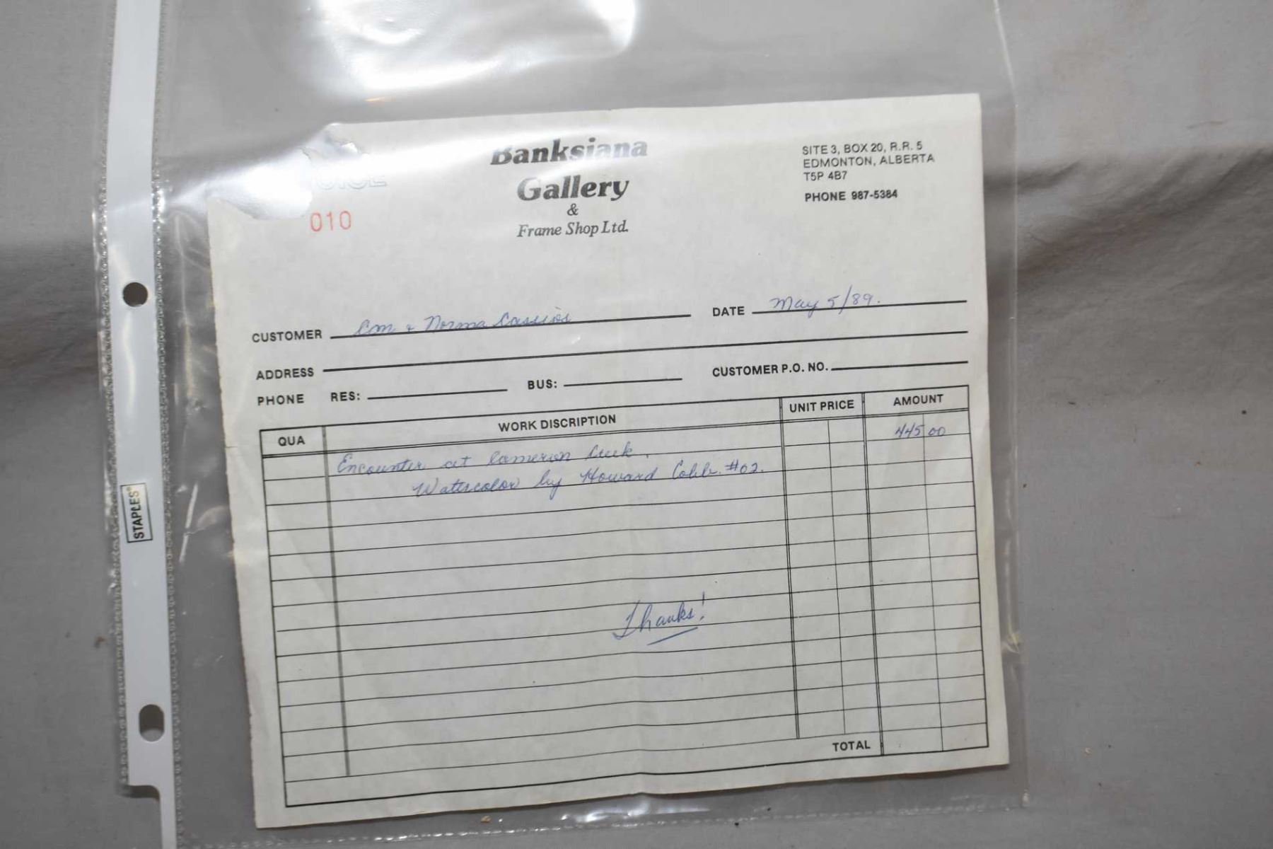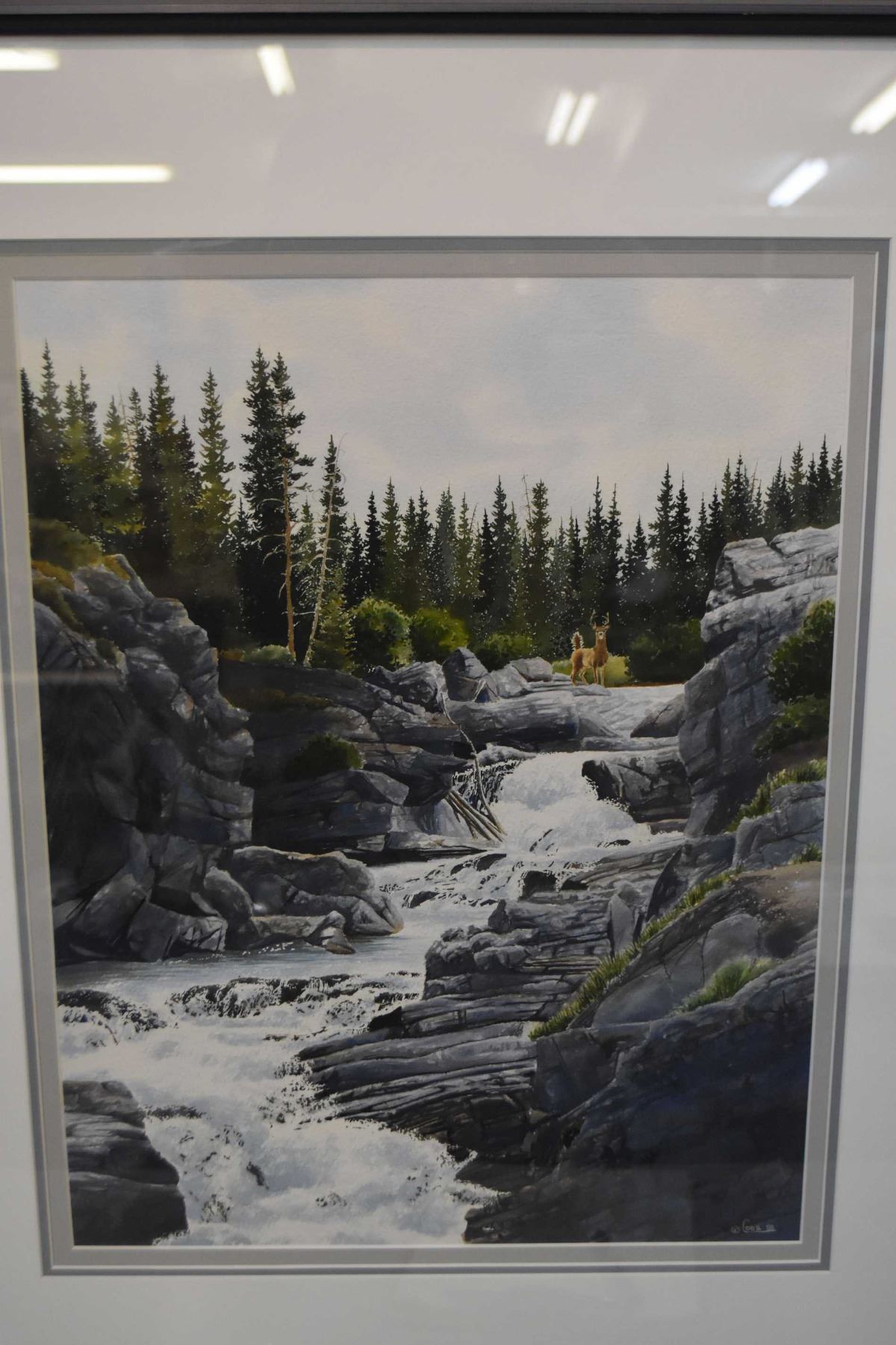 Framed original watercolour painting titled "Encounter on Cameron Creek" by artist Howard Cobb, note original Banksiana Gallery tag on verso and 1989 receipt, 18" X 14"