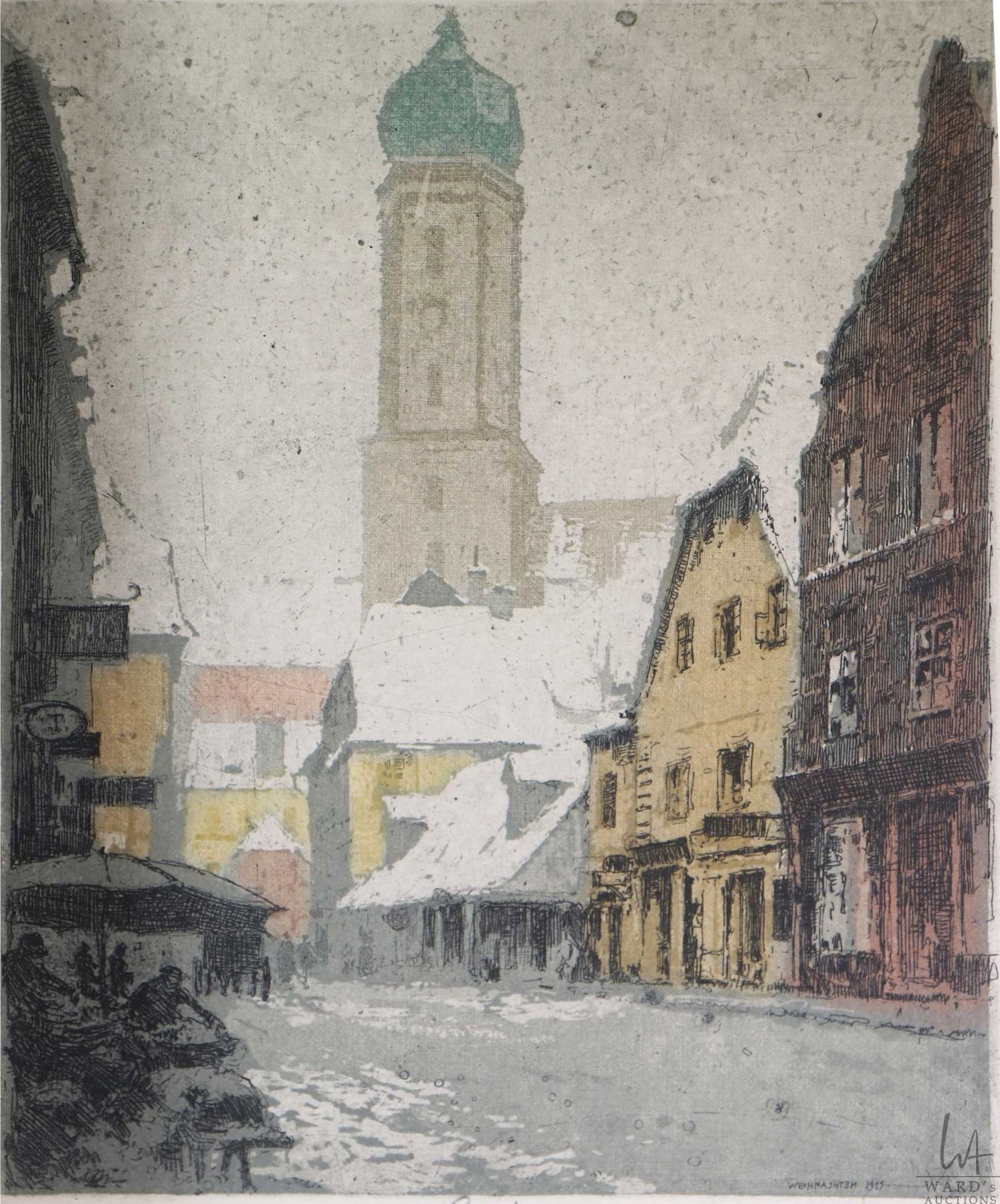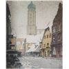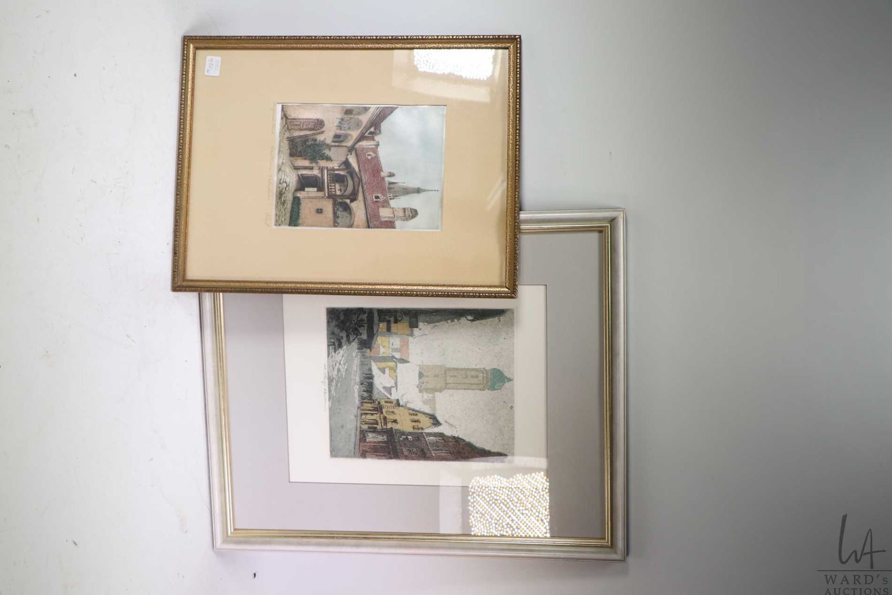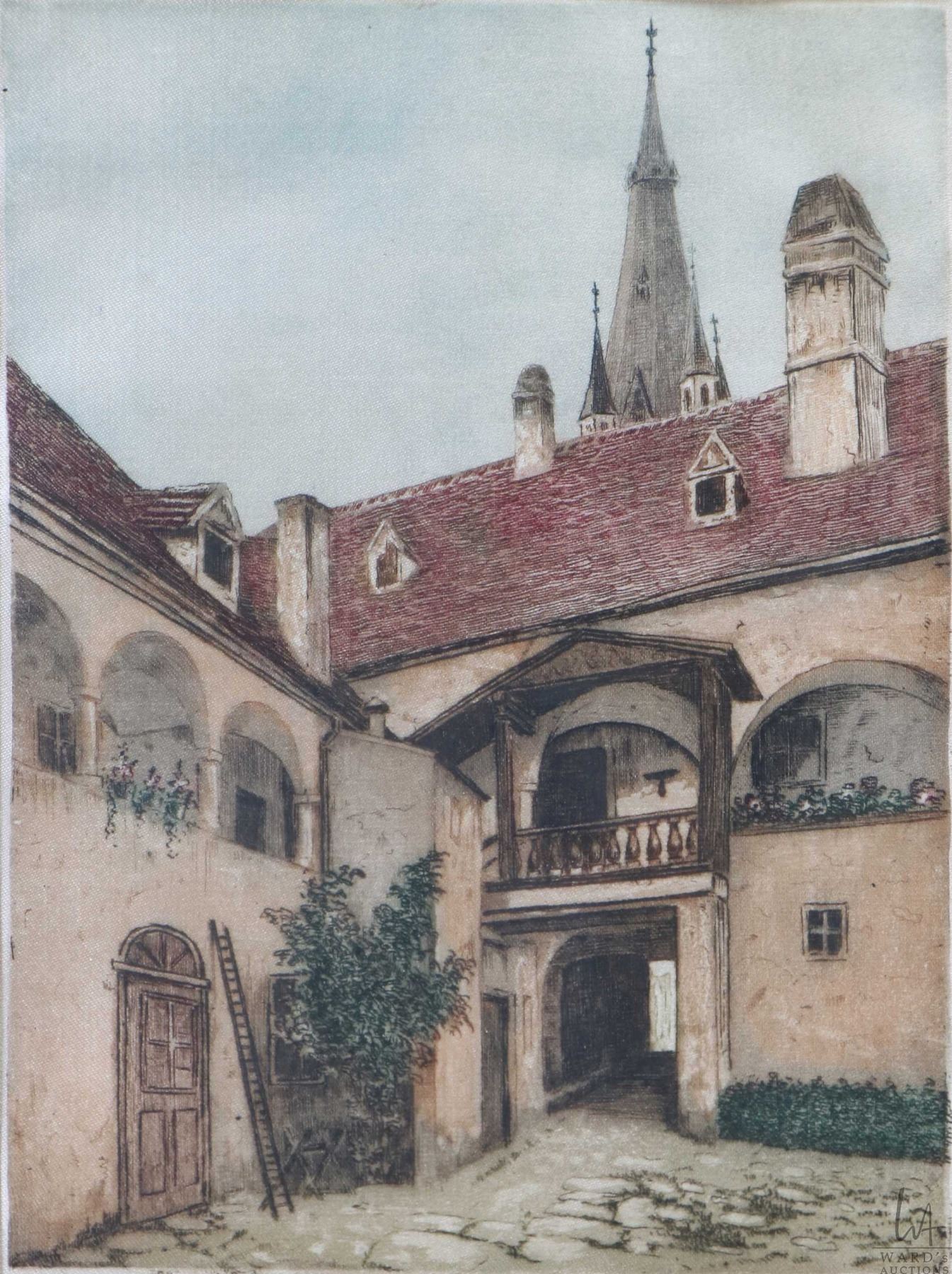 Framed painting on silk titled "Original Road, Beethoven Hohnhaus (?)" plus a coloured etching labelled on verso " Dem Jubelpaar zur Goldenen Hochzeit"