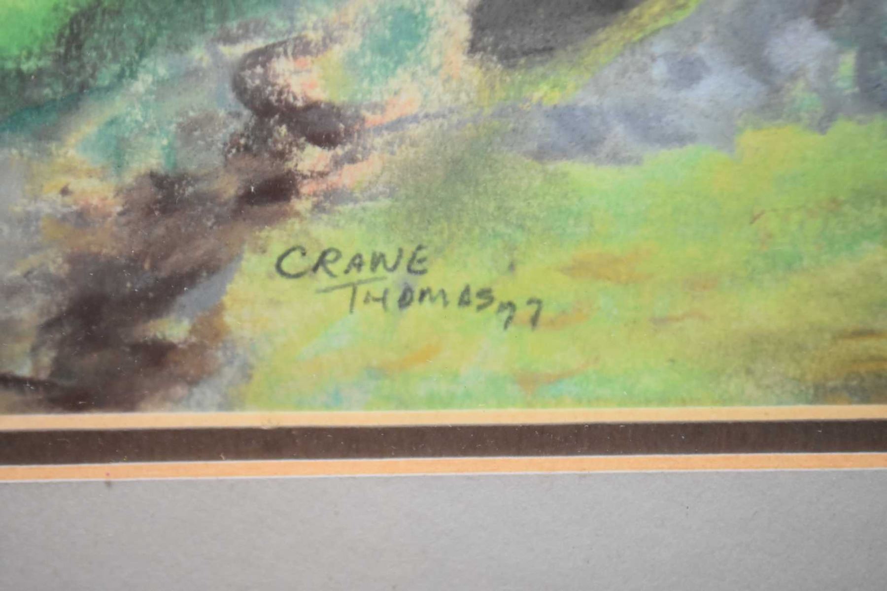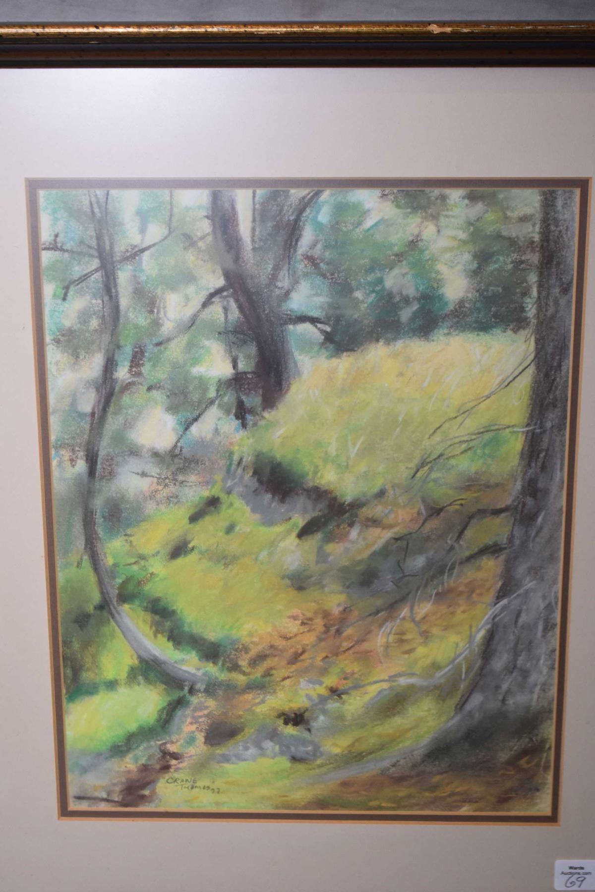 Framed pastel on paper of forest scene by artist Crane Thomas, 14" X 11" and dated 1977