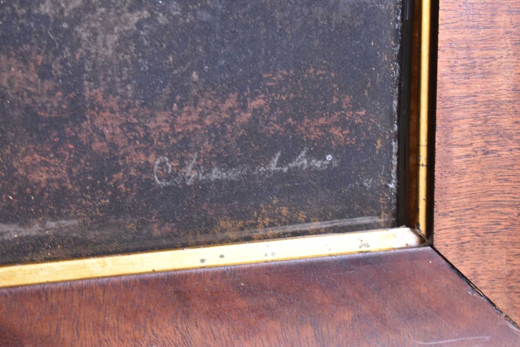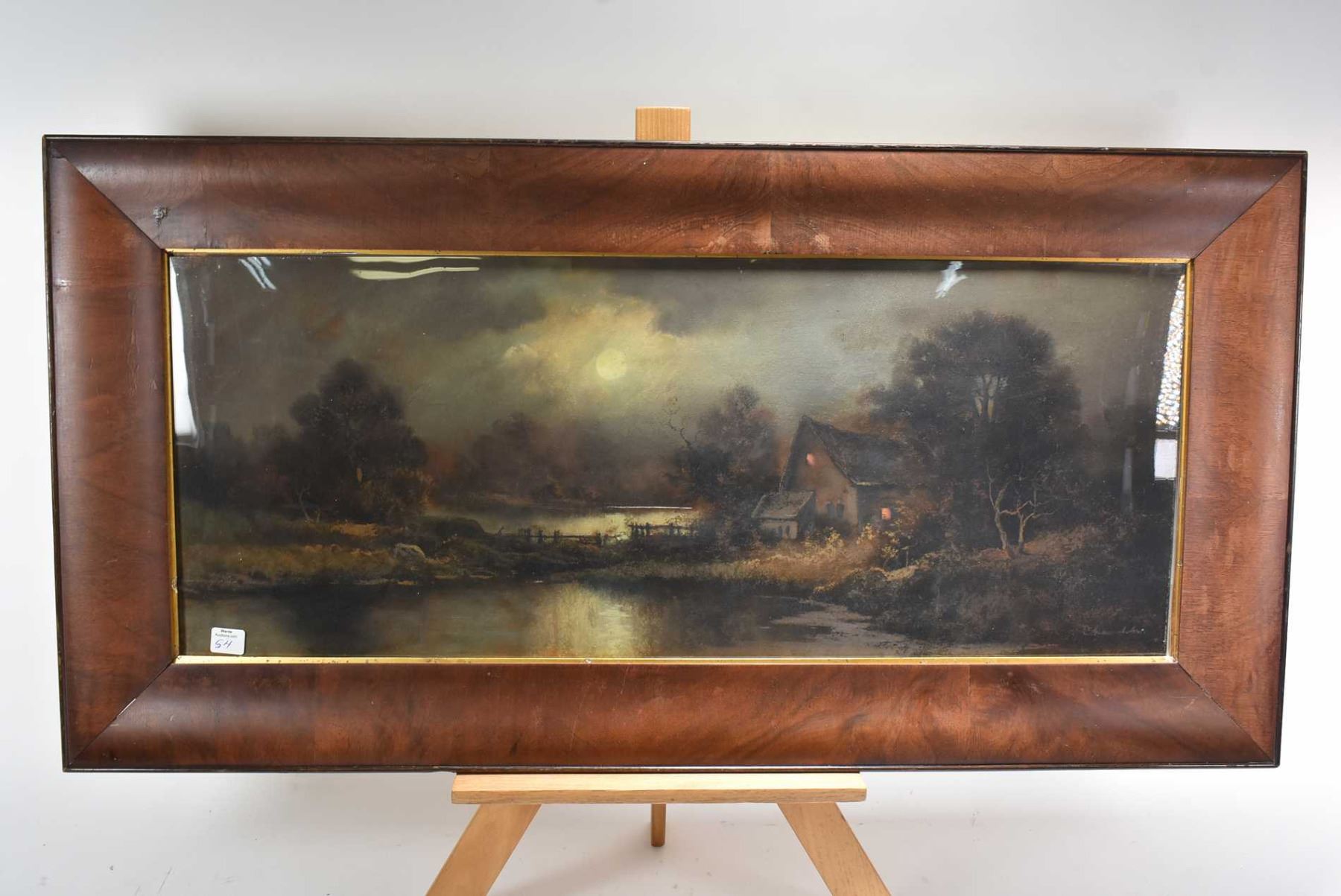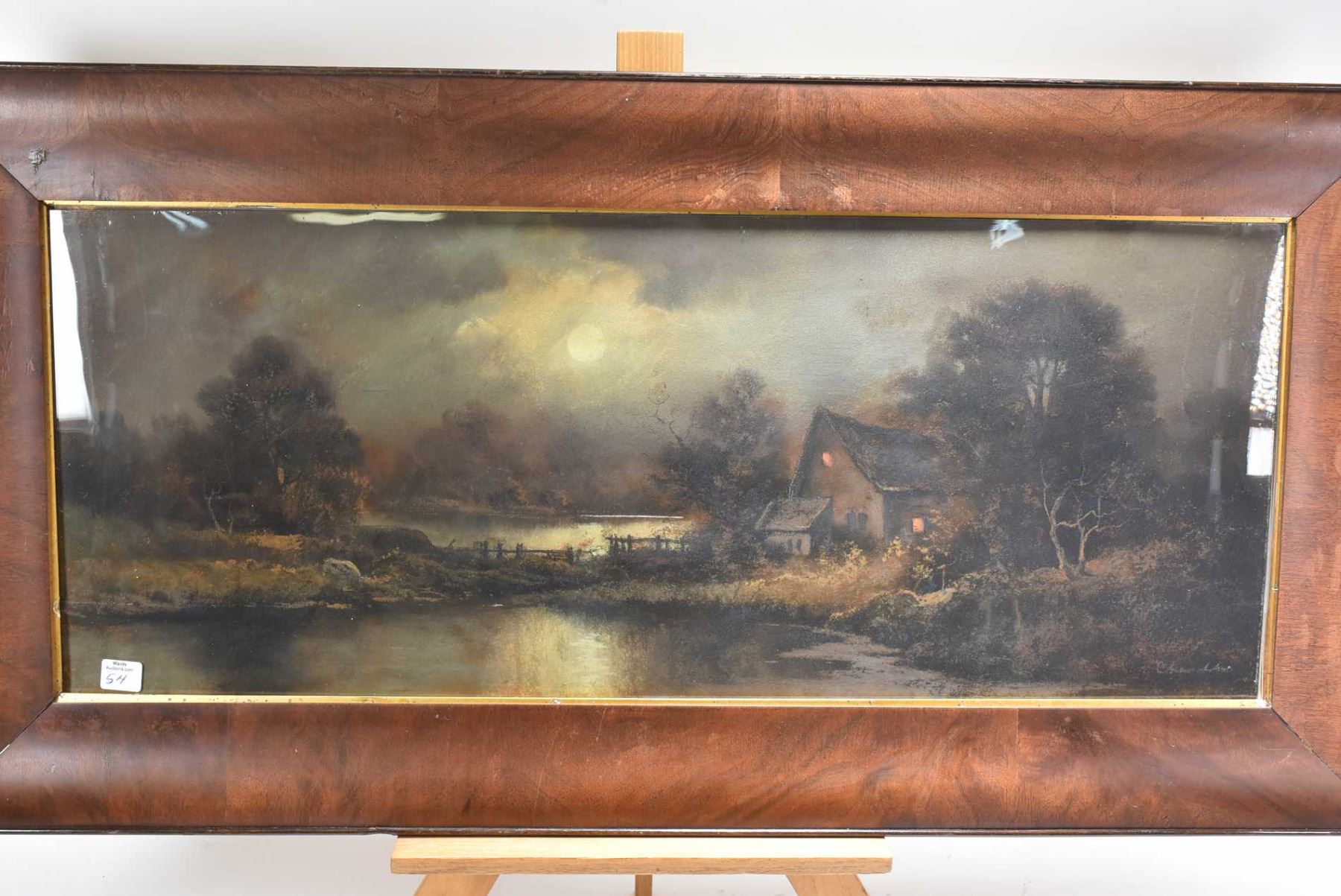 Framed pastel picture of a lakeside cottage in the moonlight by artist Chandler, 12" X 30"