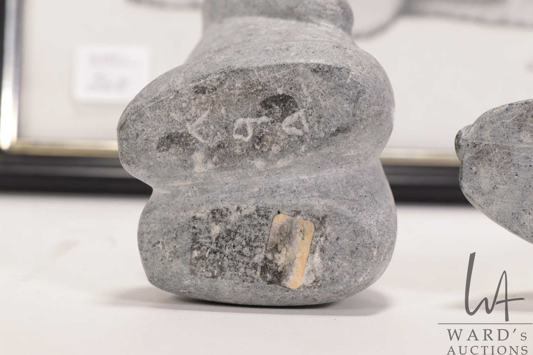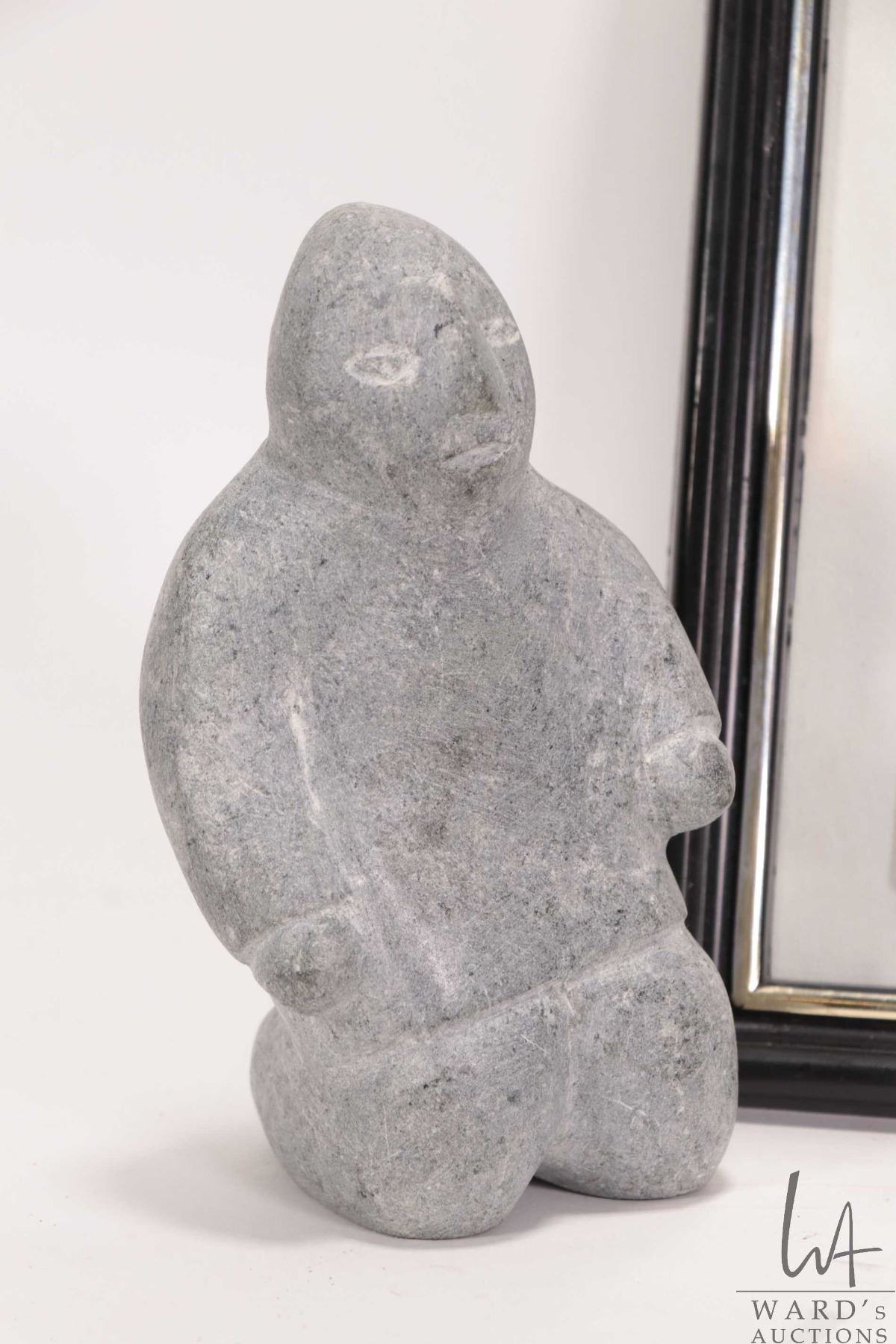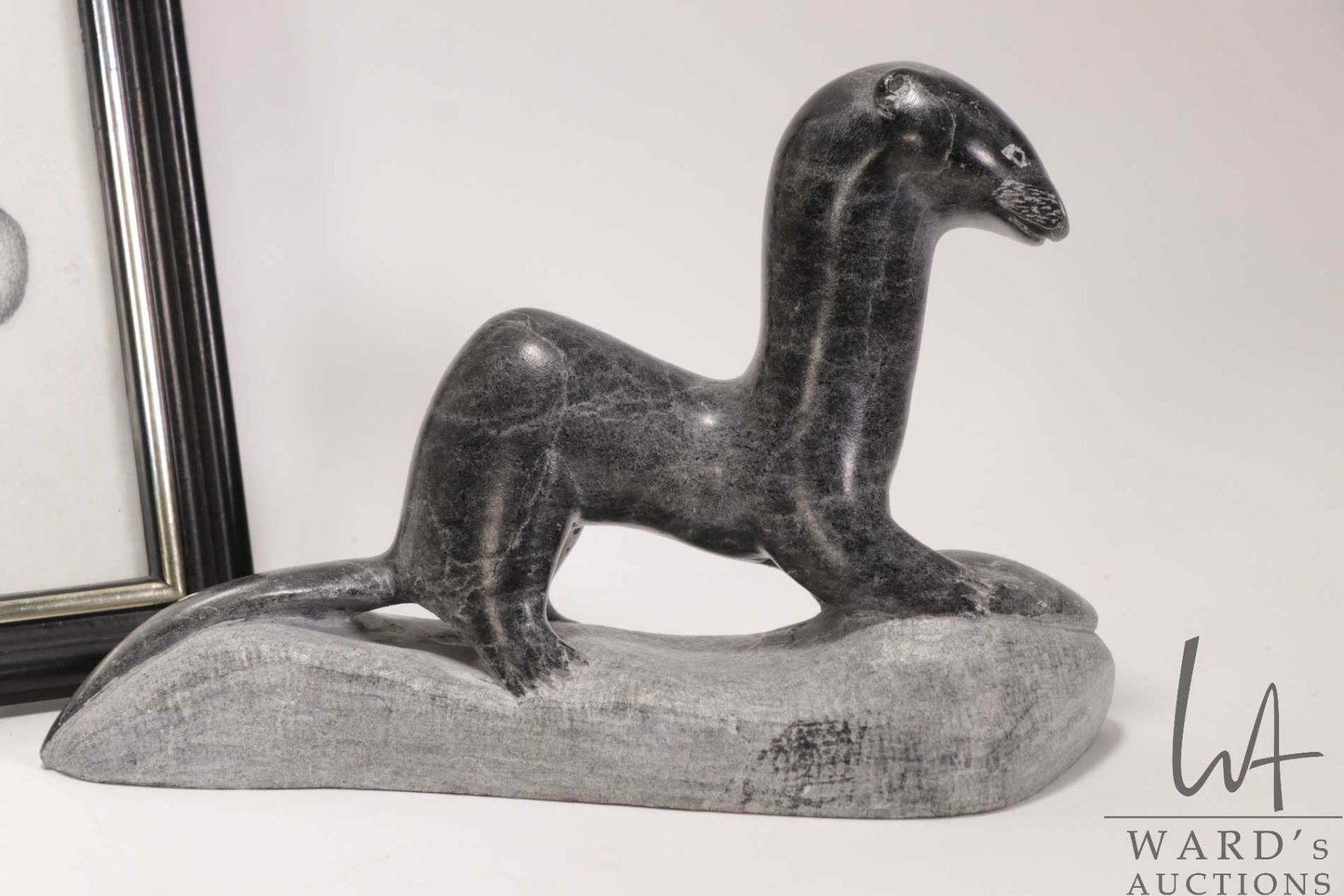 Framed pencil drawing of a pair of mukluk, signed by artist Wilfred Canadian 7 1/2" X 9 1/2" and two soapstones including signed kneeling man 6" in height and an artist signed otter with original Canadian Eskimo Art label