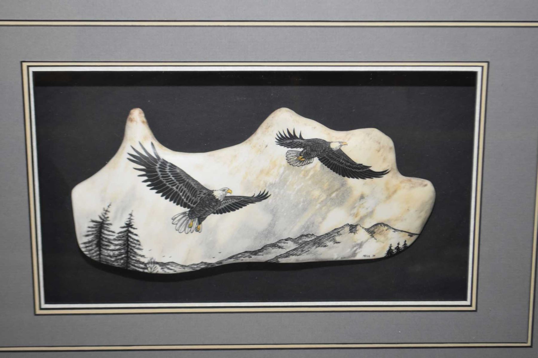 Framed scrimshaw on antler of two eagles in flight signed by artist Masse '00, overall dimensions in