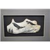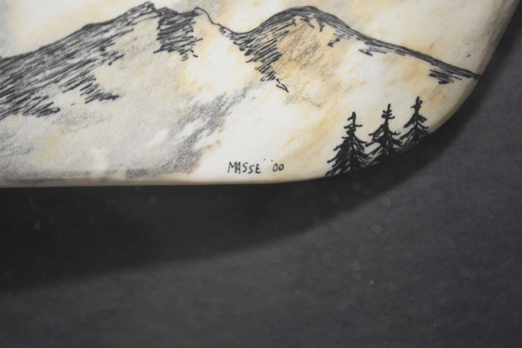Framed scrimshaw on antler of two eagles in flight signed by artist Masse '00, overall dimensions including frame 14" X 22"