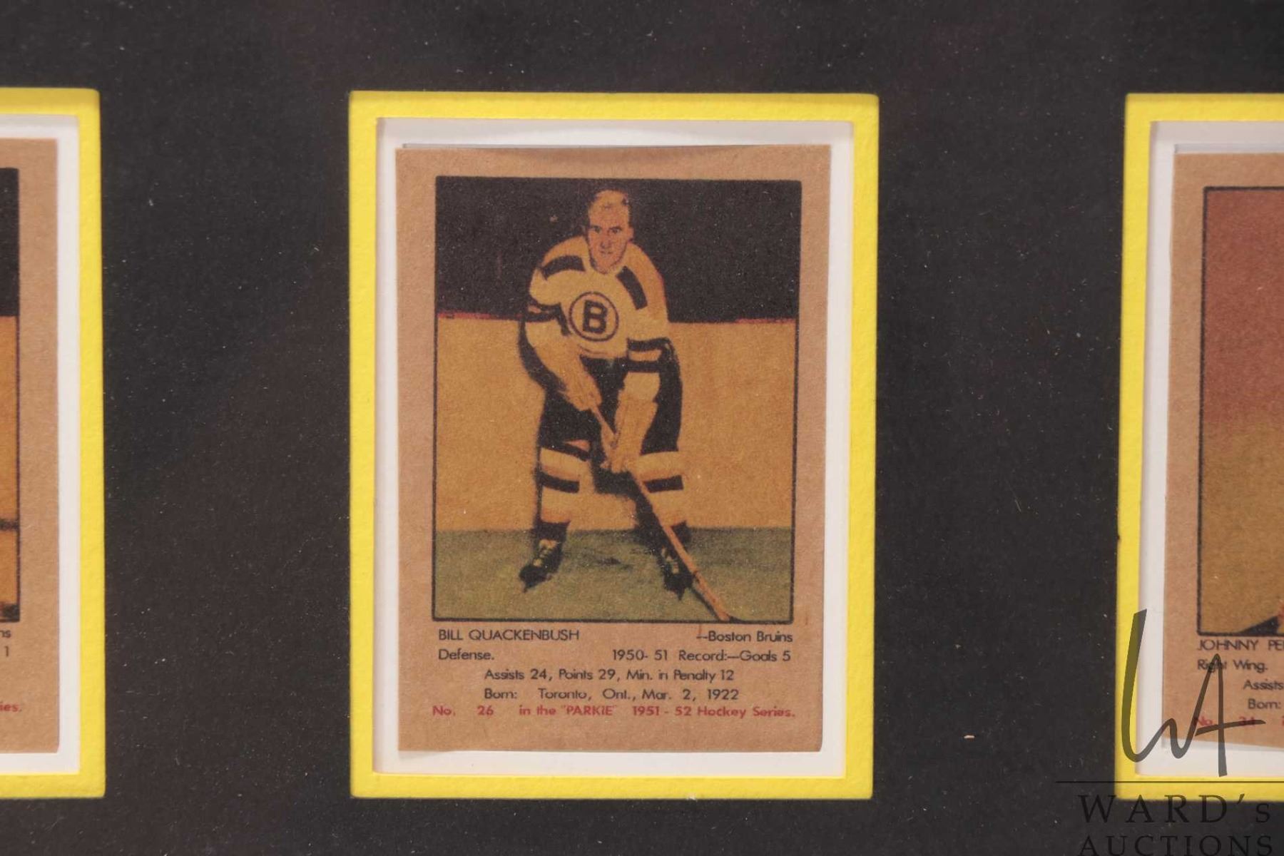 Framed selection of ten 1950-51 Boston Bruins collector trading cards, overall dimensions including frame 13" X 16". Cards appear to be glued or dry mounted to backer. Note: Artwork and framed pieces cannot be insured and many are too large to ship. Local pickup