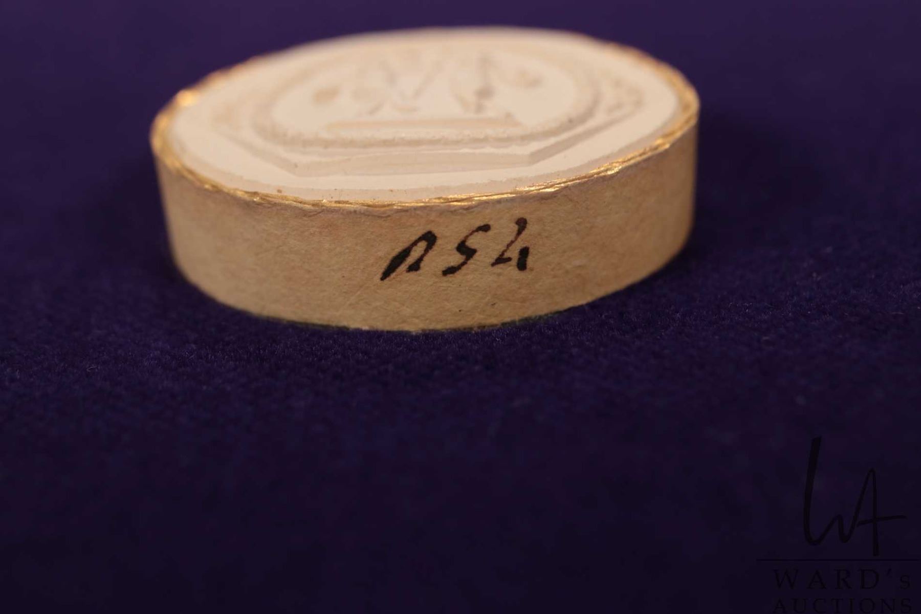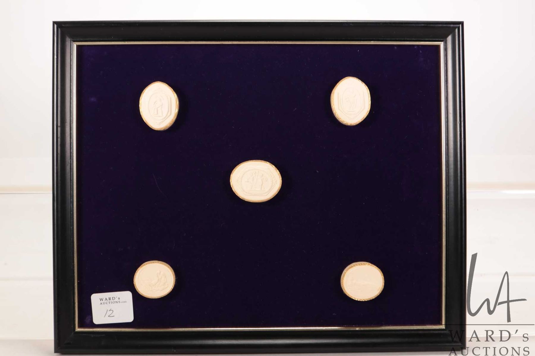Framed set of fiveTiberian Designs plaster intaglios, each with a neoclassical design and each framed in antiqued paper with gilt wrapped edge, each approximately 1" - 1 3/16", overall dimension including frame 8" X 10"