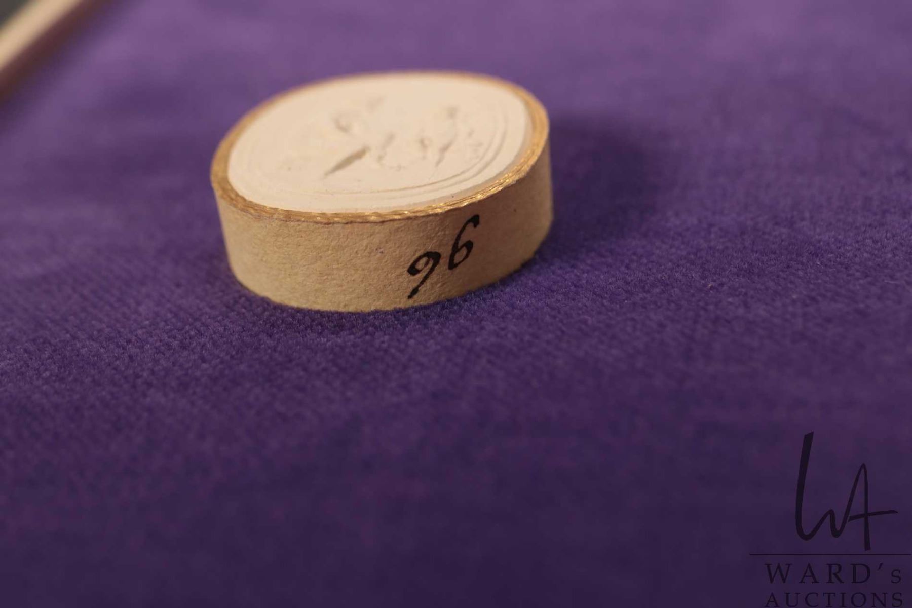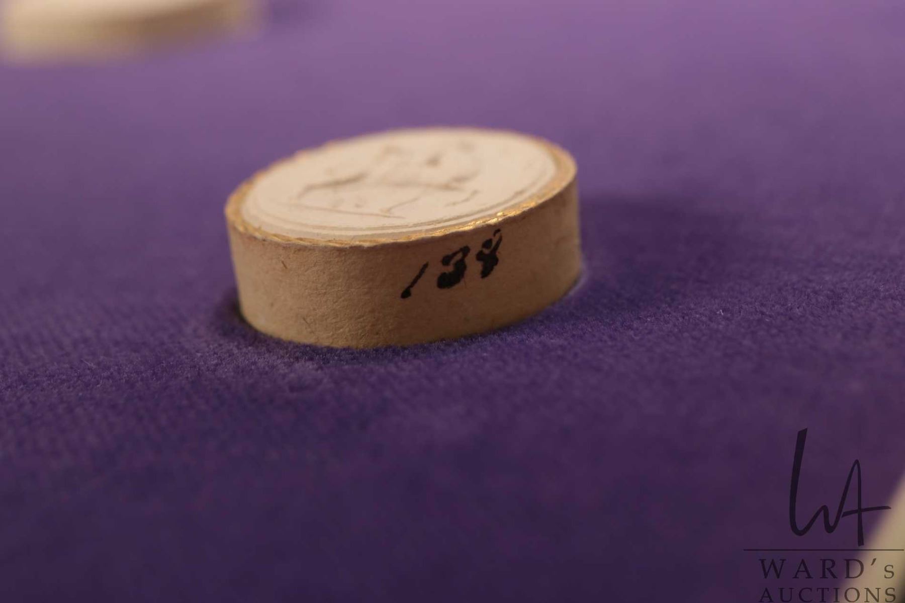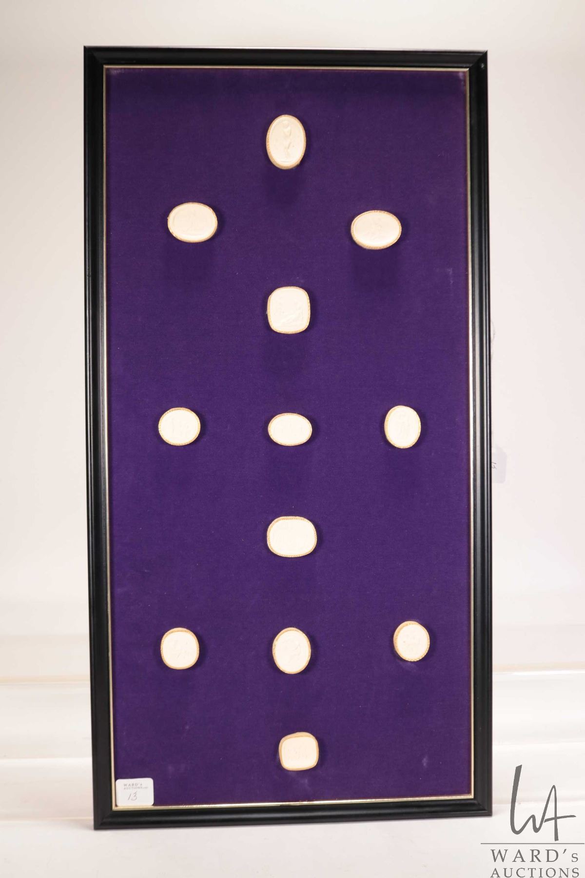 Framed set of twelve Tiberian Designs plaster intaglios, each with a neoclassical design and each fr