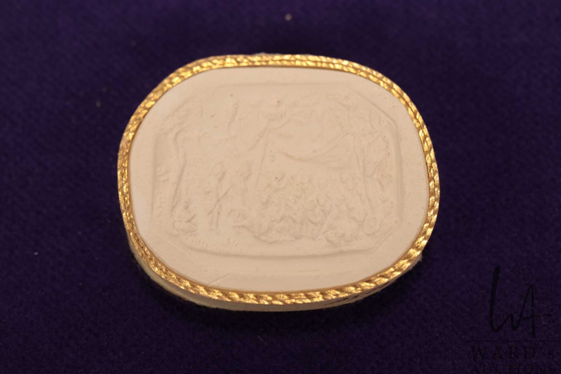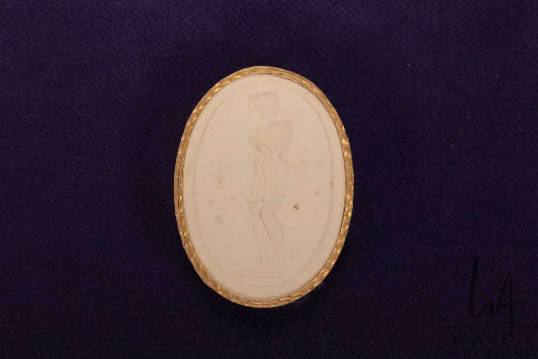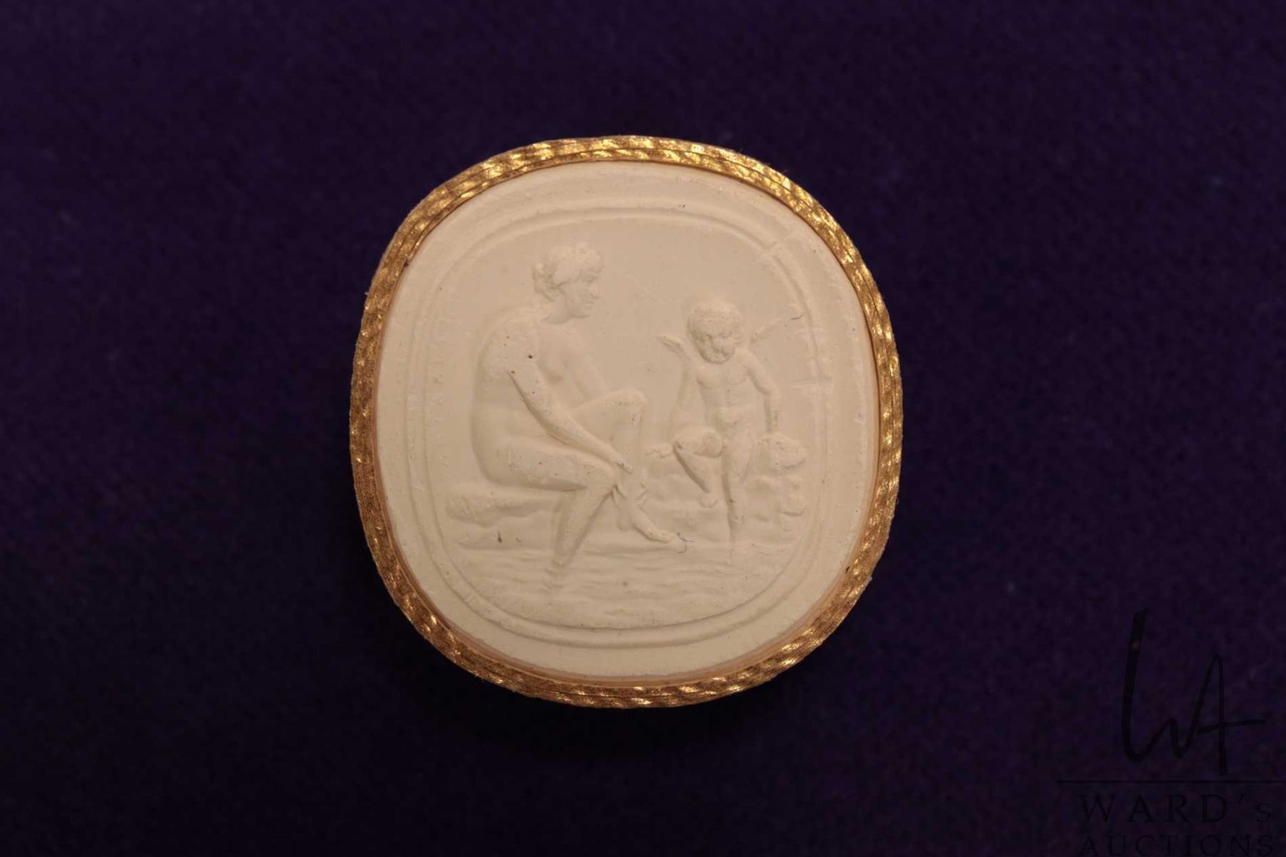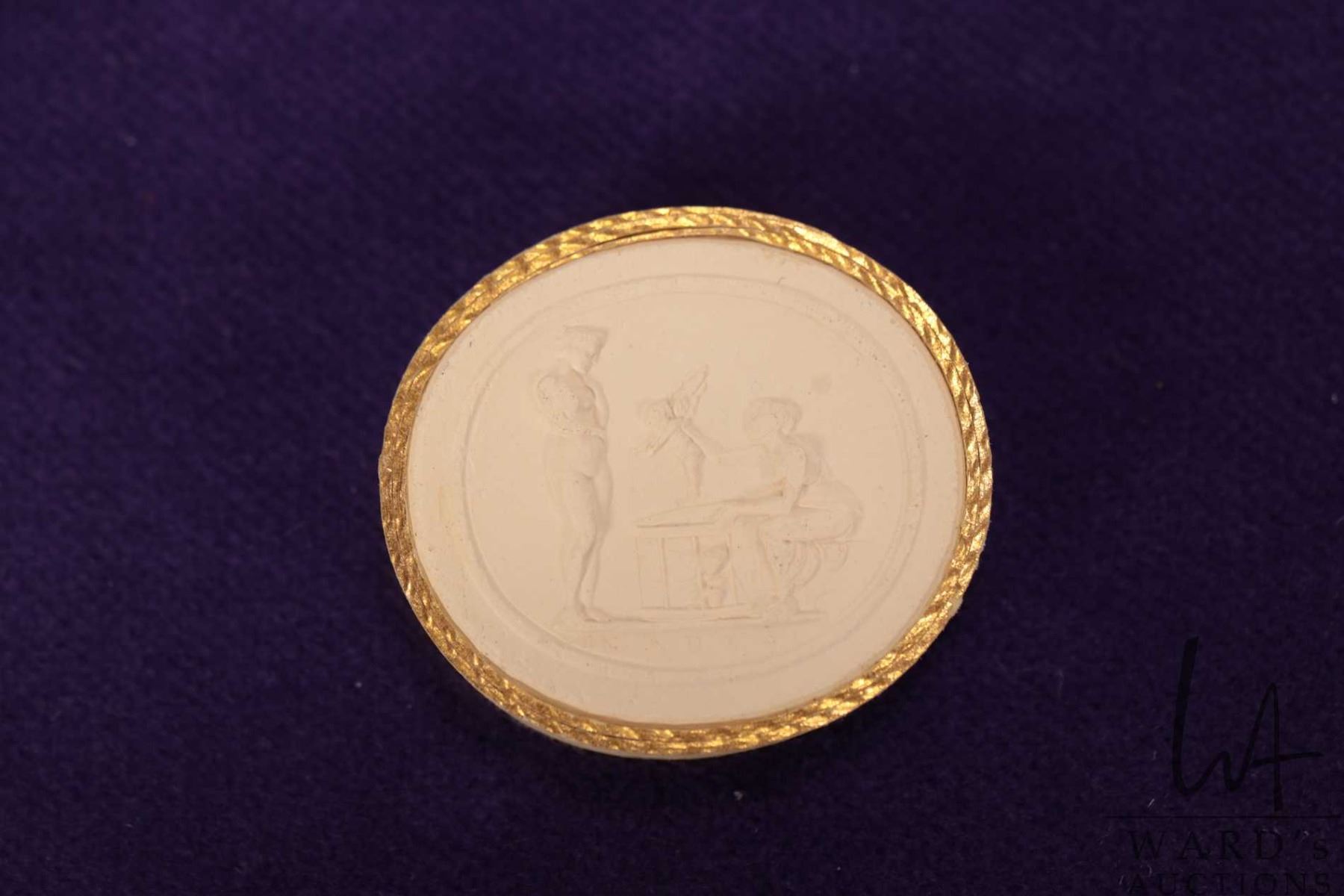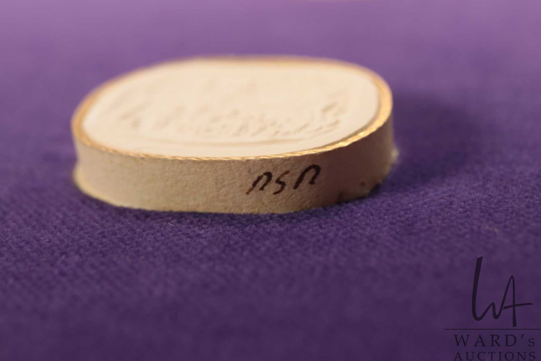 Framed set of twelve Tiberian Designs plaster intaglios, each with a neoclassical design and each framed in antiqued paper with gilt wrapped edge, each approximately 1" 2", overall dimension including frame 21" X 10 3/4"