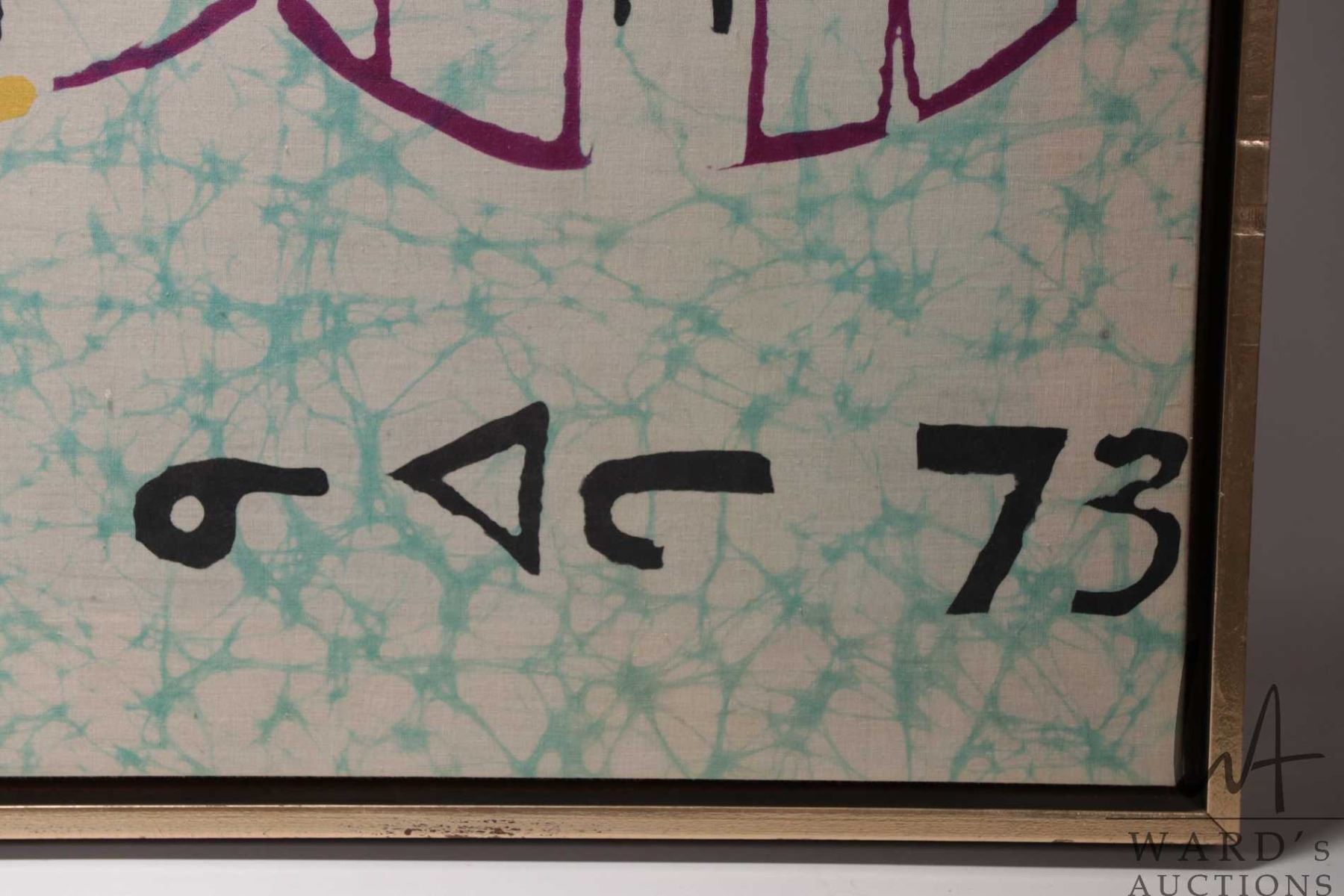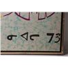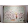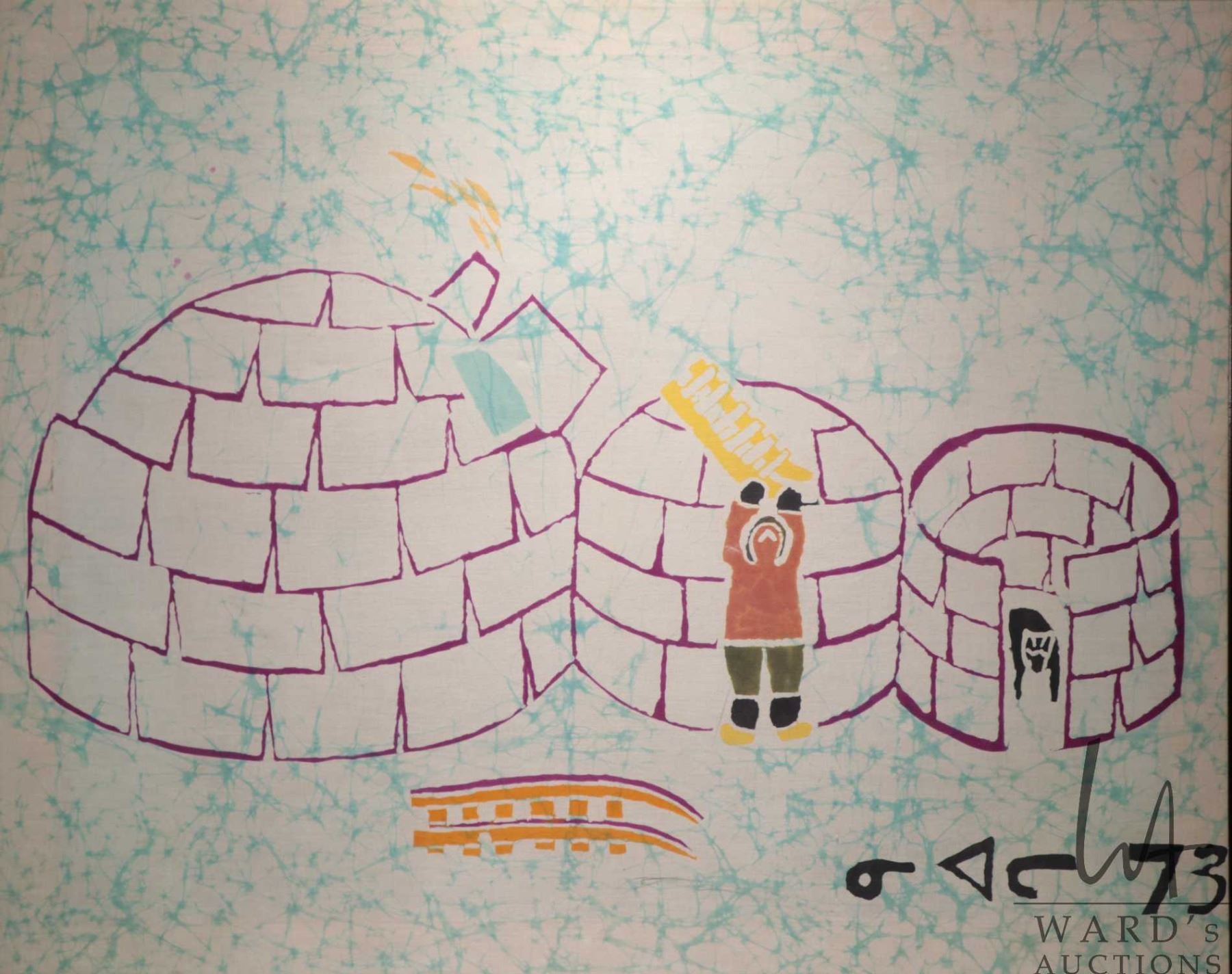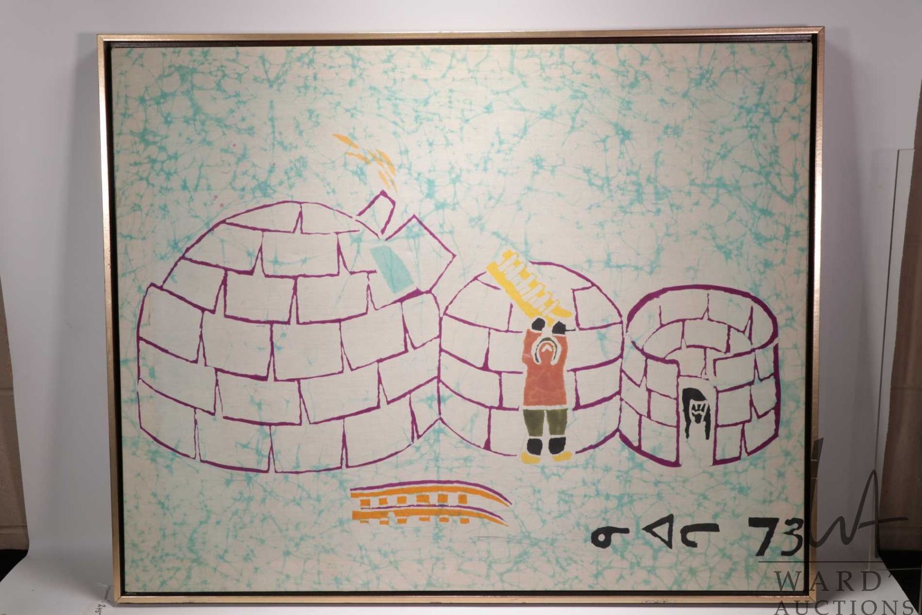 Framed silk screen on fabric "Building Igloos" 1973, signed in syllabics, 27" X 34". Note: Artwork cannot be insured and is often too large to ship. Local pickup.