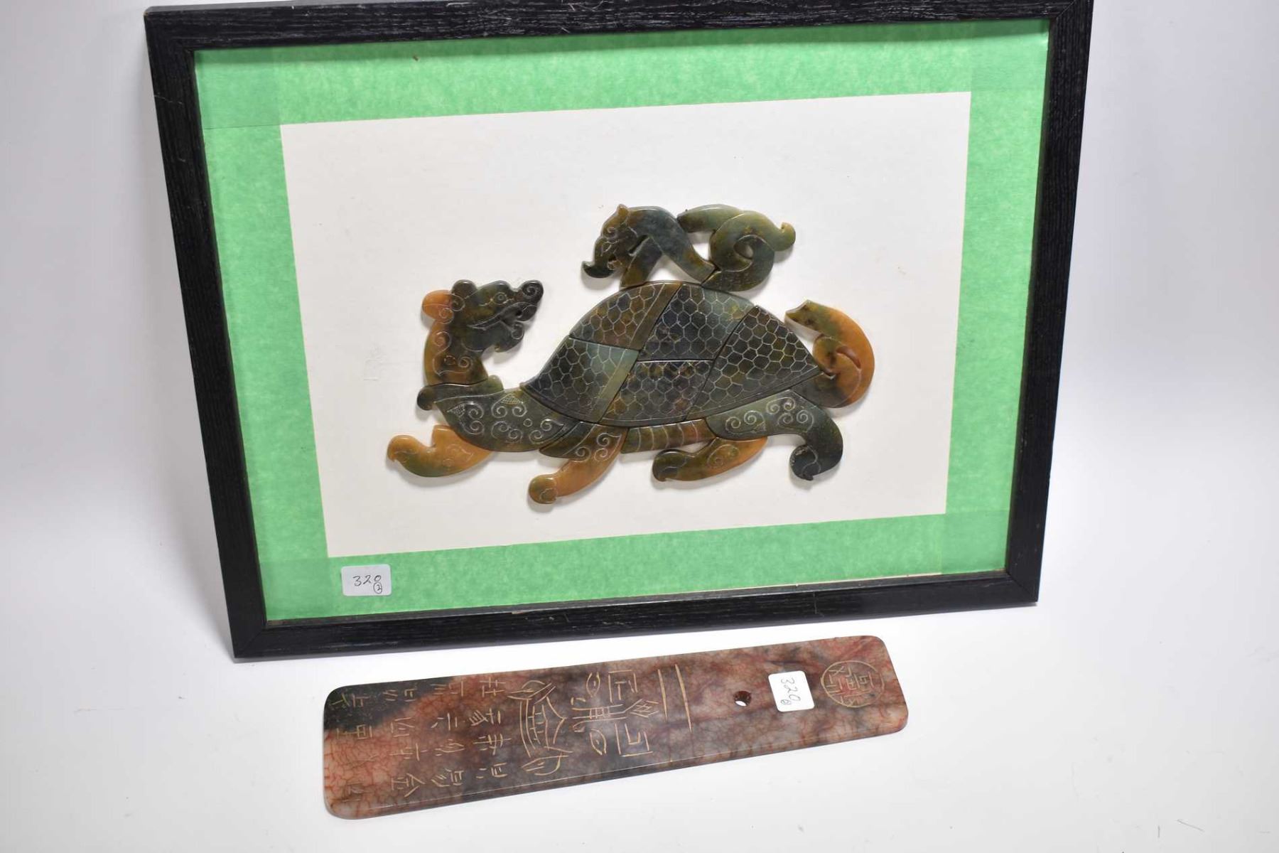 Framed spinach jade mosaic "Turtle Dragon" overall dimensions 13" X 17" and an Oriental calligraphic blessing pendant 11 1/2" in length