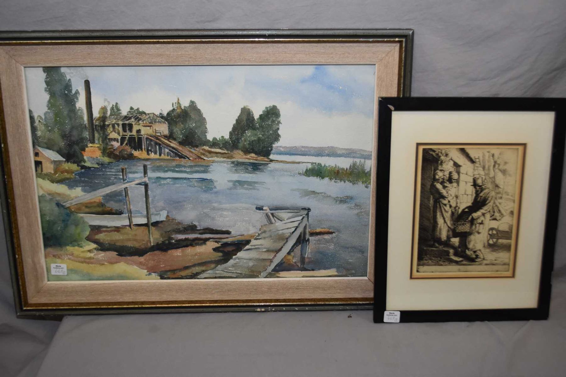 Framed vintage William Stand etching "Fruit Seller" and an unsigned watercolour of a dock scene, 13 1/2" X 20 1/2"