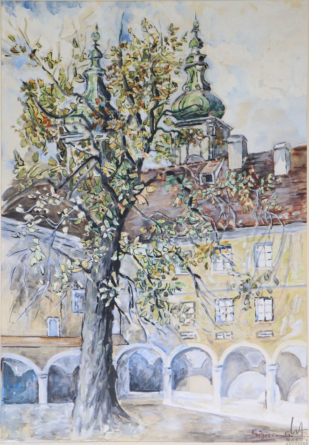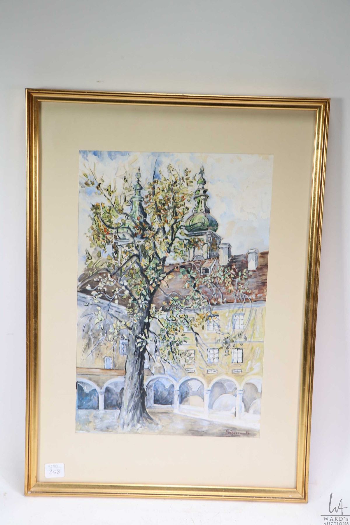 Framed watercolour/gouache painting of a Russian courtyard scene signed by artist 15" X 10"