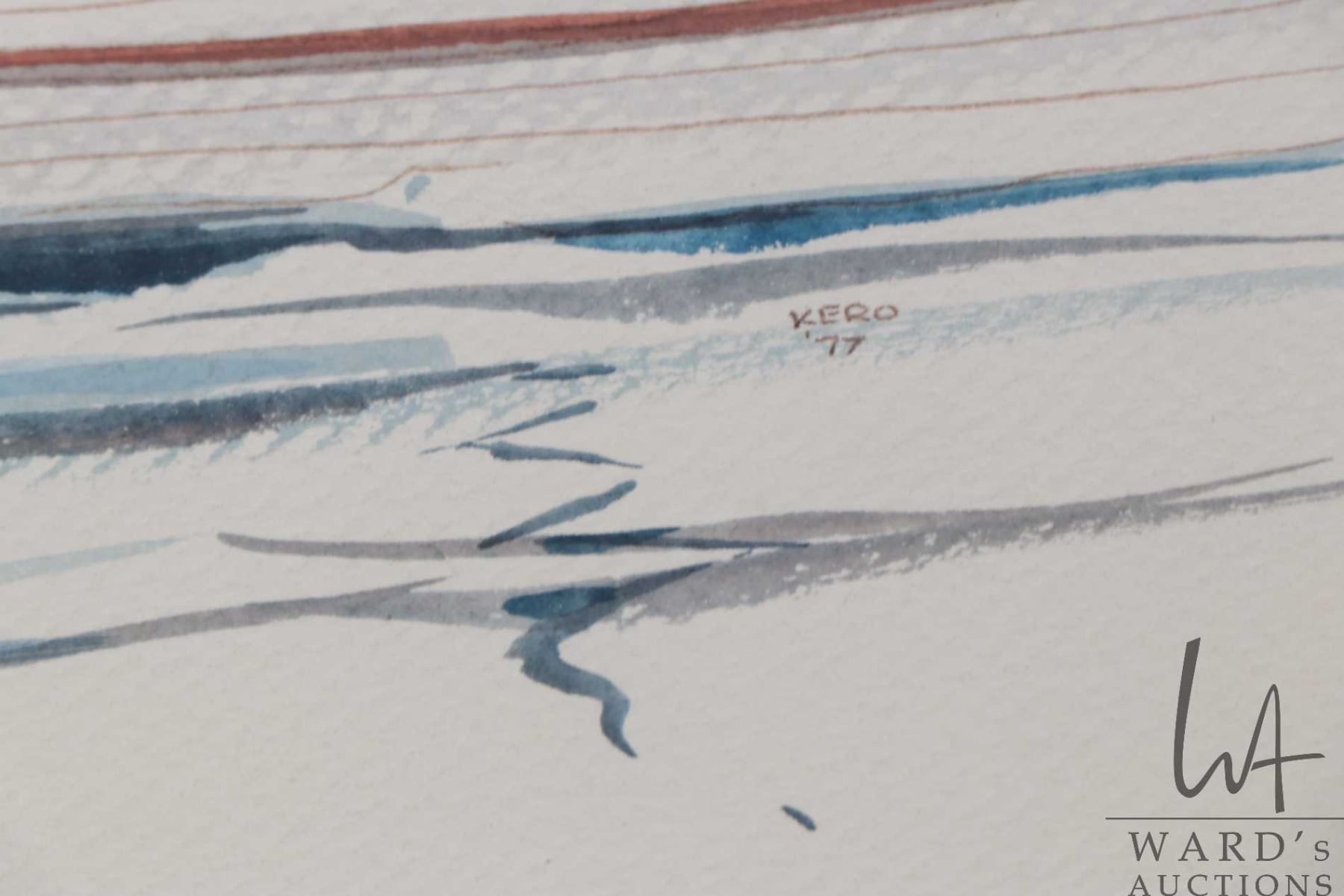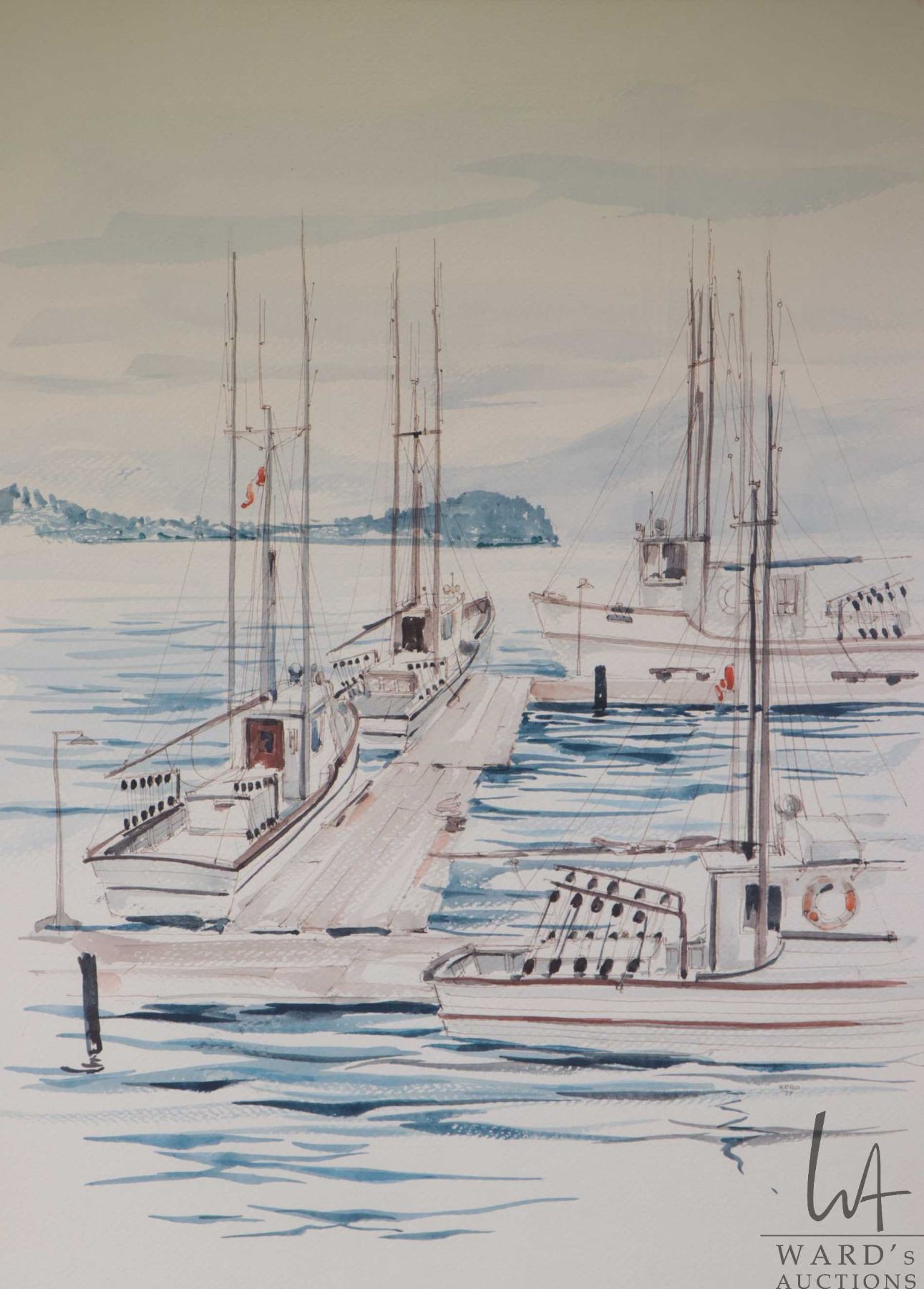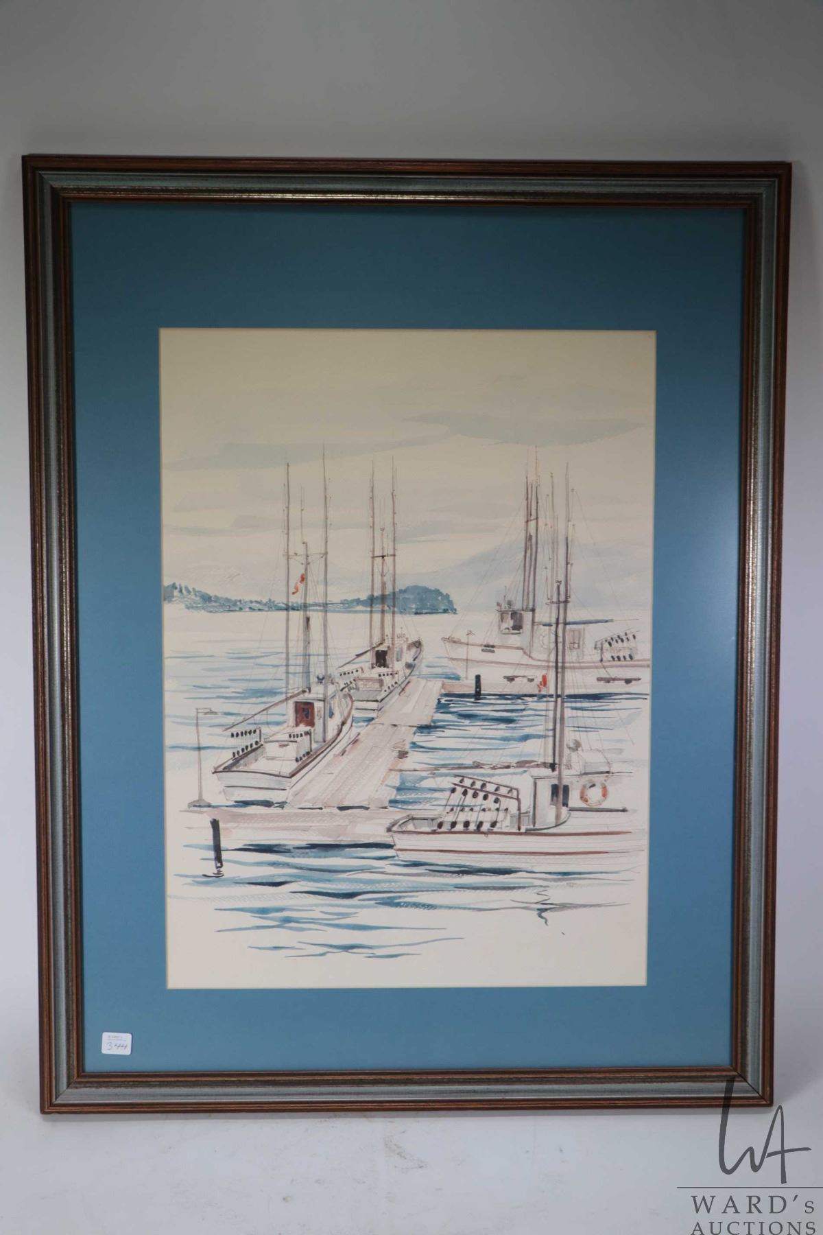 Framed watercolour painting labeled on verso "Tillicum Bay Marina 1977" by artist Melvin Kero, 23" X 16"