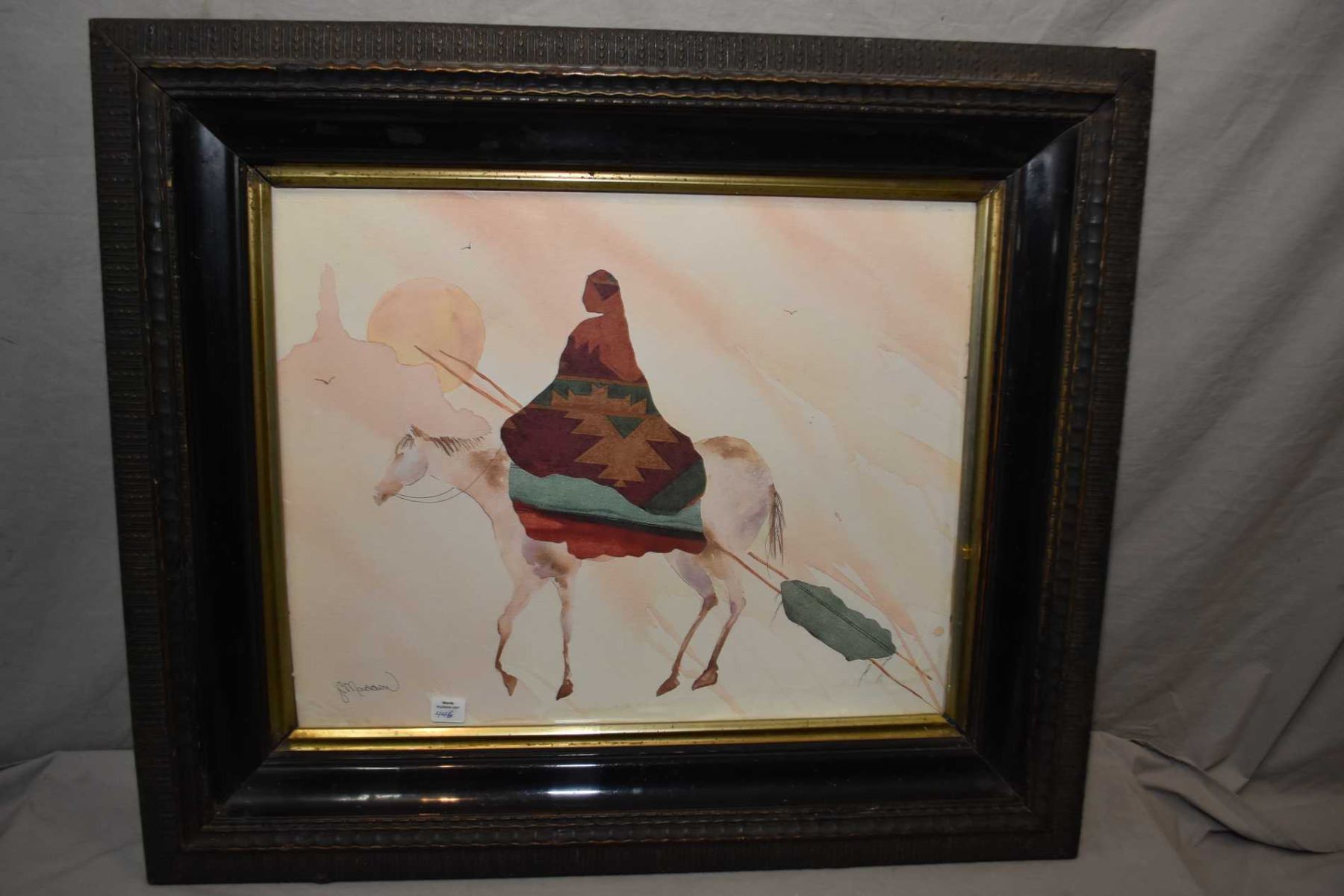 Framed watercolour painting of a Southwestern lady on horse signed by artist Madden (?) 16" X 20"