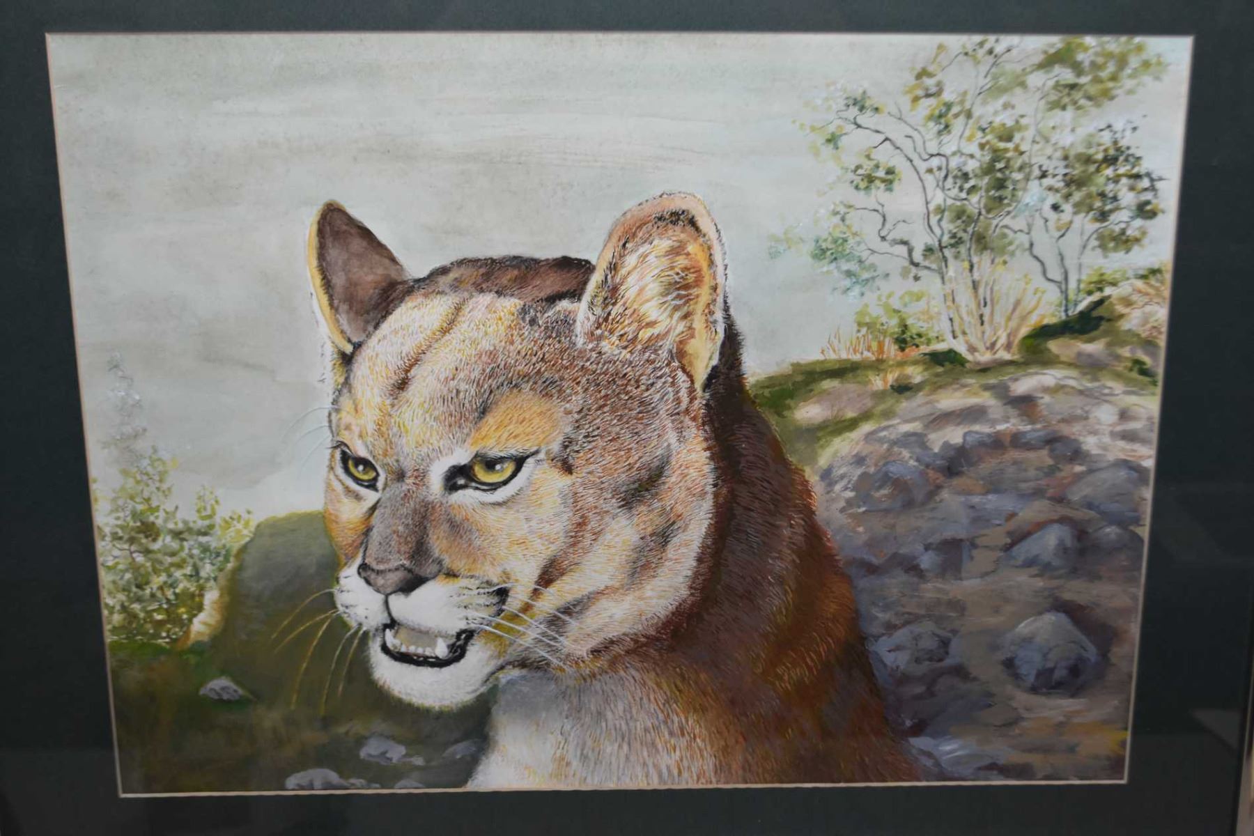 Framed watercolour painting of a cougar signed on verso by artist A.E. Tyler, 13" X 18"