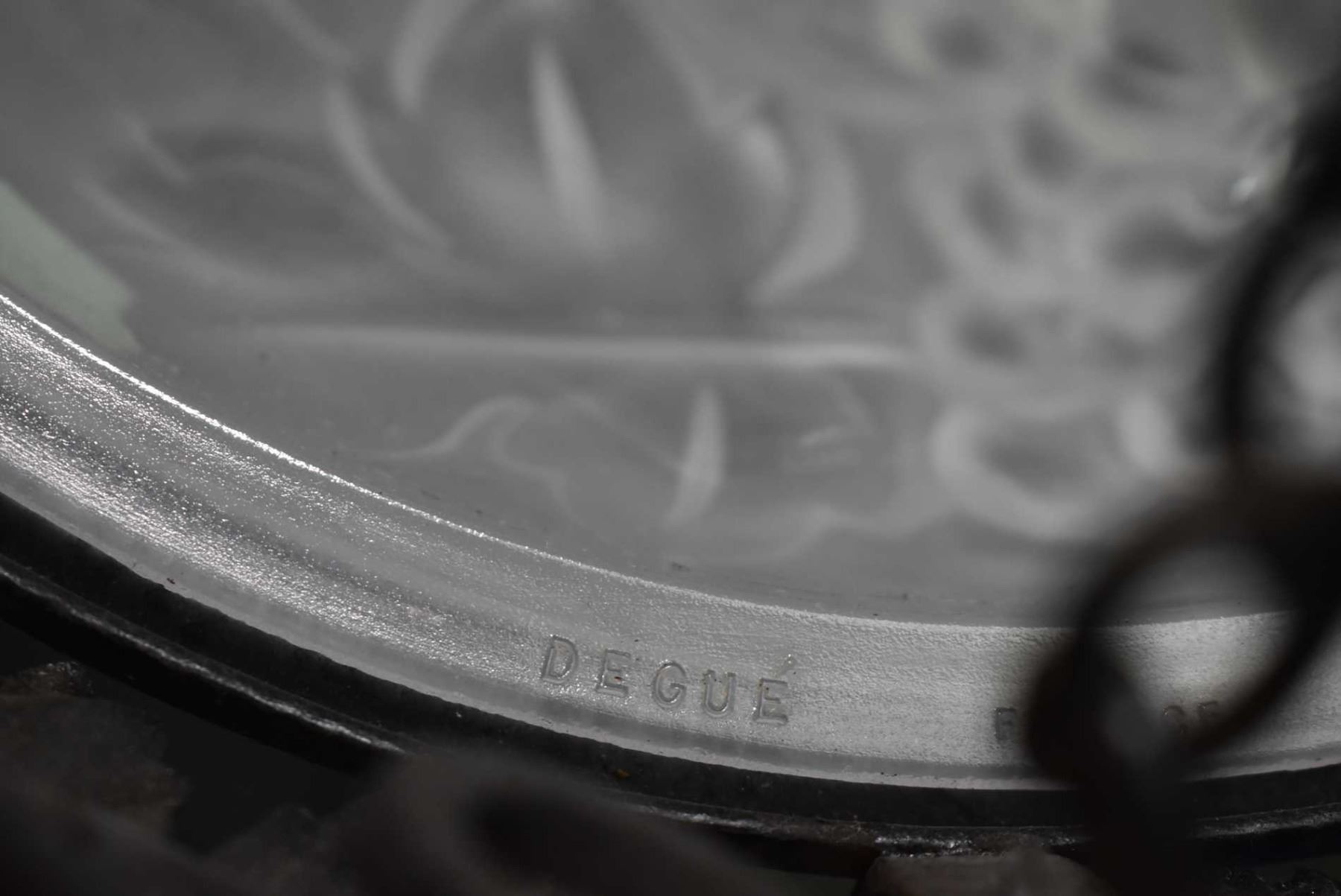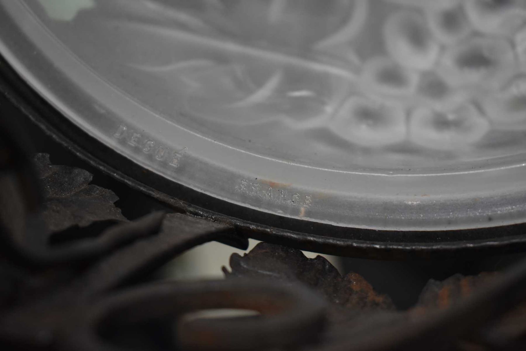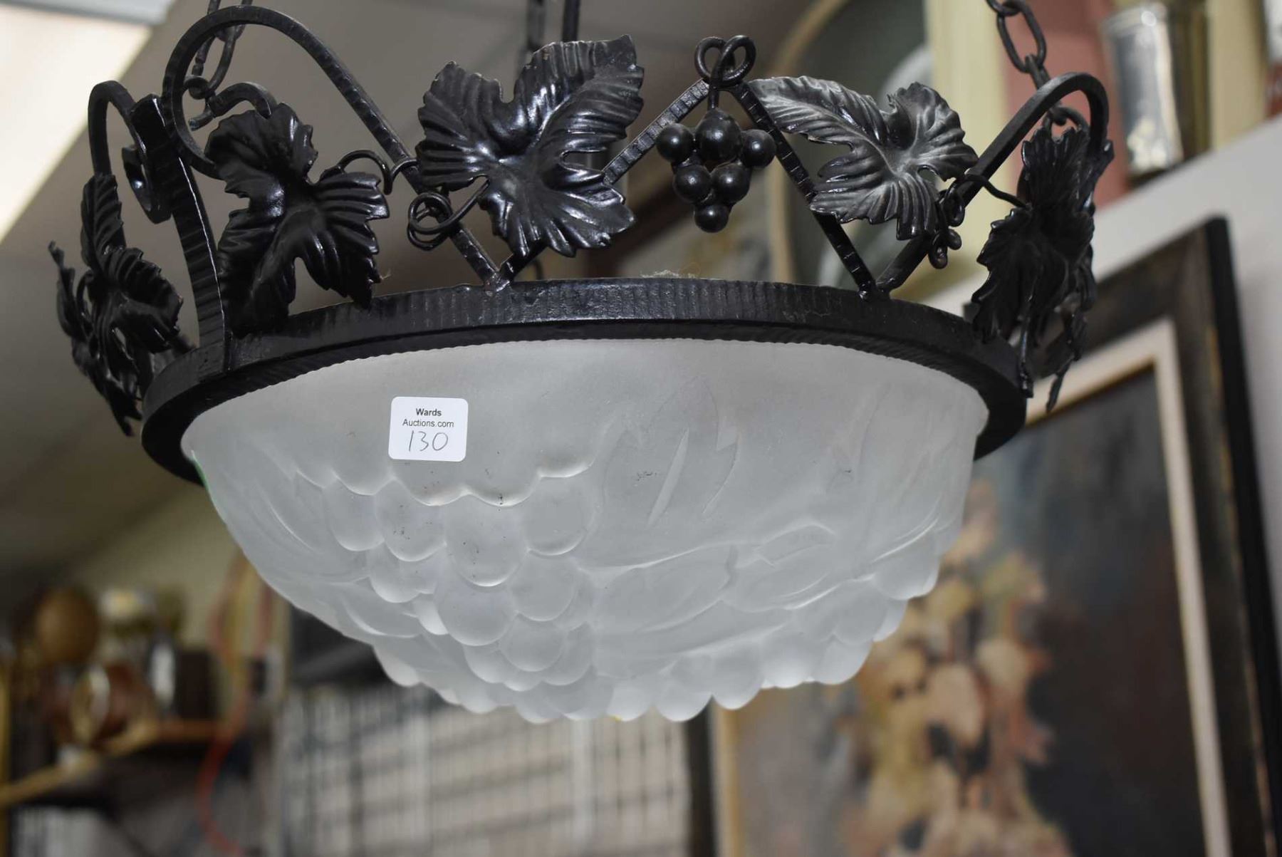 French art deco wrought iron ceiling fixture with frosted glass Degue grape and leaf shade