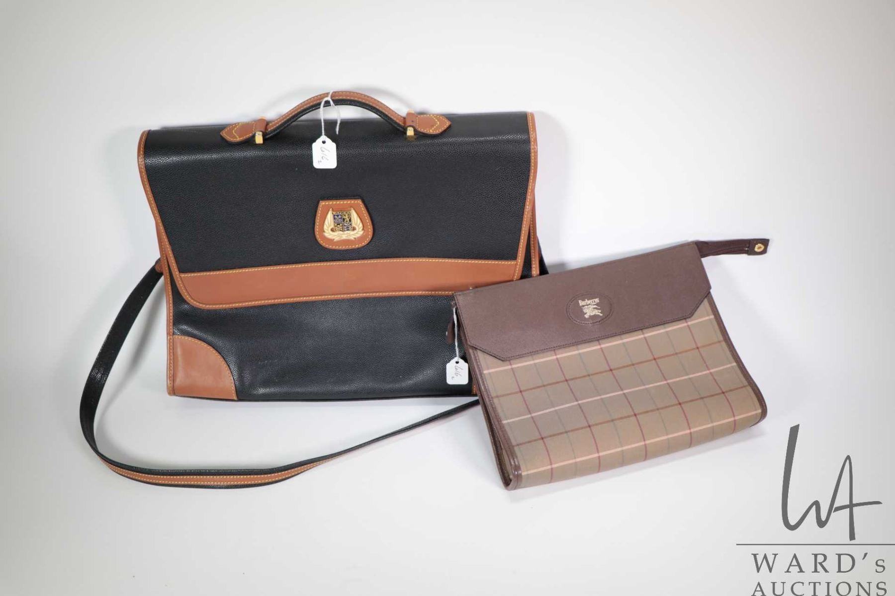 French made Lancel messenger bag with camel coloured leather accents and a Burberrys zippered pouch