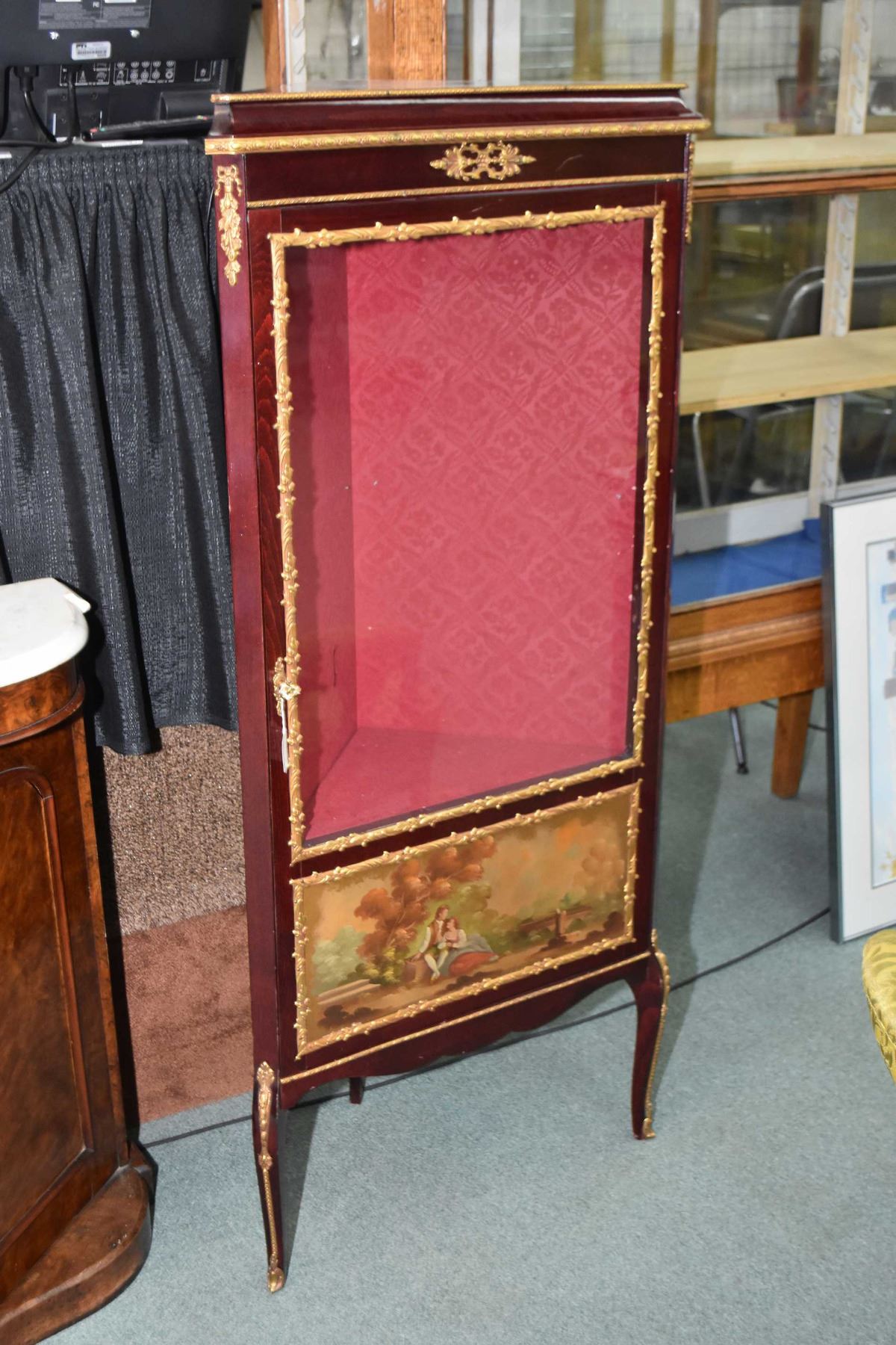 French style single door corner display cabinet with hand painted lower panel, attached decorative ormolu and damask lined interior, 57" in height