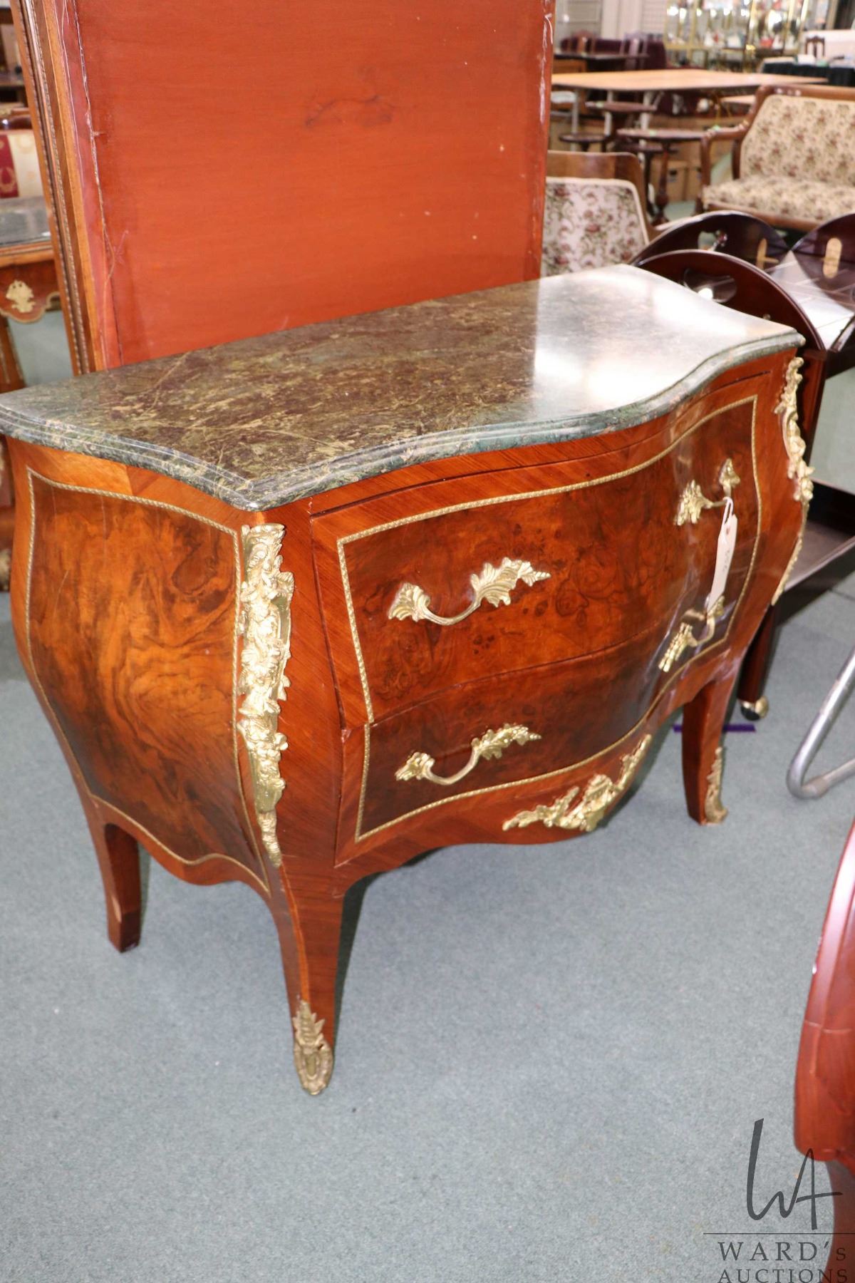 French style two drawer bombe cabinet with decorative attached ormolu and marble top, 32" high X 40" and 18" deep