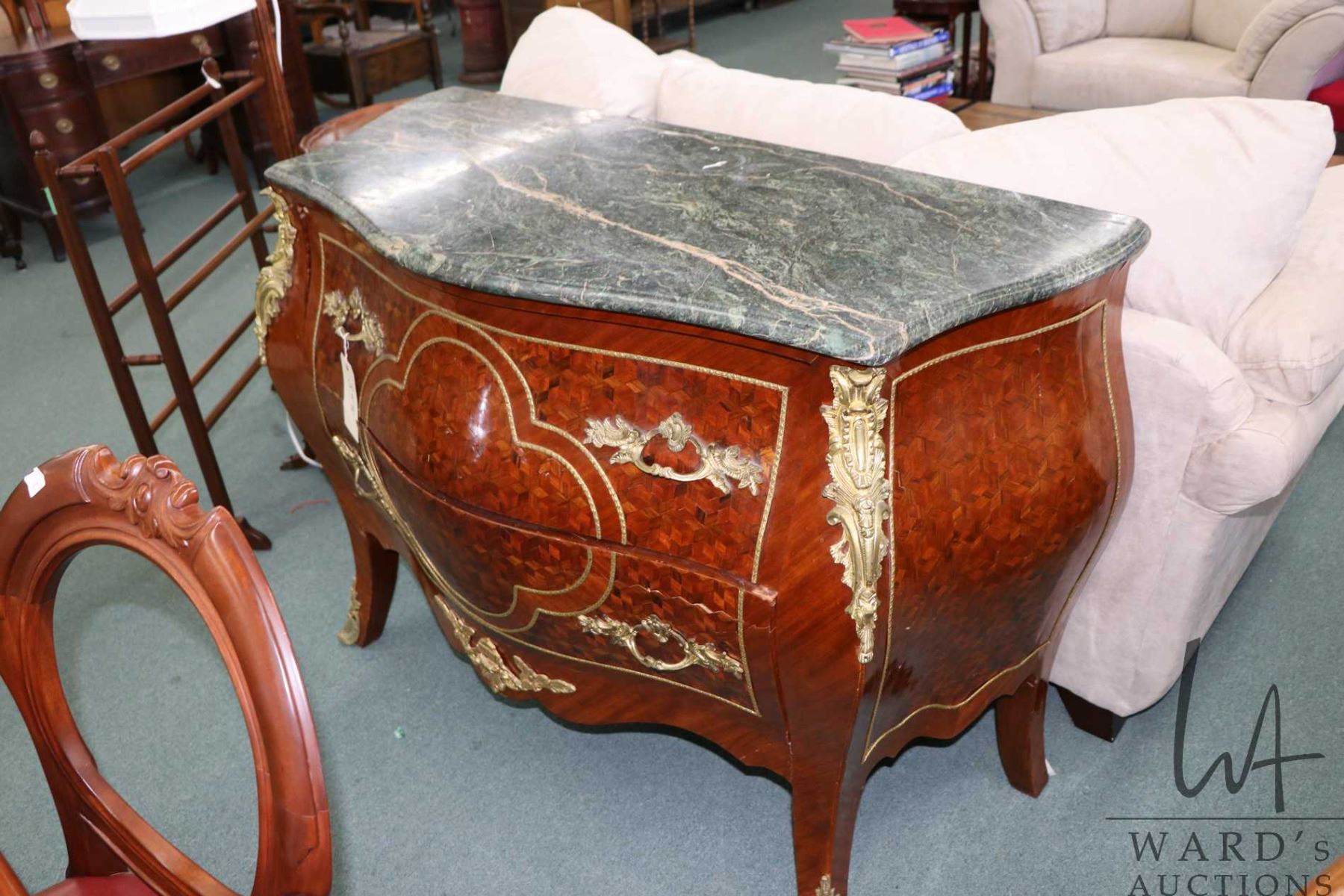 French style two drawer bombe cabinet with decorative attached ormolu and marble top, 36" high X 48" and 22" deep