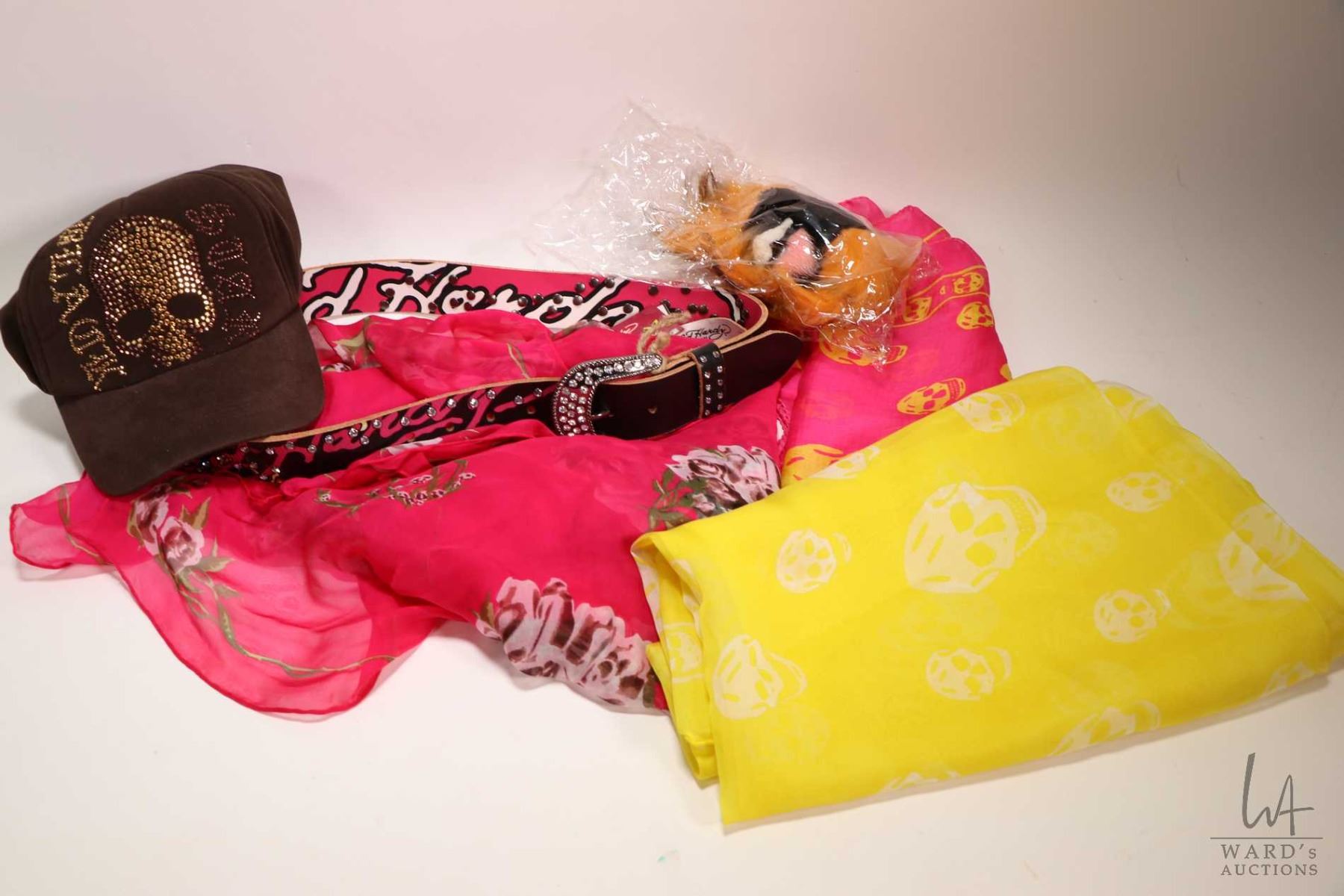 Fun lot of lady's fashion including designer like three Alexander McQueen silk and silk chiffon scarves, an Ed Hardy belt set with rhinestone, a Fendi fur purse charm and a skull motif ball cap- assume all not authentic