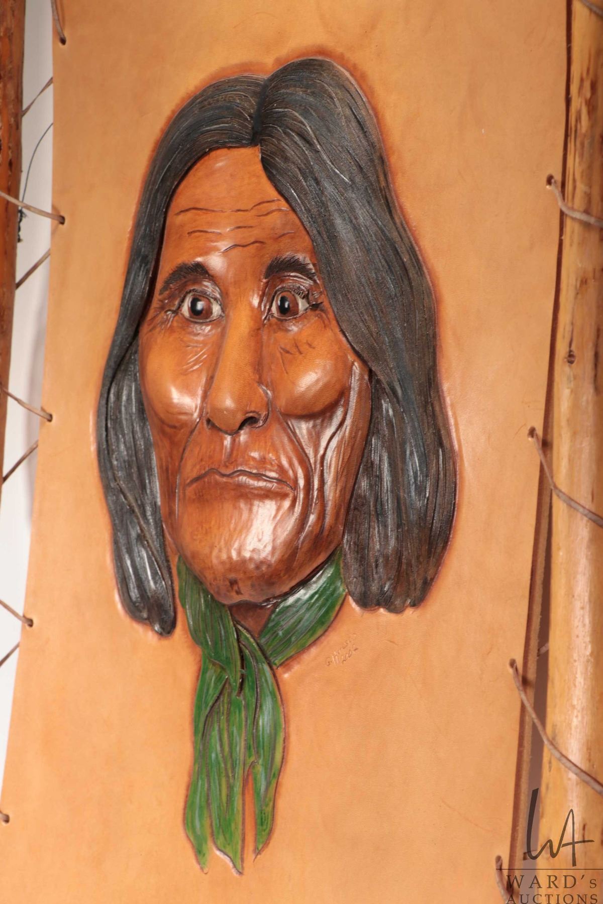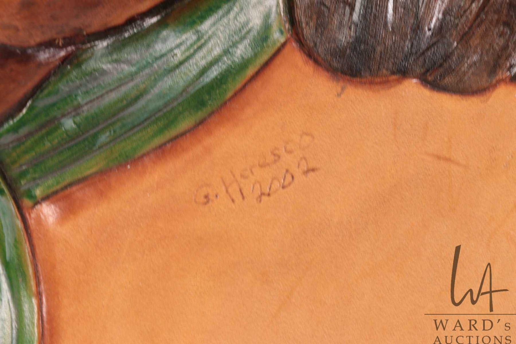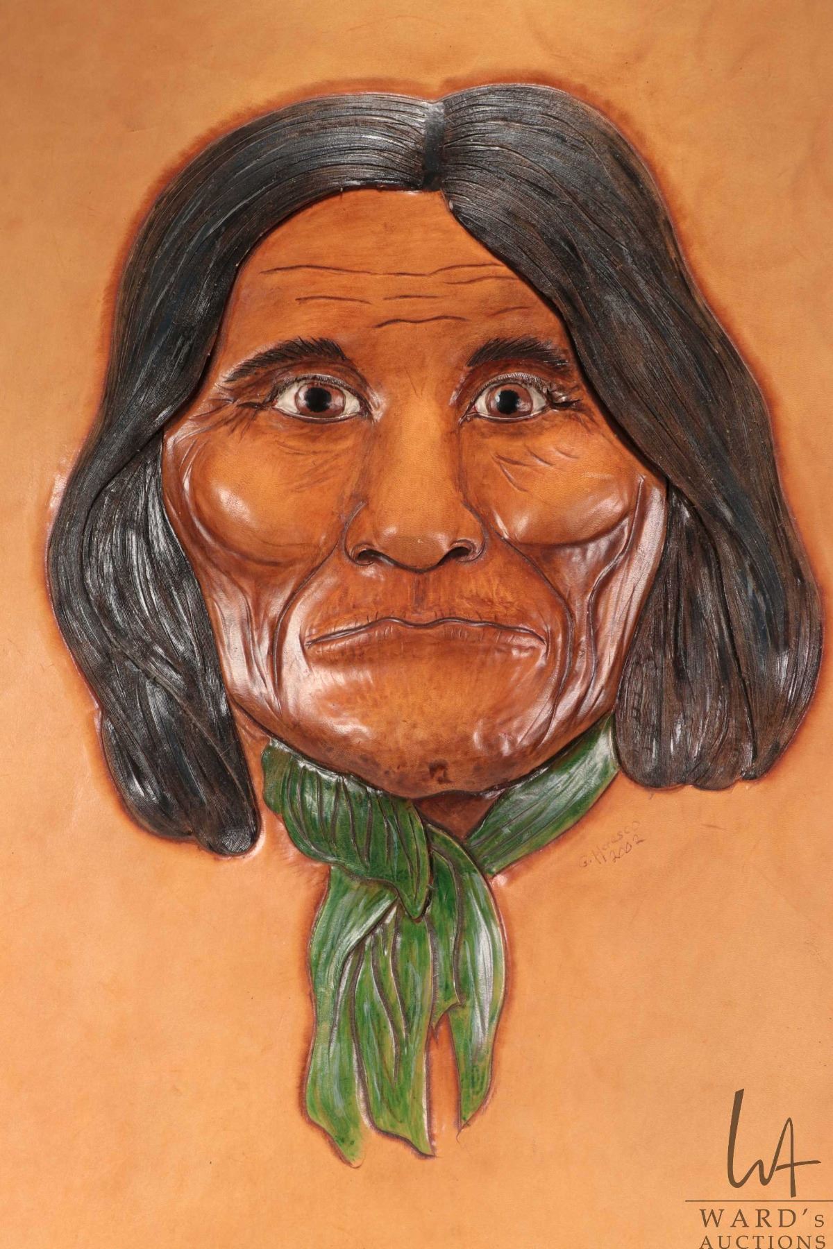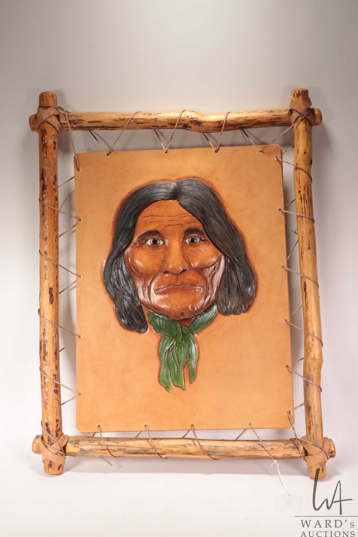 G. Heresco, signed sculpture on leather portrait of an Indigenous man, dated 2002. Overall dimensions including frame 29 1/2" X 23"