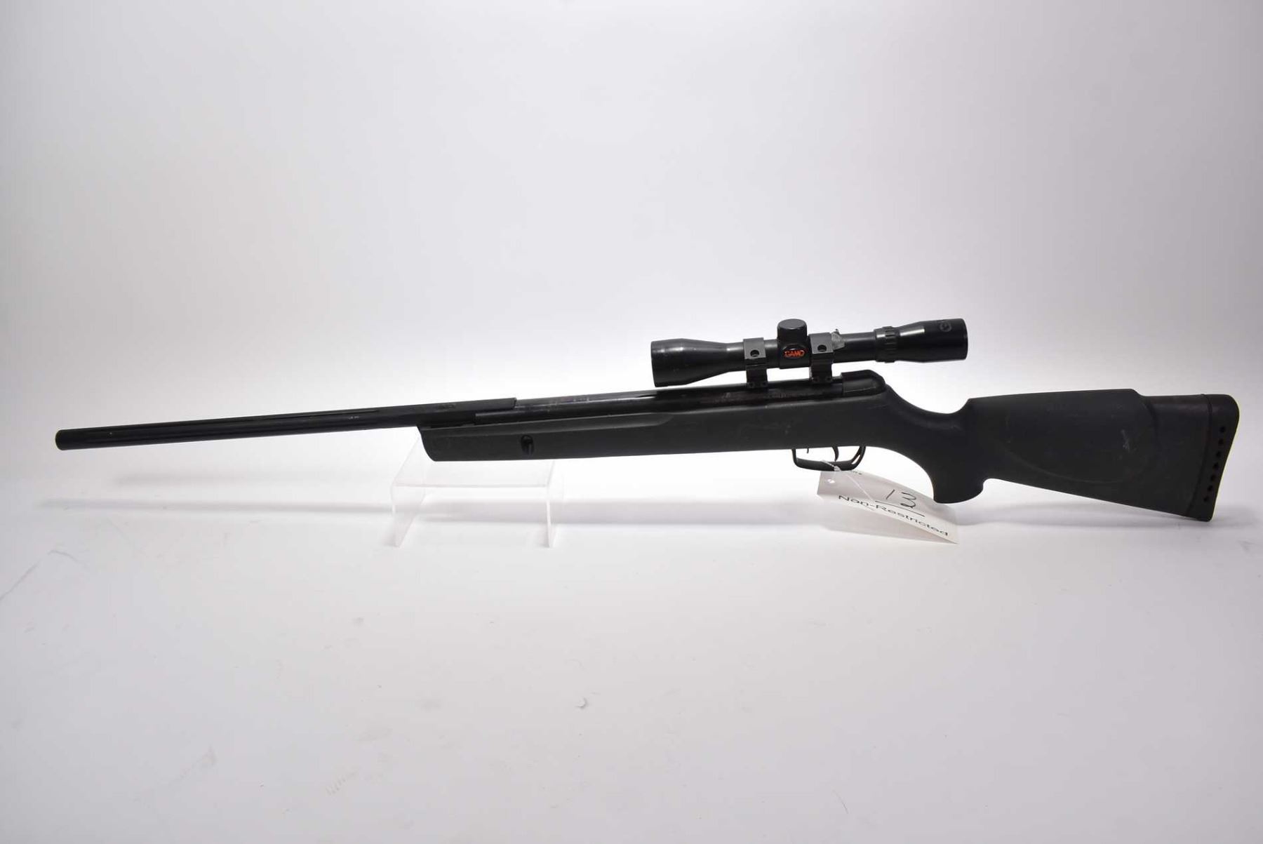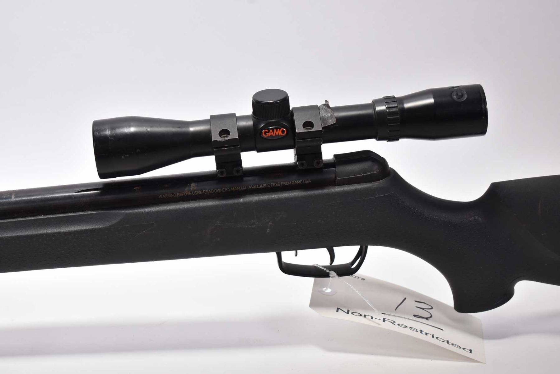 Gamo Model Big Cat 1200 .177 Pellet Cal Break Action Spring Loaded Pellet Rifle w/ 17 3/4" bbl [ blued finish with some surface rust, no sights but fitted w/ Gamo scope in rings, grey composite pistol grip stock, w/ dual raised cheek pieces, Rated 1000 Ft Per Second PAL REQ , various marks and scratches to stock and metal ] Ser # 04 - 1C - 148238 - 09 PAL REQ
