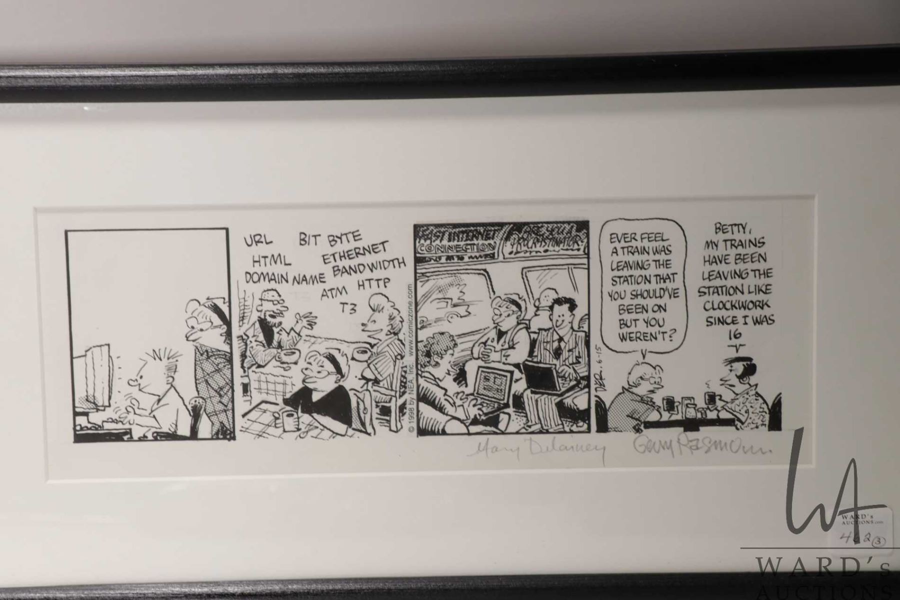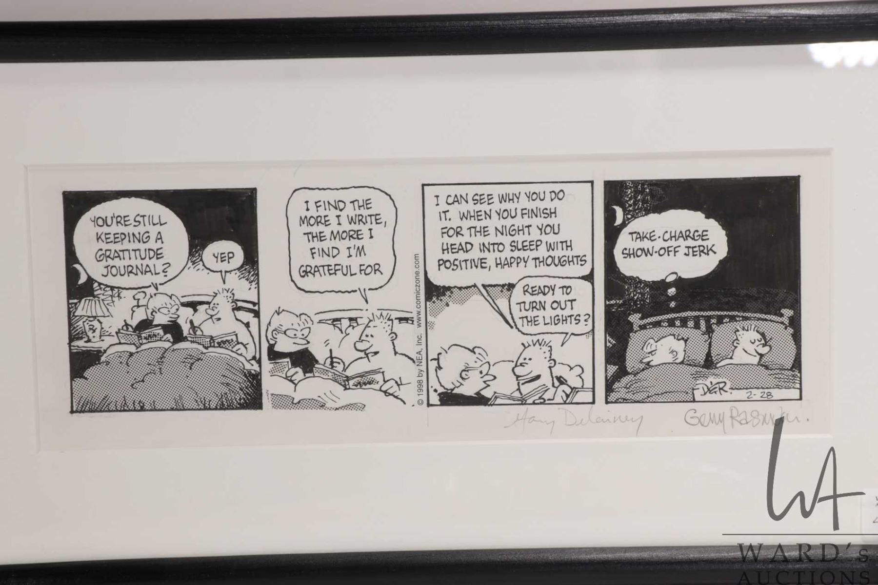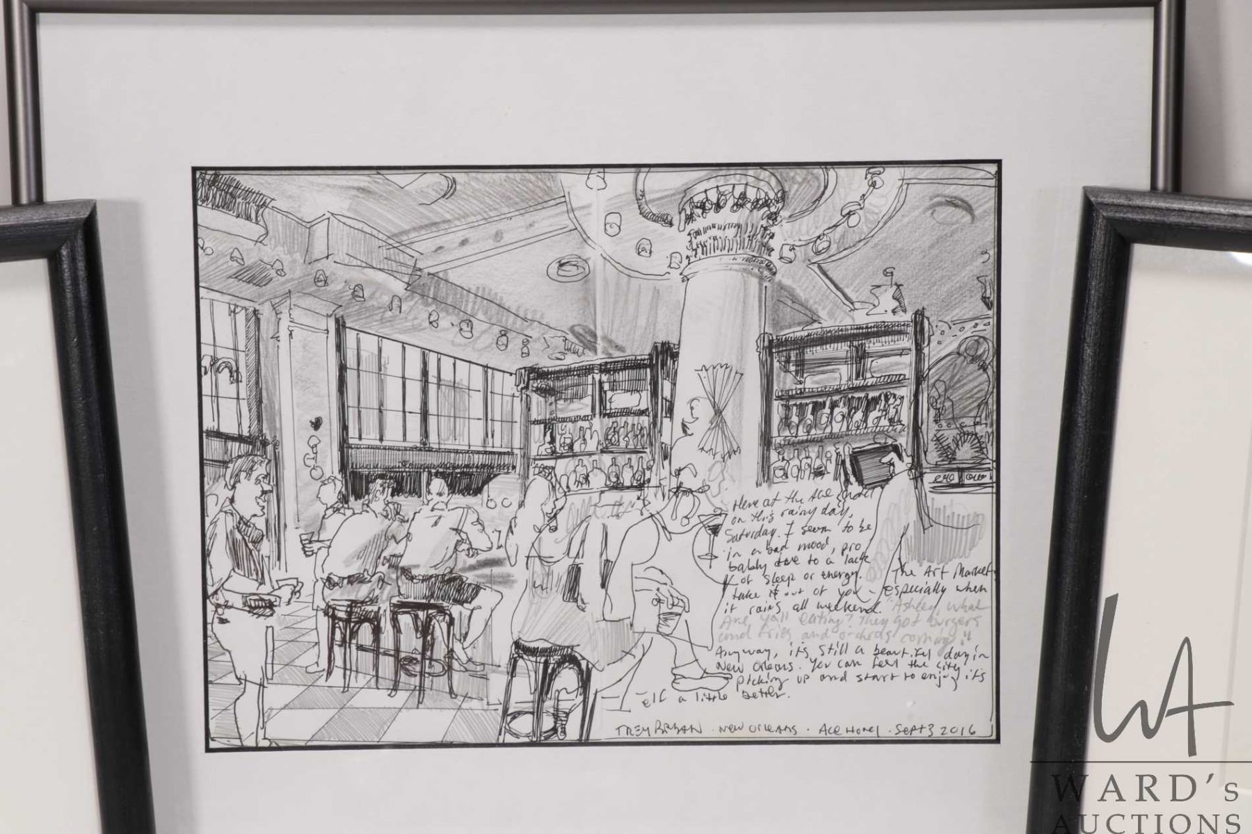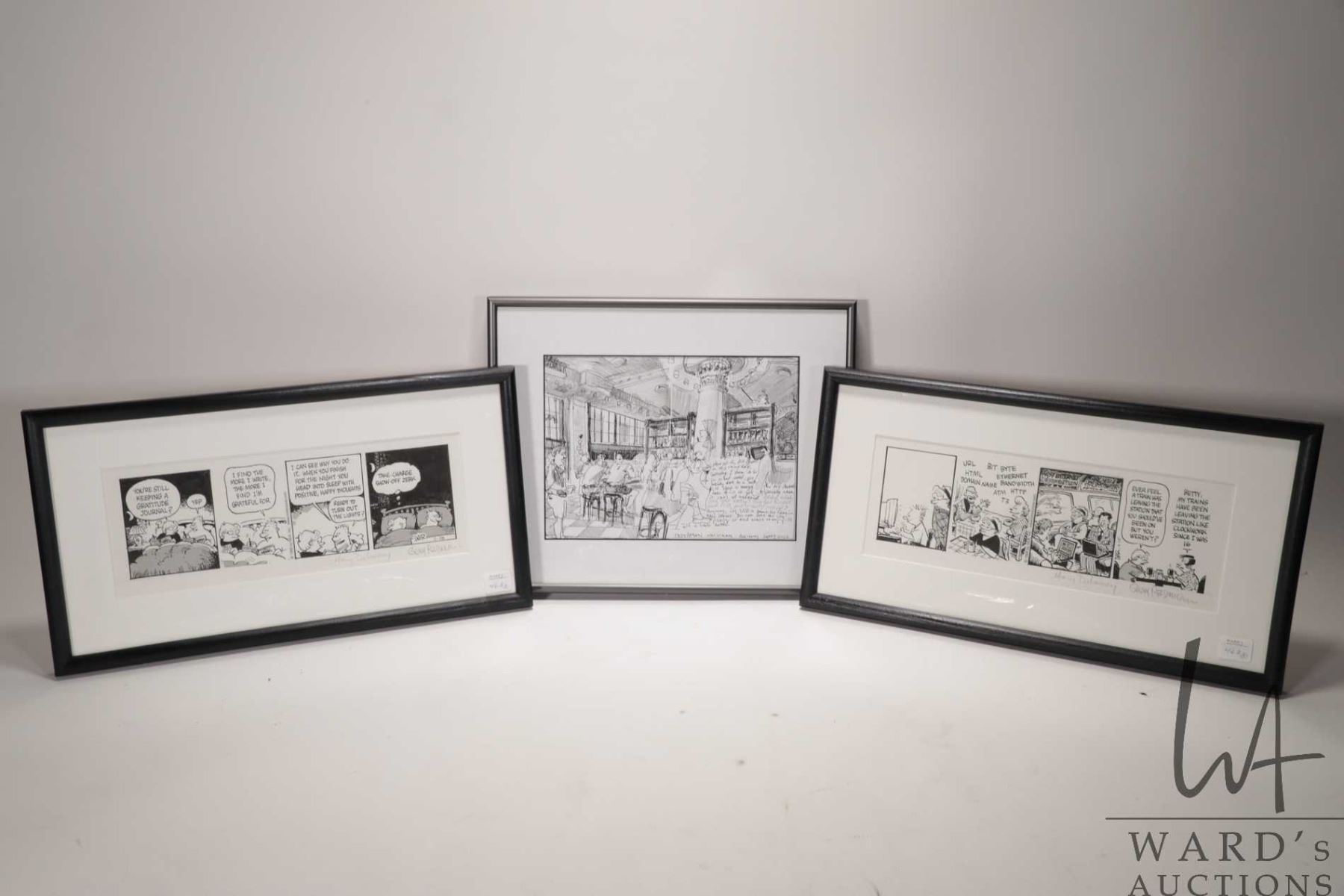 Gary Rasmussen, two pen and ink drawings including titled on verso "You're Still Keeping" and "Url Bit", both pencil signed by artist Gary Rasmussen and by comic writer Gary Delainey, both 3 1/2" X 11" and a Trey Bryan original ink drawing titled "Ace Lobby", labeled on verso 2016 and includes original sales receip, 6 3/4" X 9 1/4"
