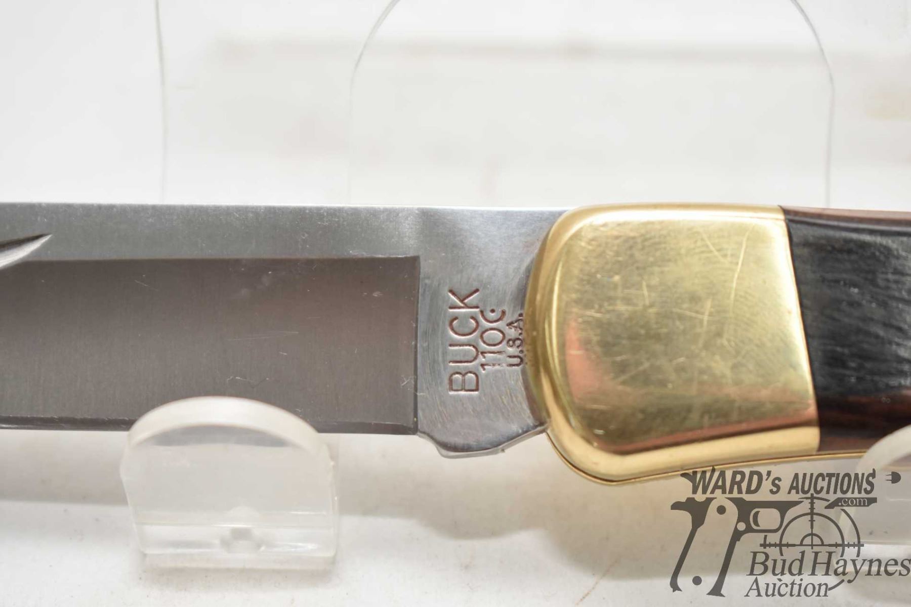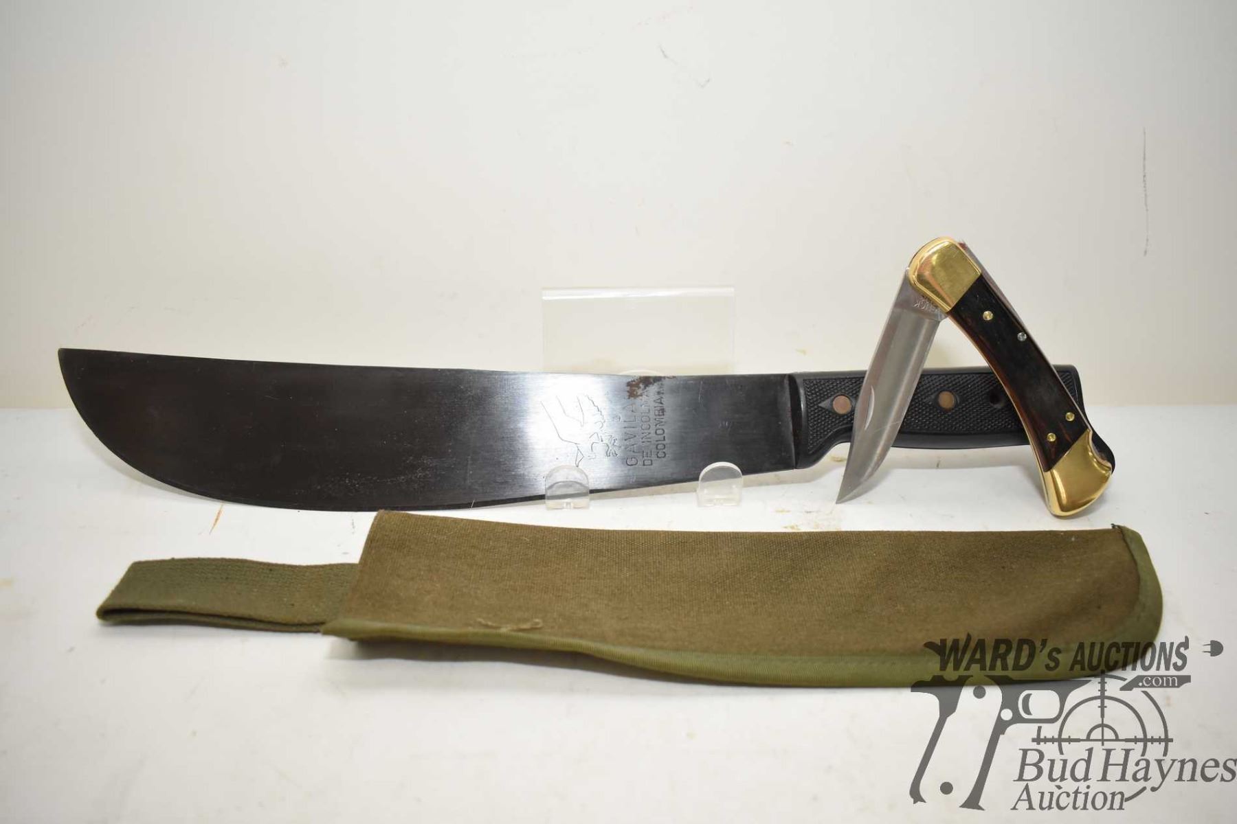 Gauilam machete w/ 12" blade and webbed sheath. Plus a Buck 110 folding knife