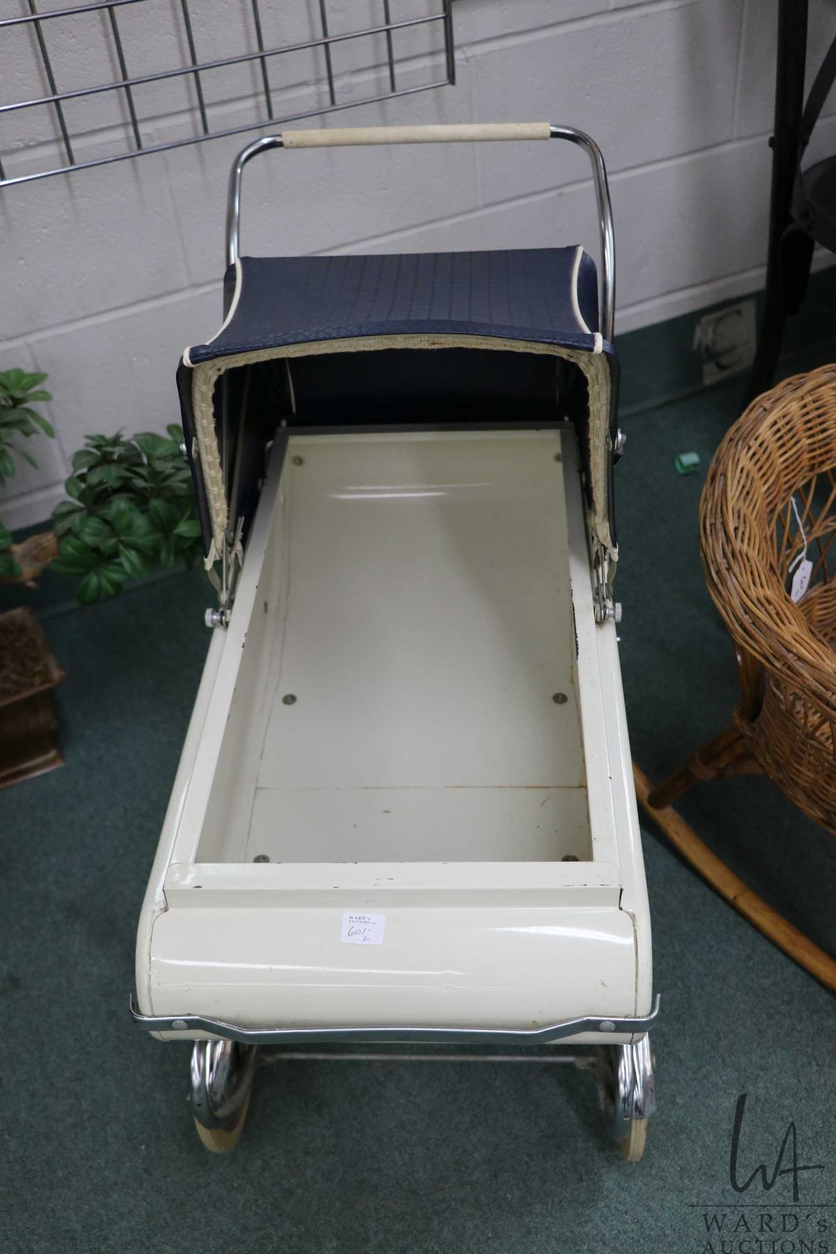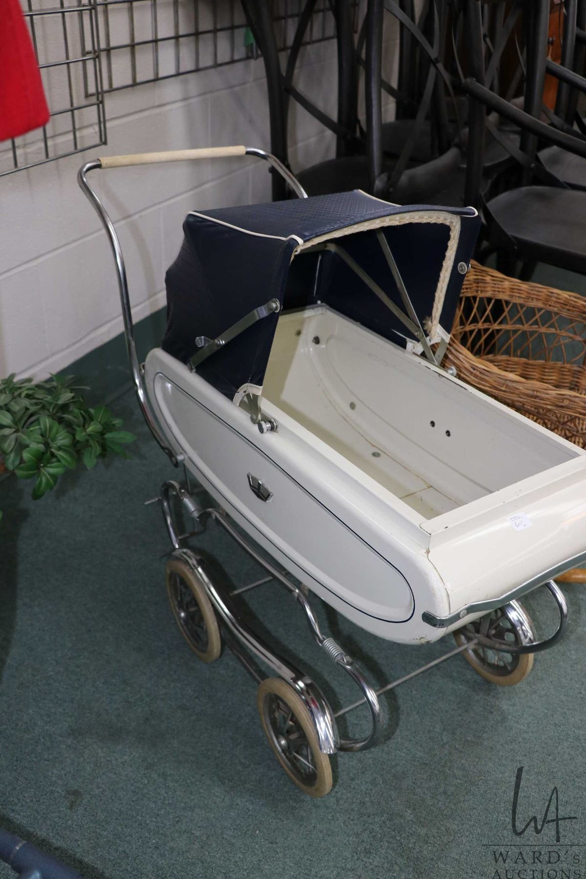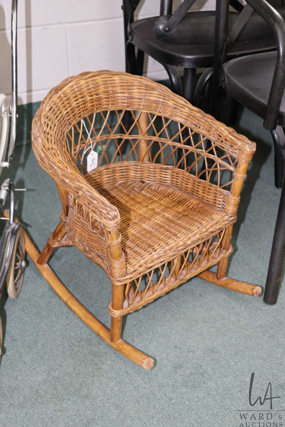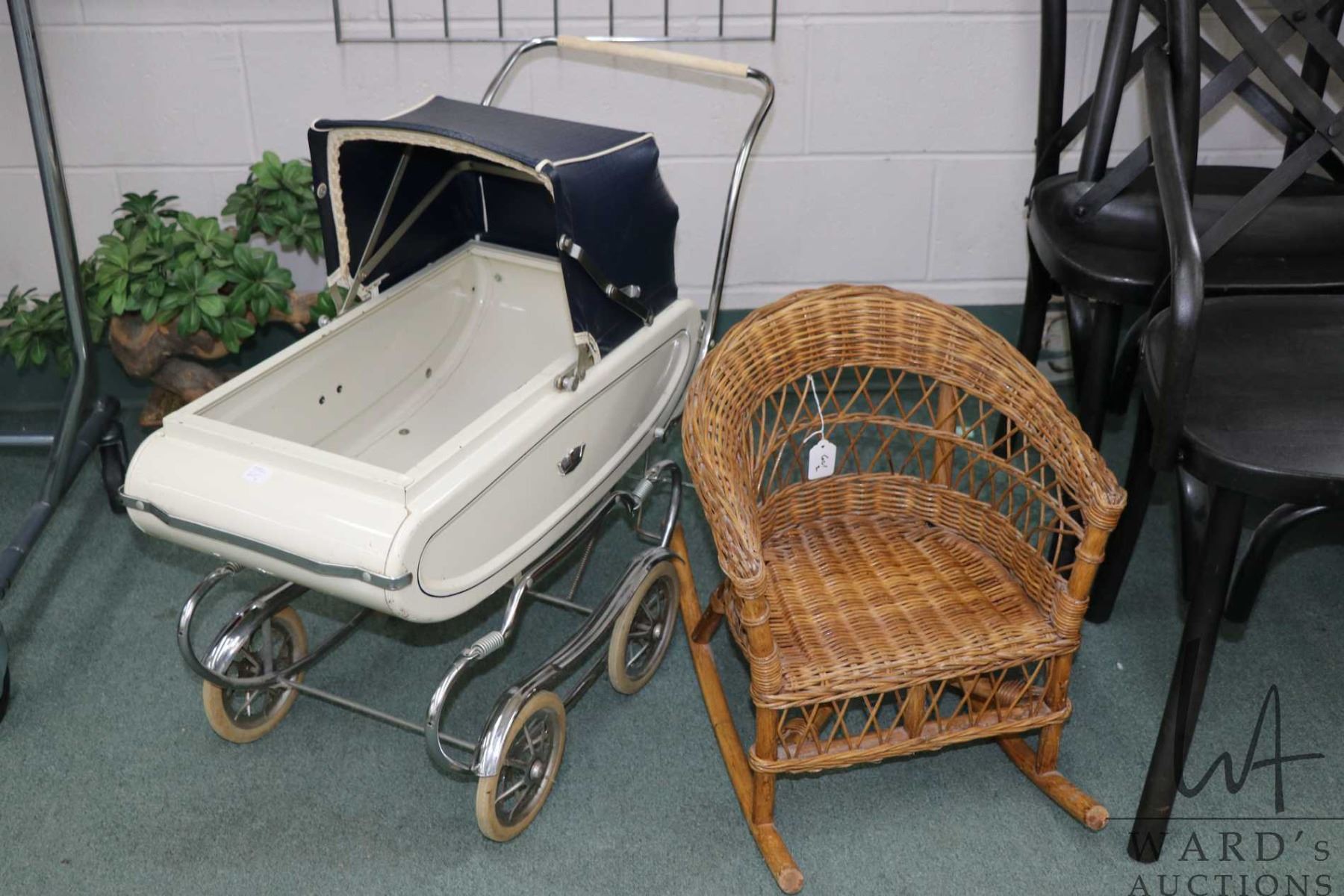 Gendron Canadian made metal doll carriage with folding sun shade plus a child's sized wicker rocking chair