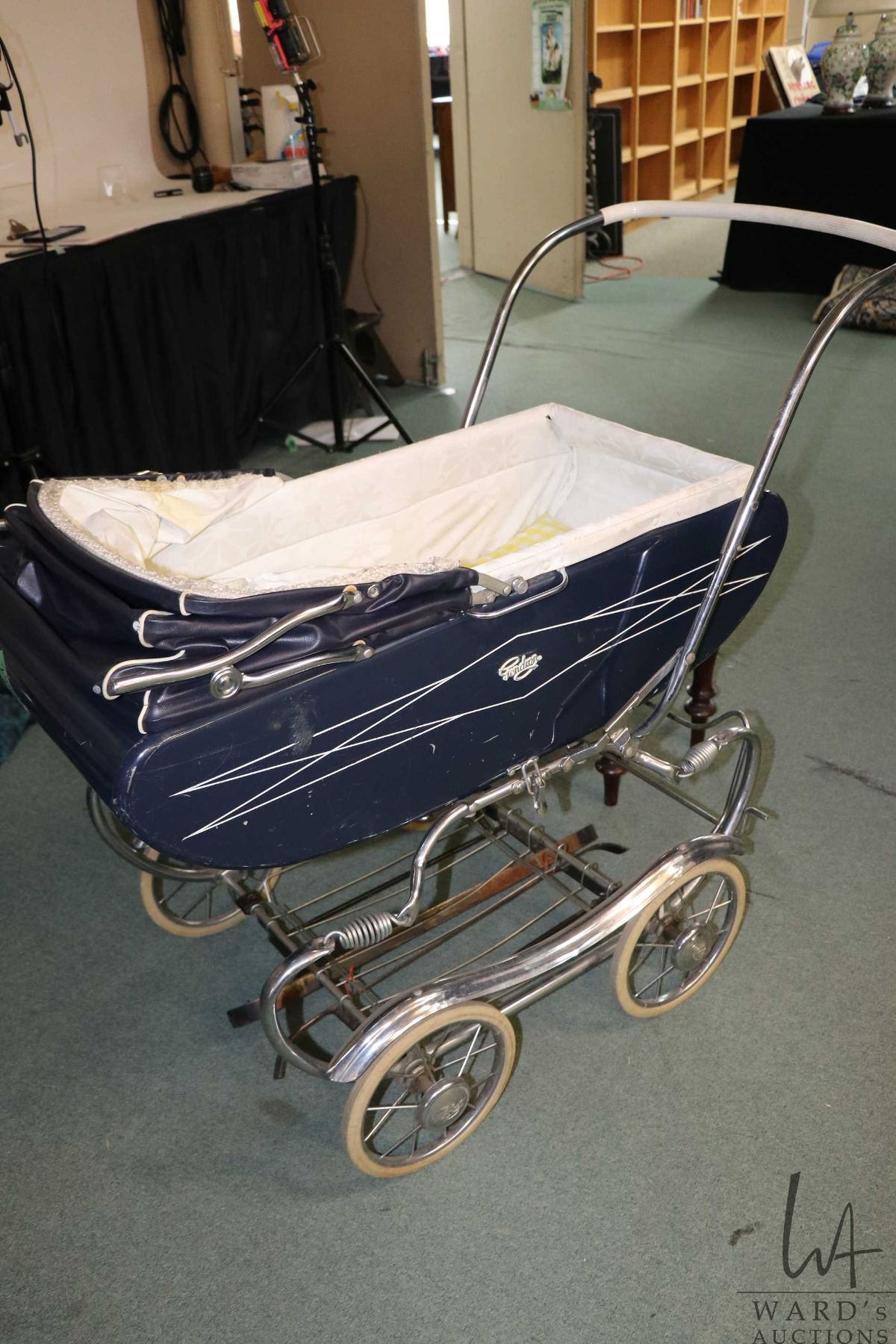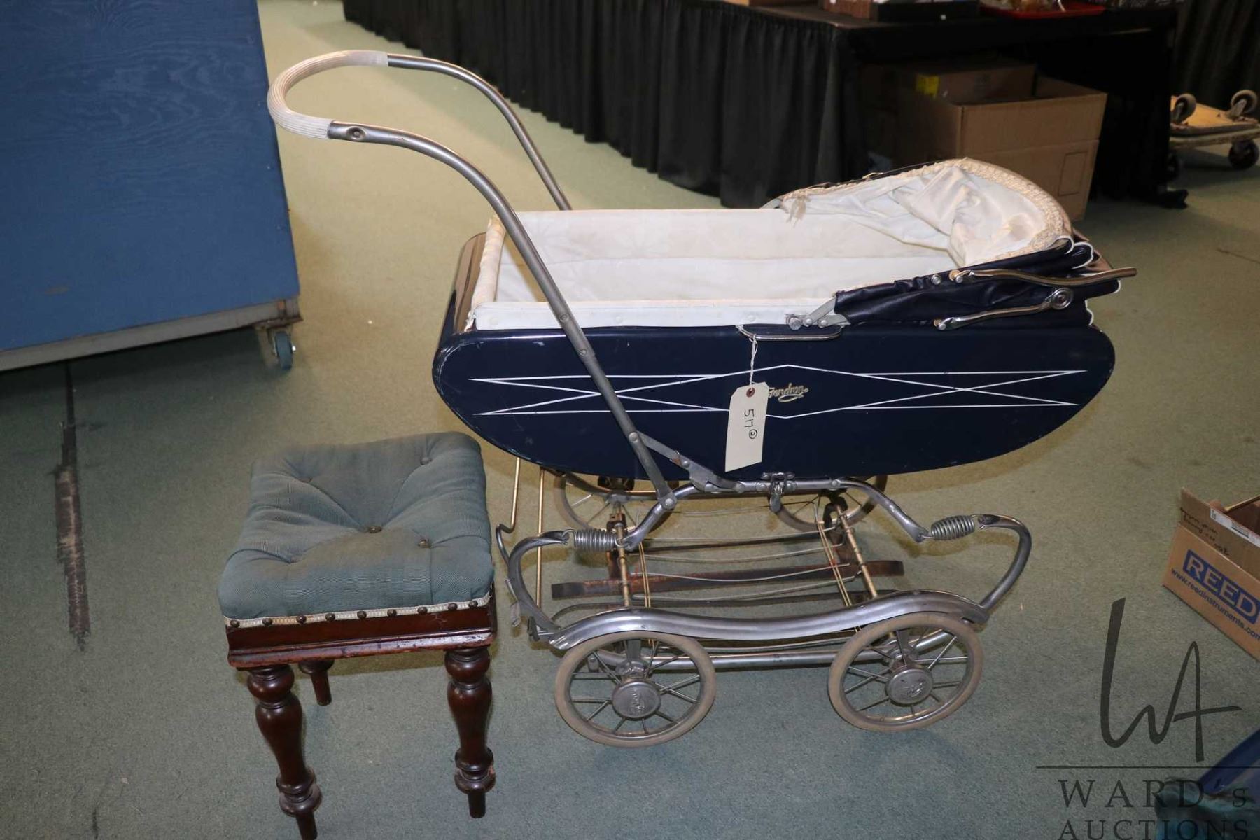 Gendrone convertible baby carriage with ski attachment and an antique foot stool.