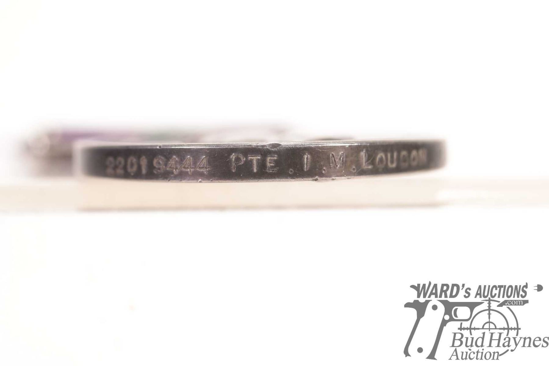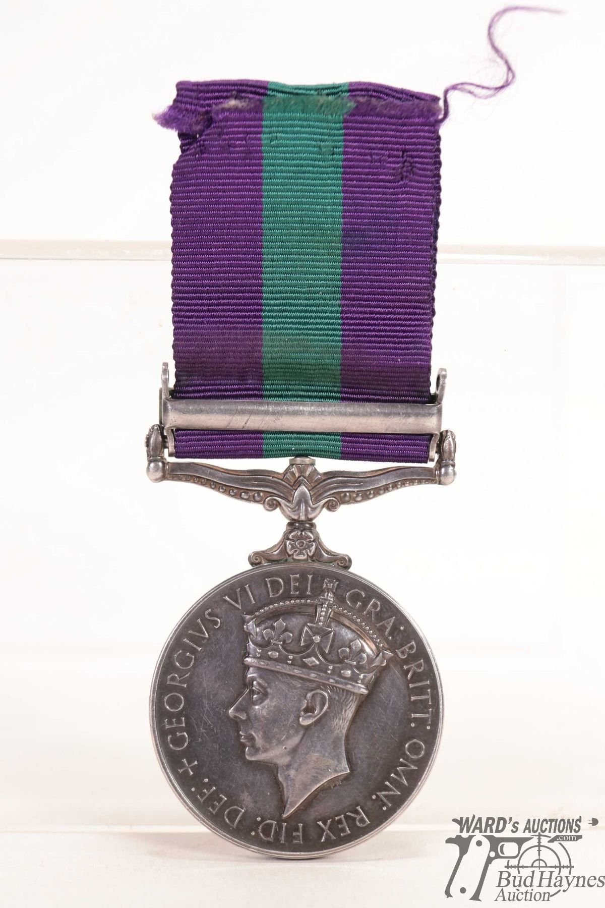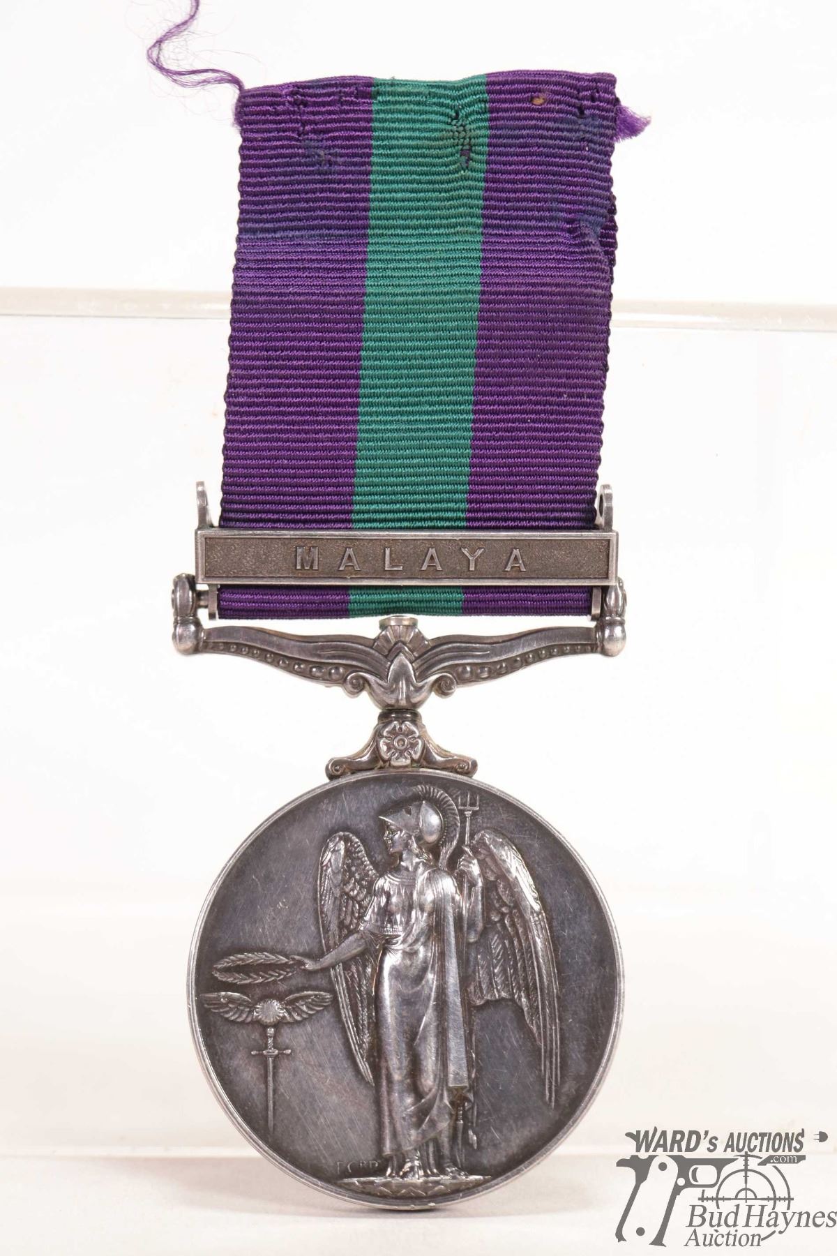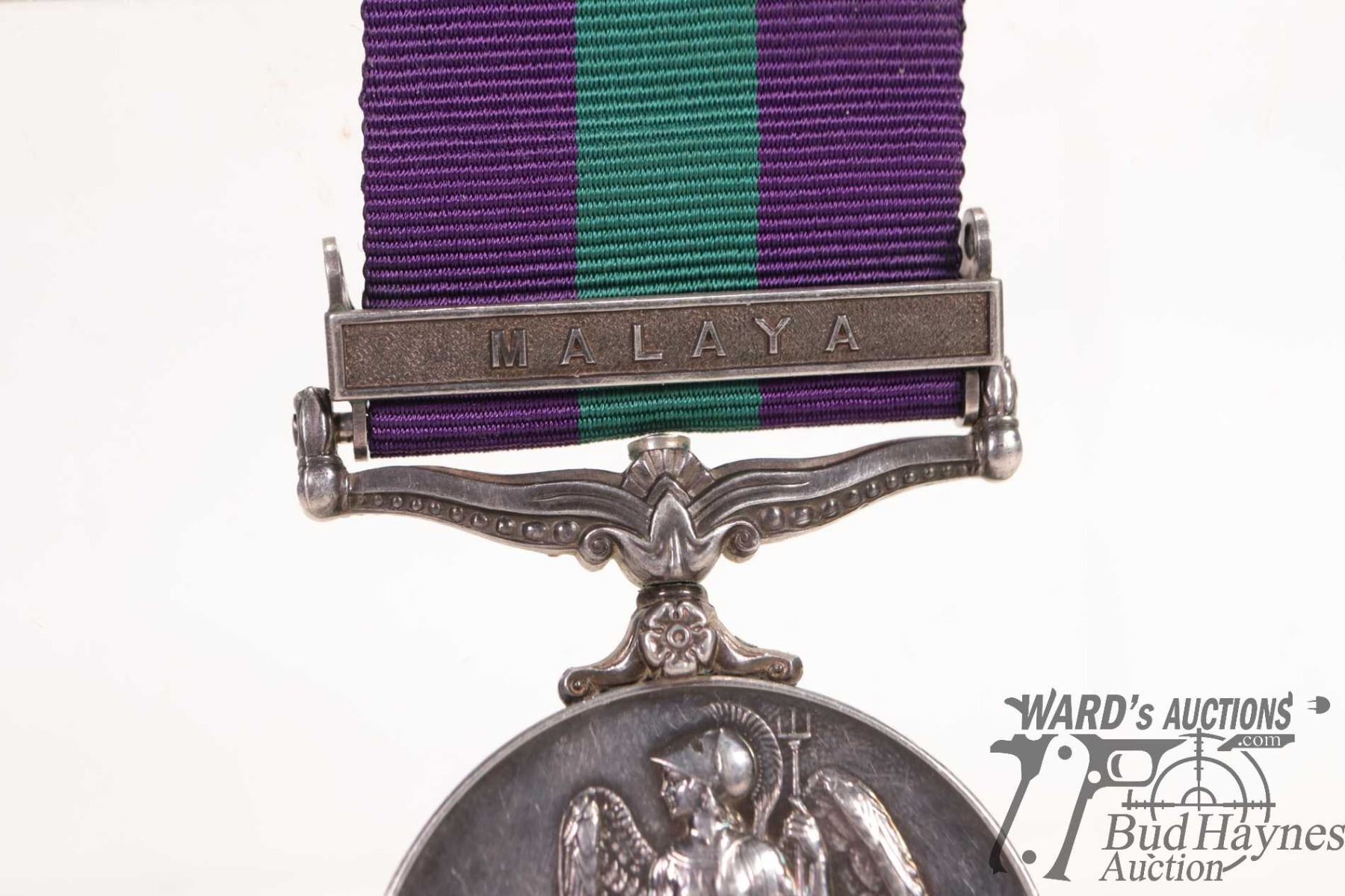 General Service medal 1918 - 1962 edge marked 22019444 PTE. I. M. Loudon. R.A.O.C. and has Malaya on clasp w/ purple edges and green center