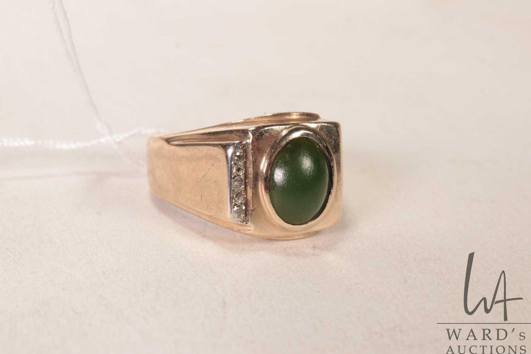 Gent's 10kt yellow gold ring set with green cabochon center stone and three small accent diamonds, size 11