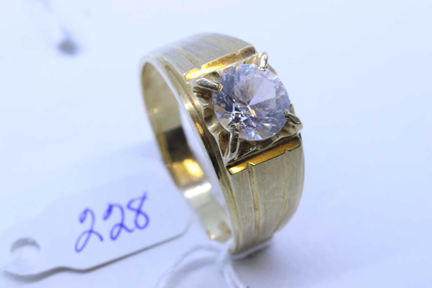 Gent's 14kt yellow gold solitaire ring set with synthetic diamond
