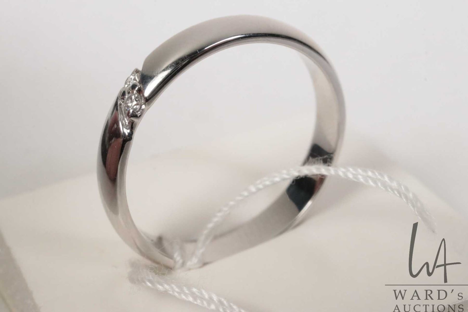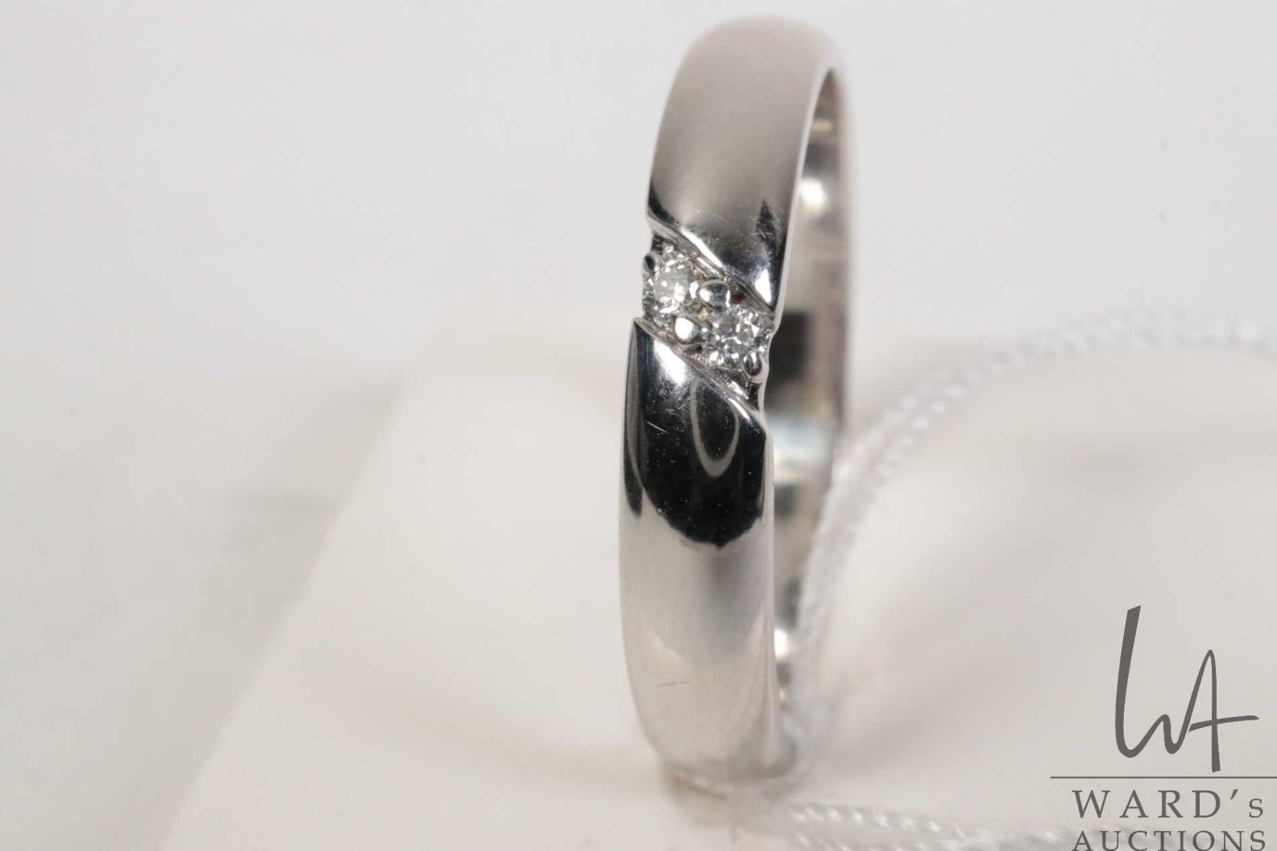 Gent's 19kt white gold set with two brilliant cut white diamonds. Total diamond weight 0.08ct. Ring sized 9.5. Retail replacement value $2,000.00