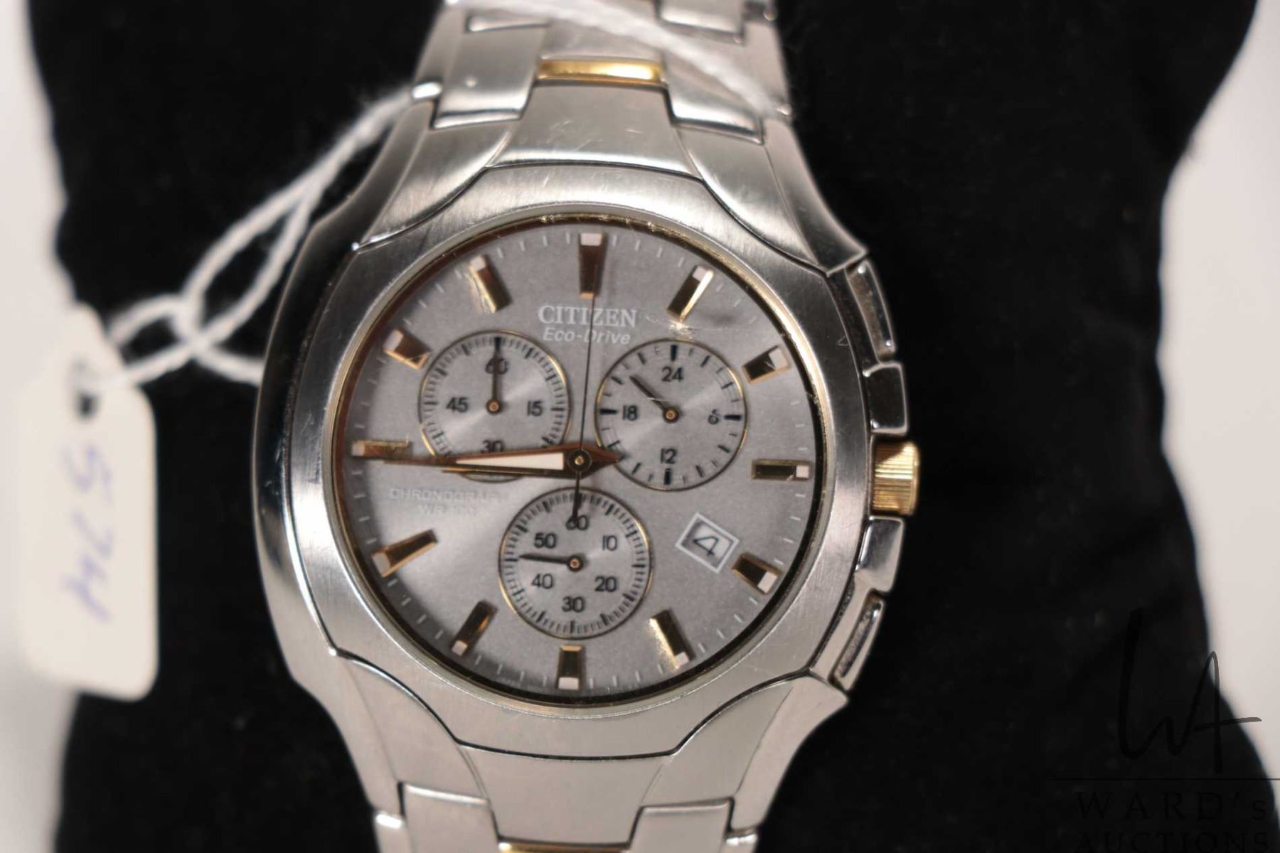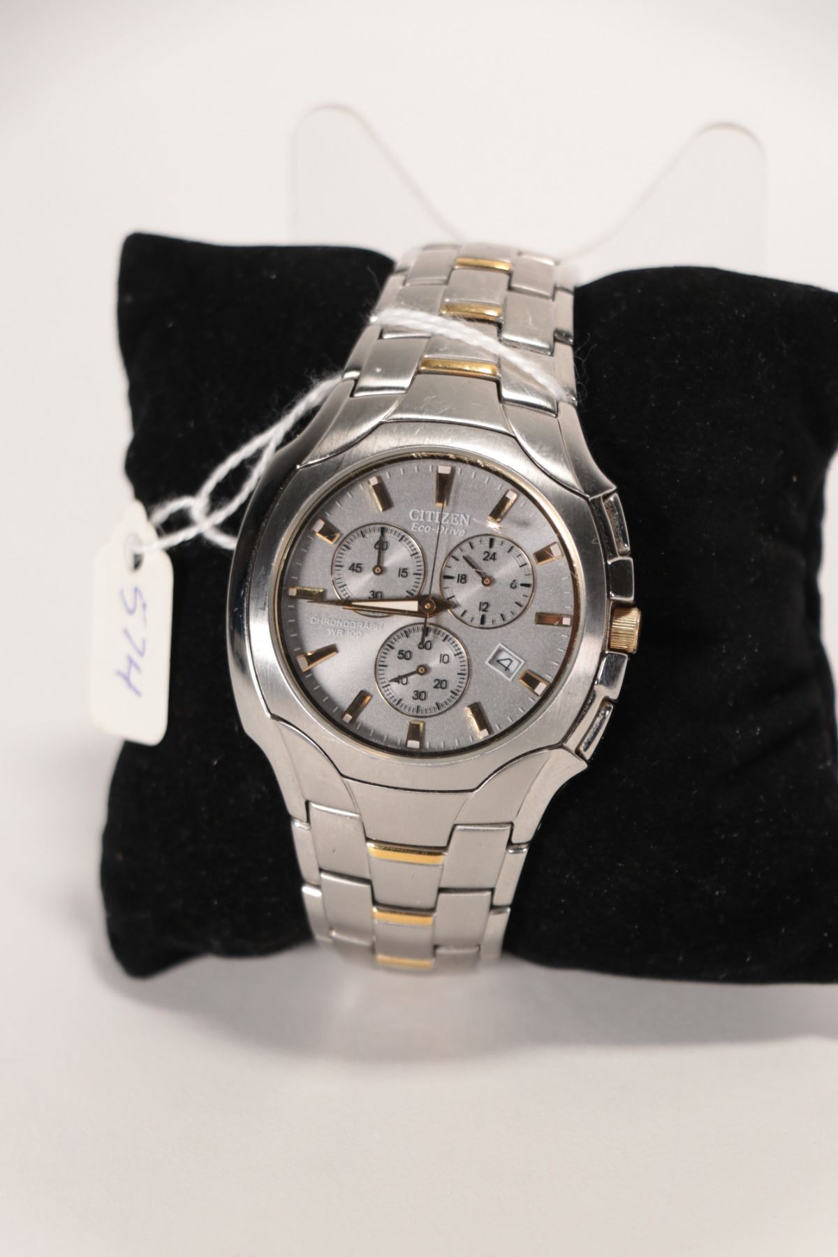 Gent's Citizen Eco-Drive Chronograph wrist watch with two toned stainless case and stainless and gold toned bracelet , water resistant up to 100 meter, working at time of cataloguing