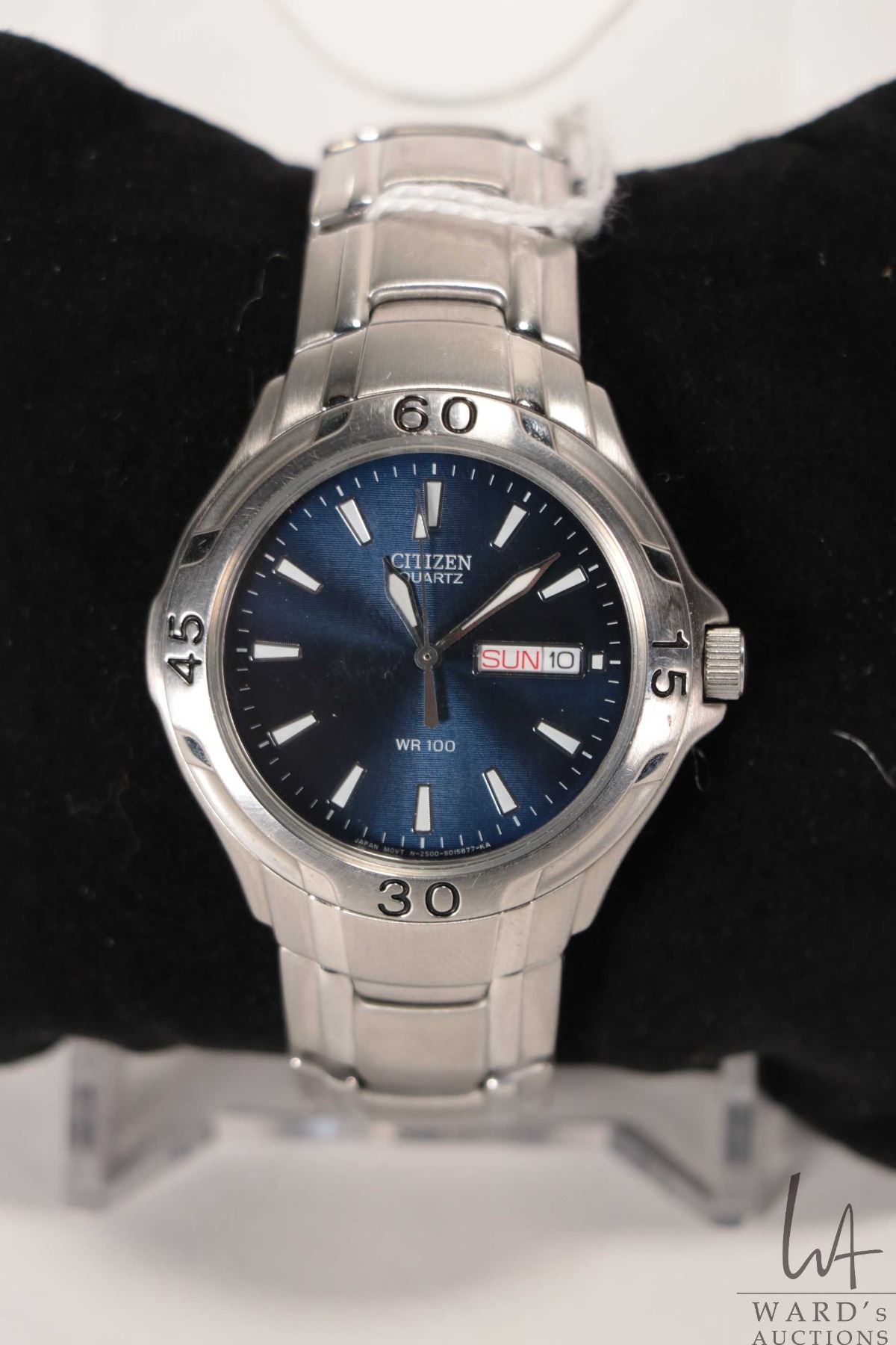 Gent's Citizen quartz wrist watch with day/ date and water resistant up to 100 meter. Not working at time of cataloguing, needs new battery