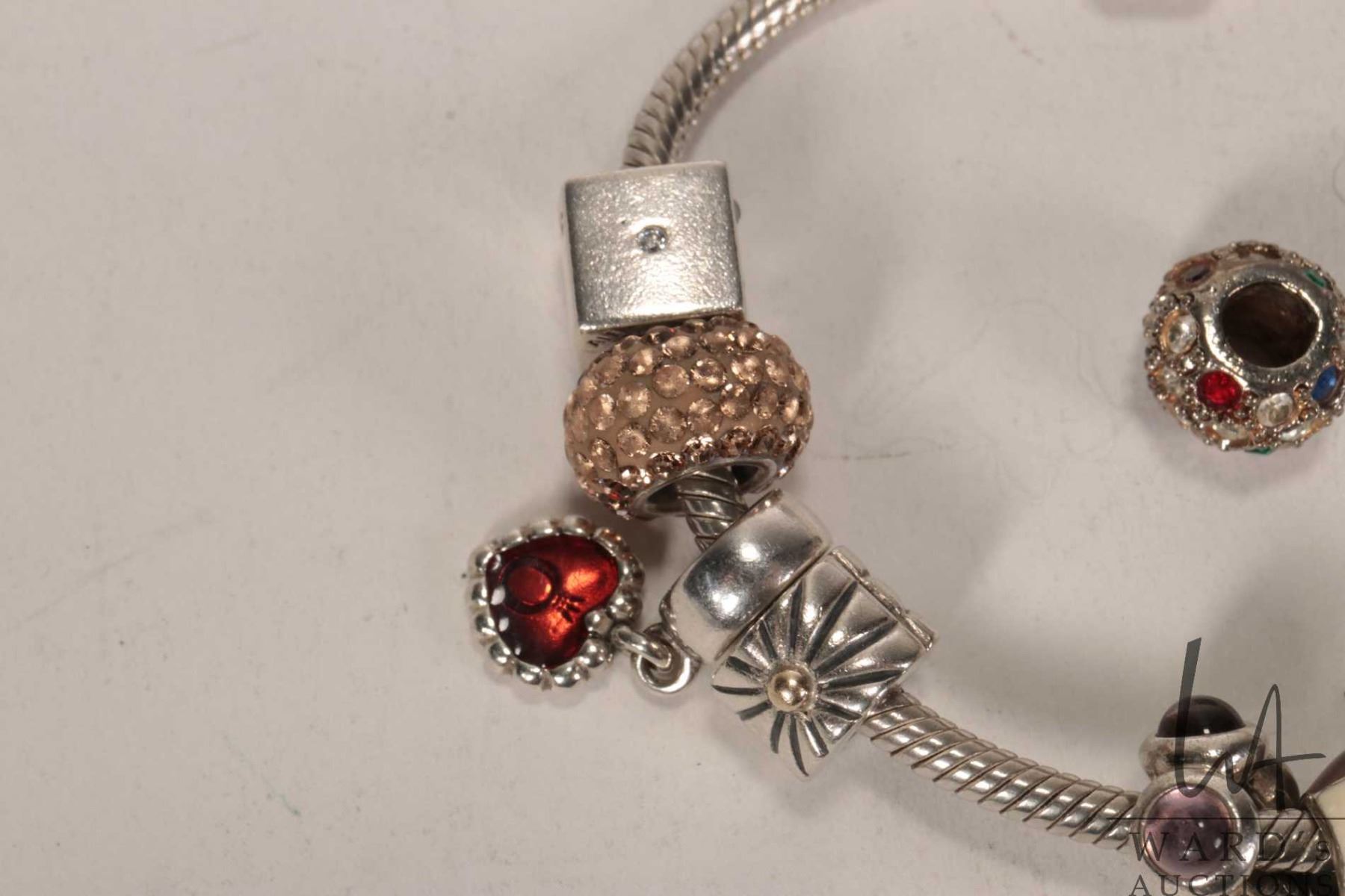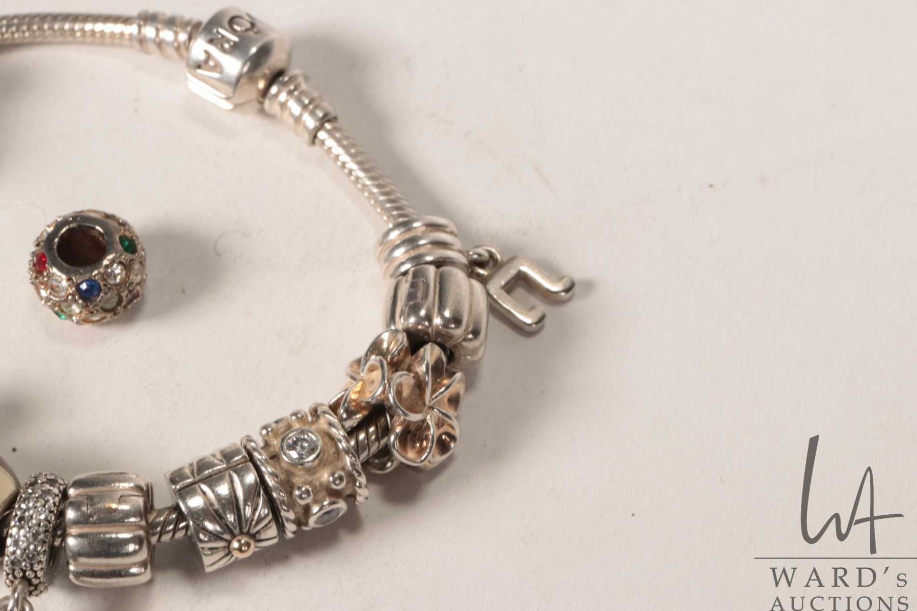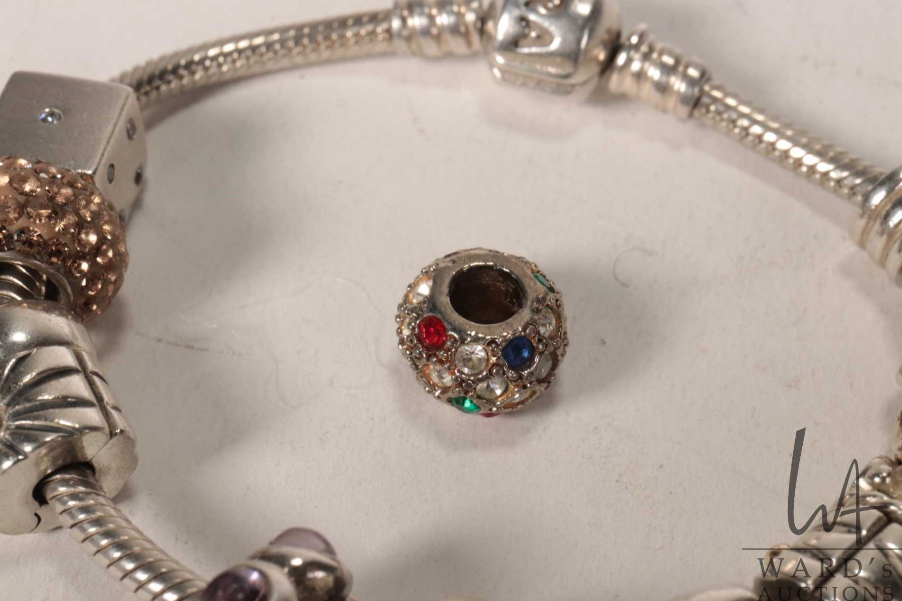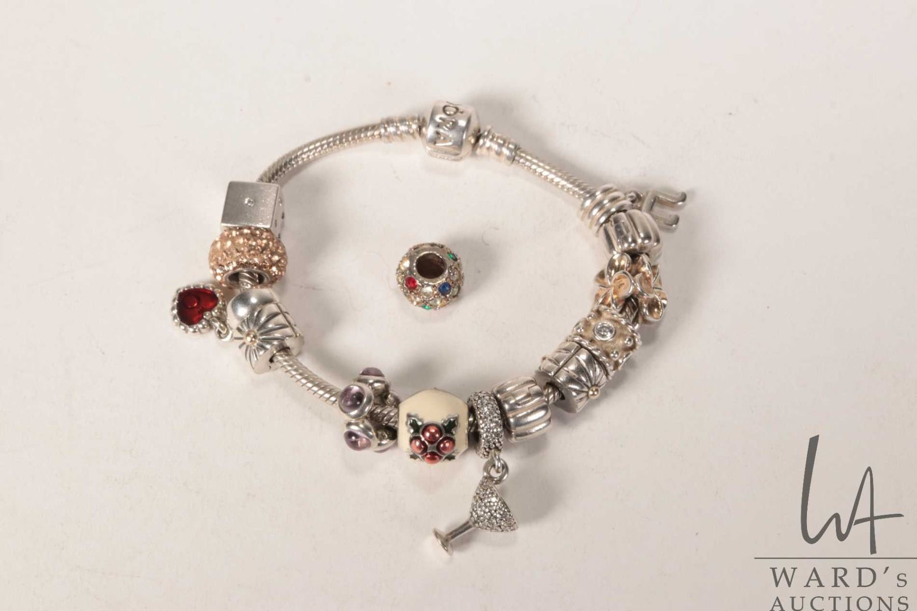 Genuine Pandora bracelet with twelve Pandora charms including dice, enameled Christmas pudding, cham
