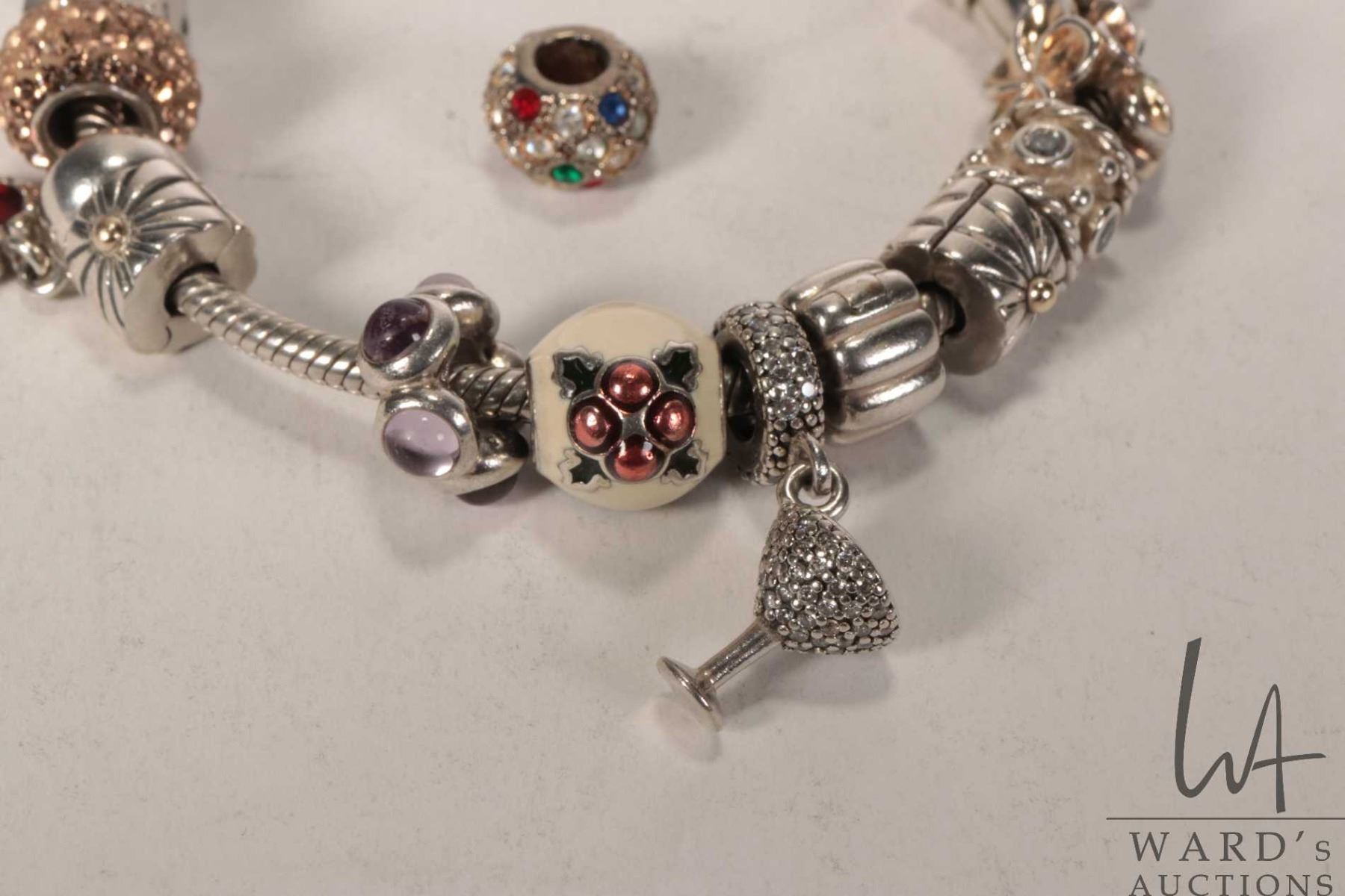 Genuine Pandora bracelet with twelve Pandora charms including dice, enameled Christmas pudding, champagne glass, lotus flower, musical note etc., all marked "S925 ALE" with the exception of two crystal beads