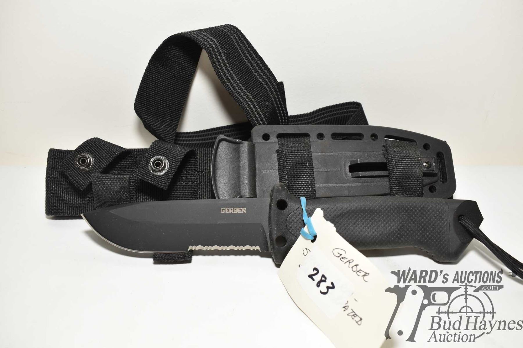 Gerber Army Forces survival knife w/ 5" black serrated edge blade, hard plastic and webbed sheath and a leg strap