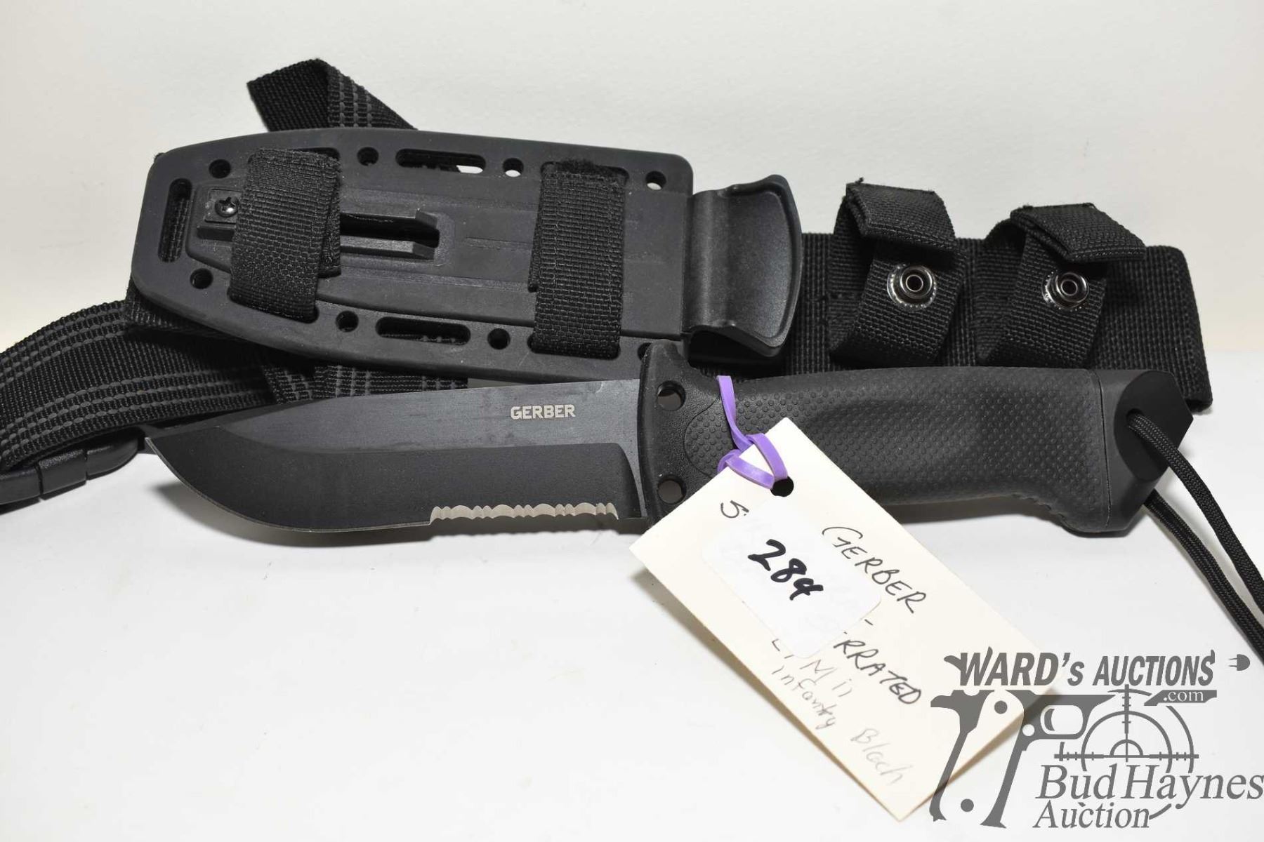 Gerber Army Forces survival knife w/ 5" black serrated edge blade, hard plastic and webbed sheath and a leg strap