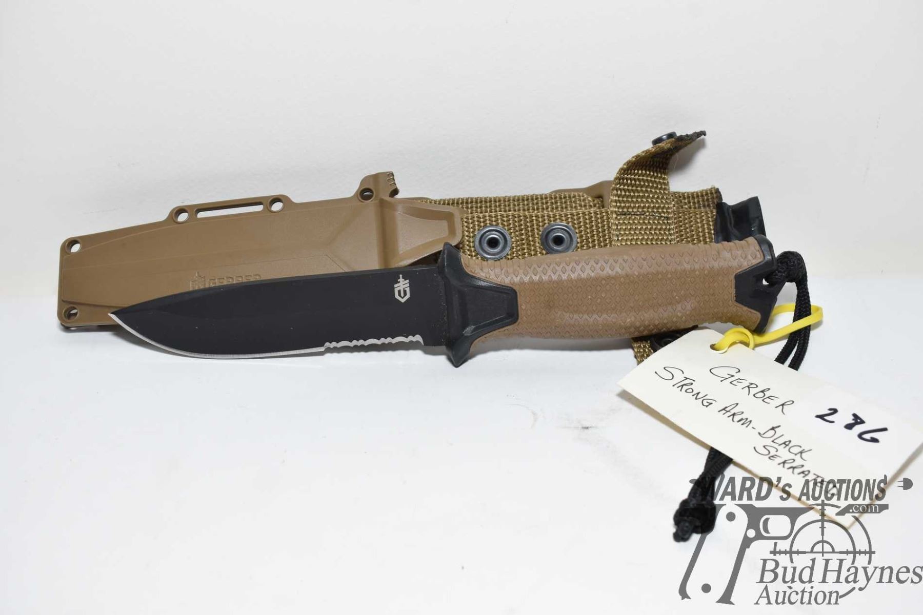 Gerber strong arm military style knife w/ 5" black serrated edged blade, plastic sheath and webbed hanger