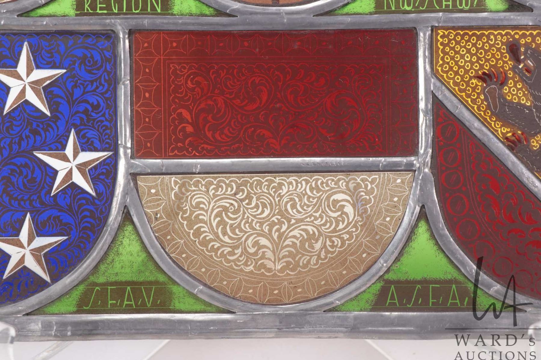 German football league leaded glass panel circa 1945/46 hand crafted and etched "Region Meister Saison Jun. B (Region Champion Season) NW. SCHW, S.F.A.B, A.S.F.A" with six panels, 8" X 11 1/2"