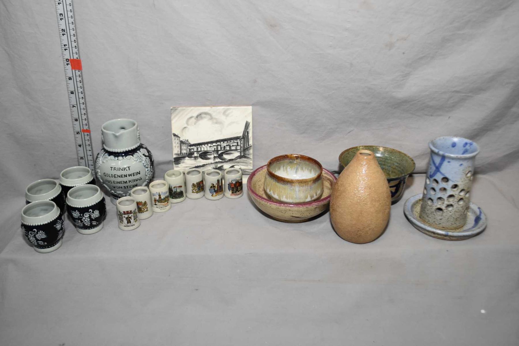 German glazed pottery pitcher with four cups, miniature stoneware cups, clay candleholder, vase, three bowls and a hand painted tile