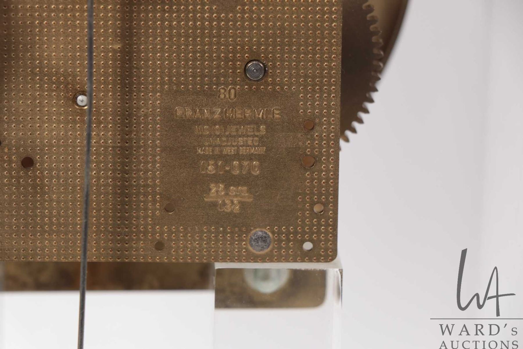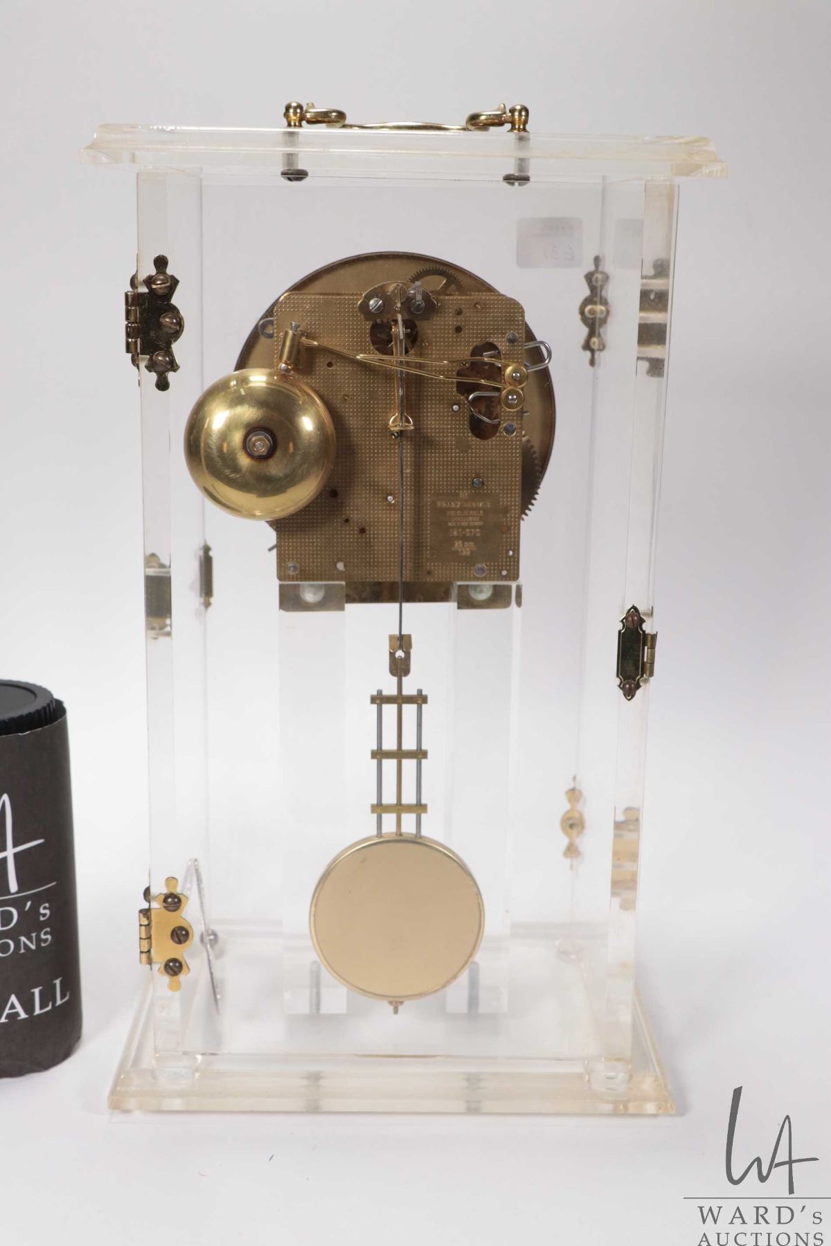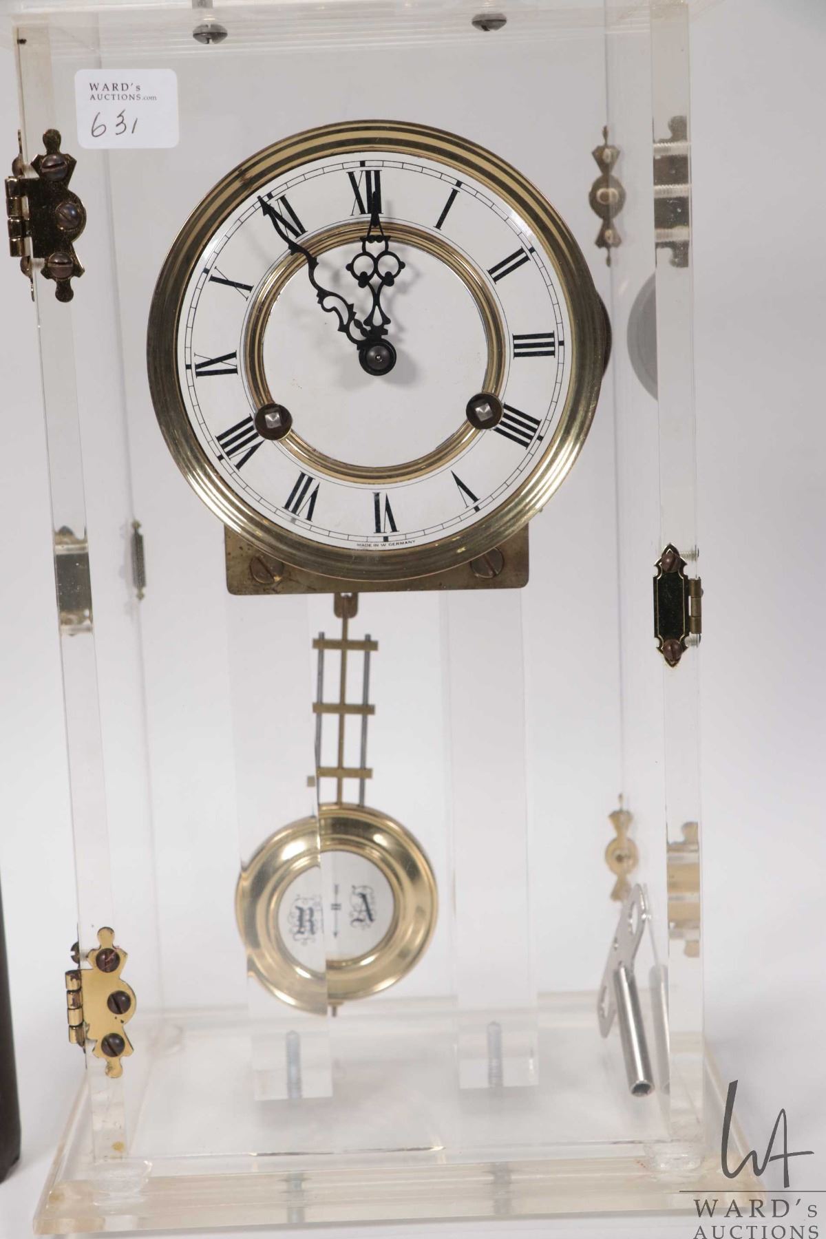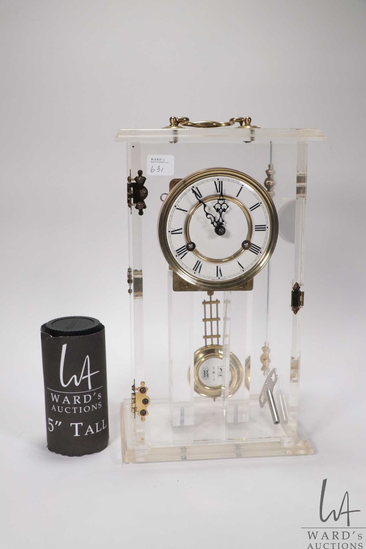 German made Anniversary clock in acrylic case, note: keeping time but chime not working