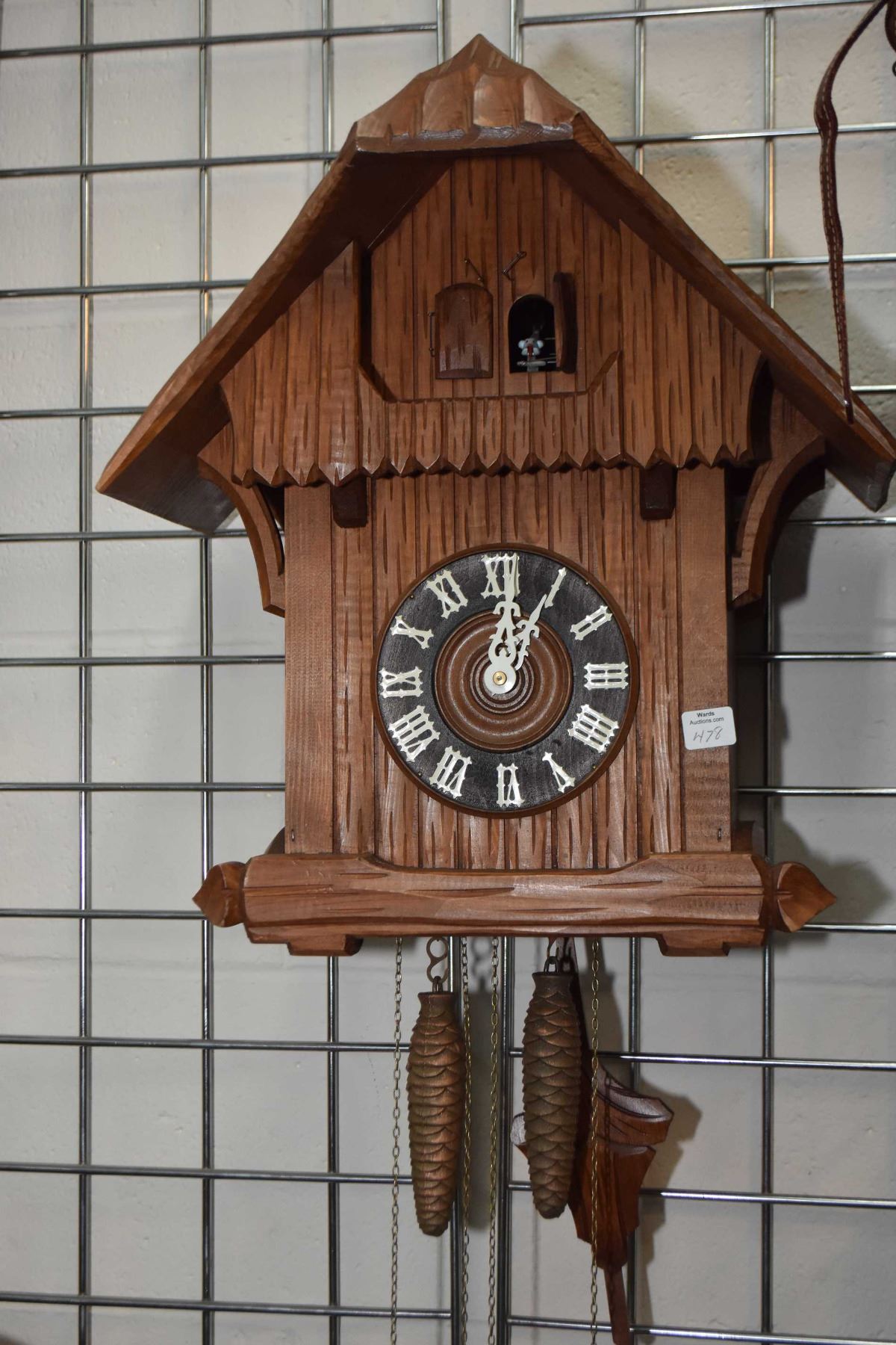 German made triple train cuckoo clock plus a selection of small wooden decorative figures, possibly not for this clock, working at time of cataloguing