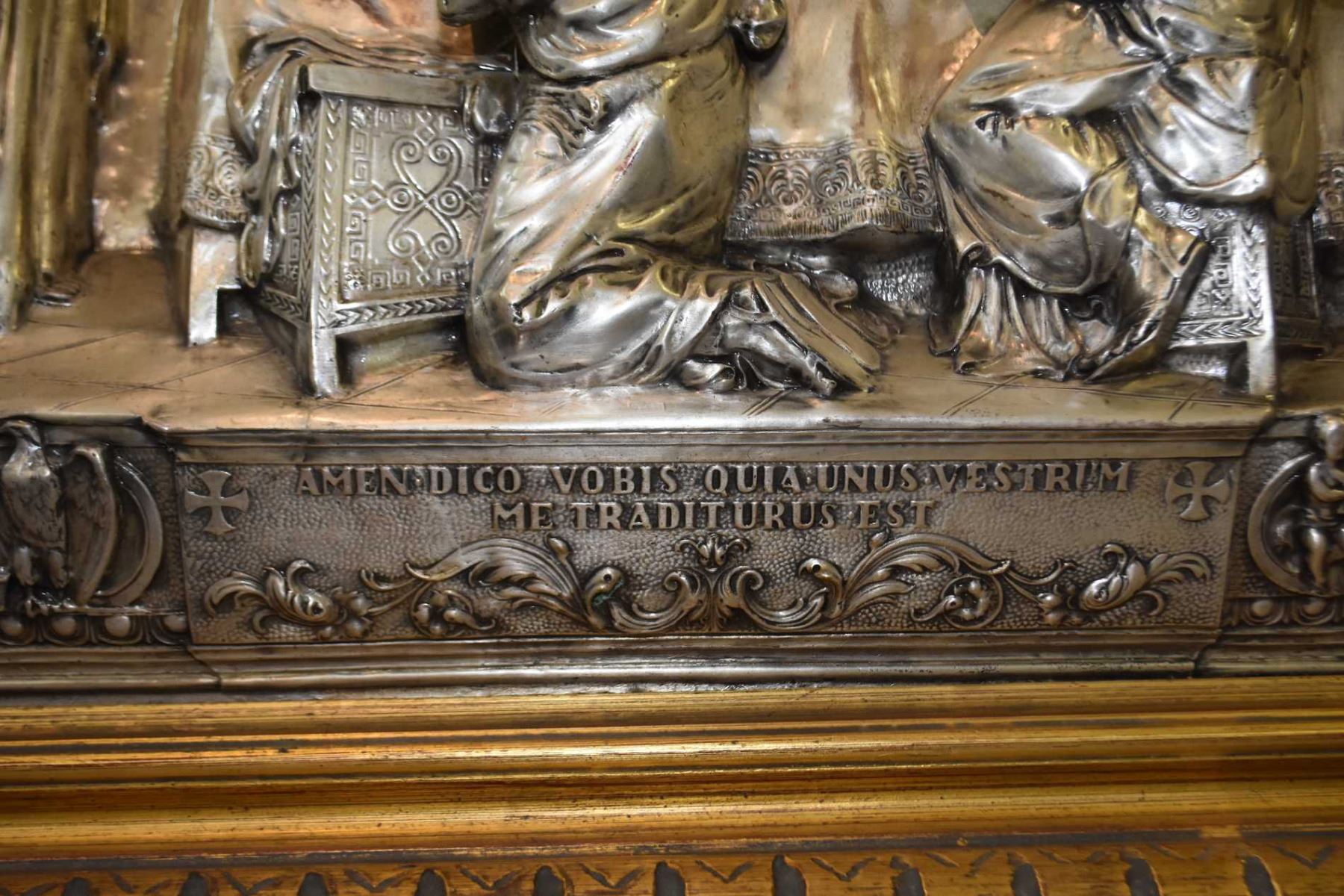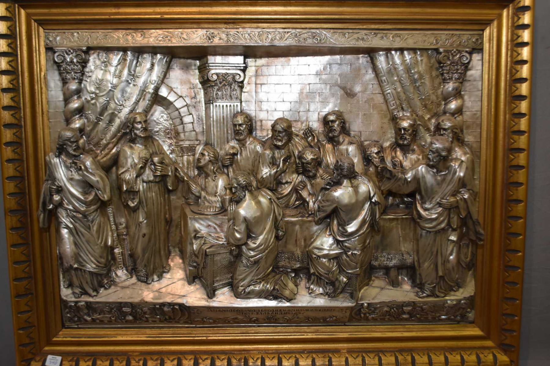Gilt framed 3 dimensional metal sculpture depicting the last supper, overall dimensions 28" X 37"