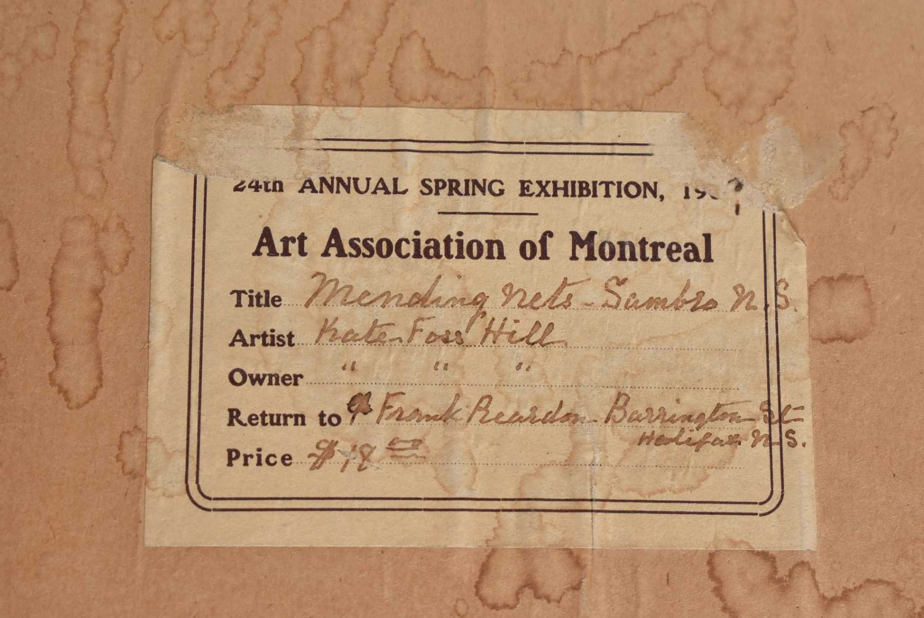 Gilt framed antique original watercolour painting titled and named on verso "Mending Nets-by artist Kate E. Hill", 9"X 14"