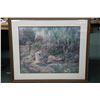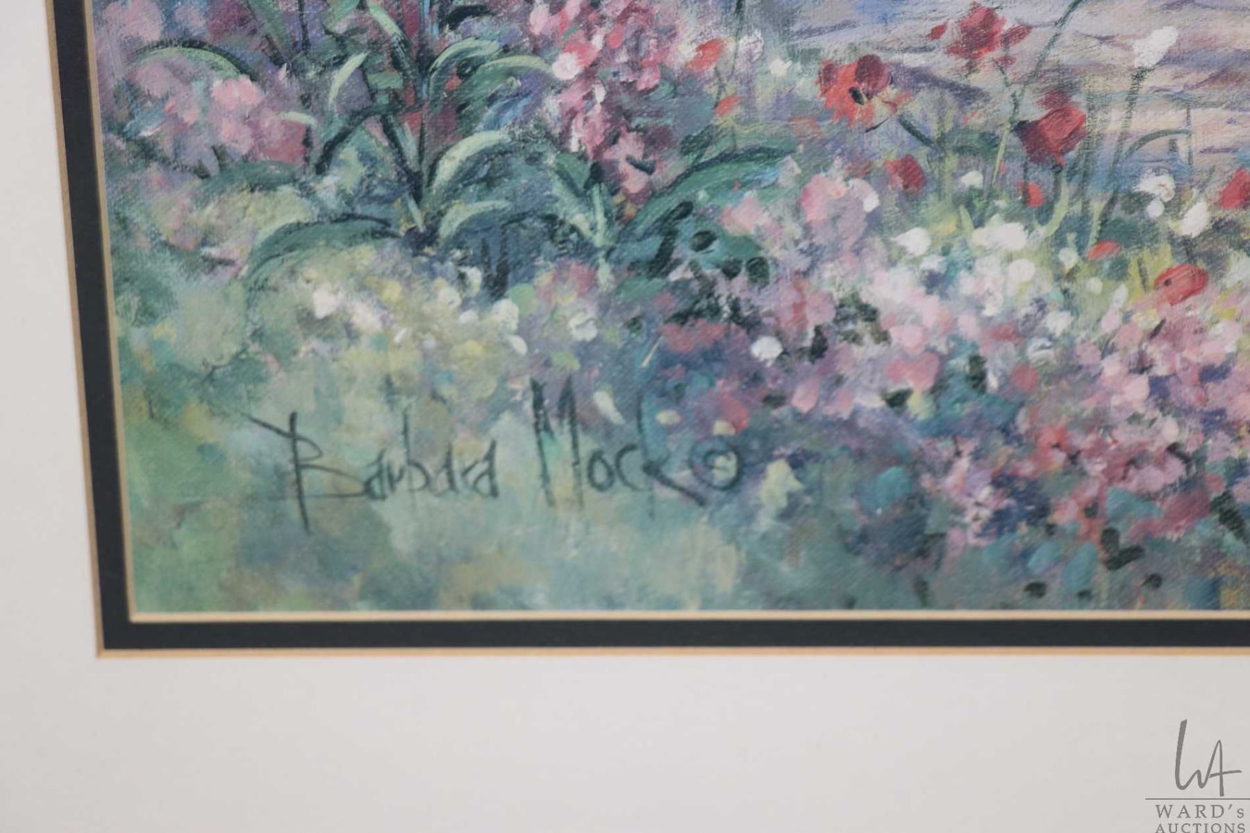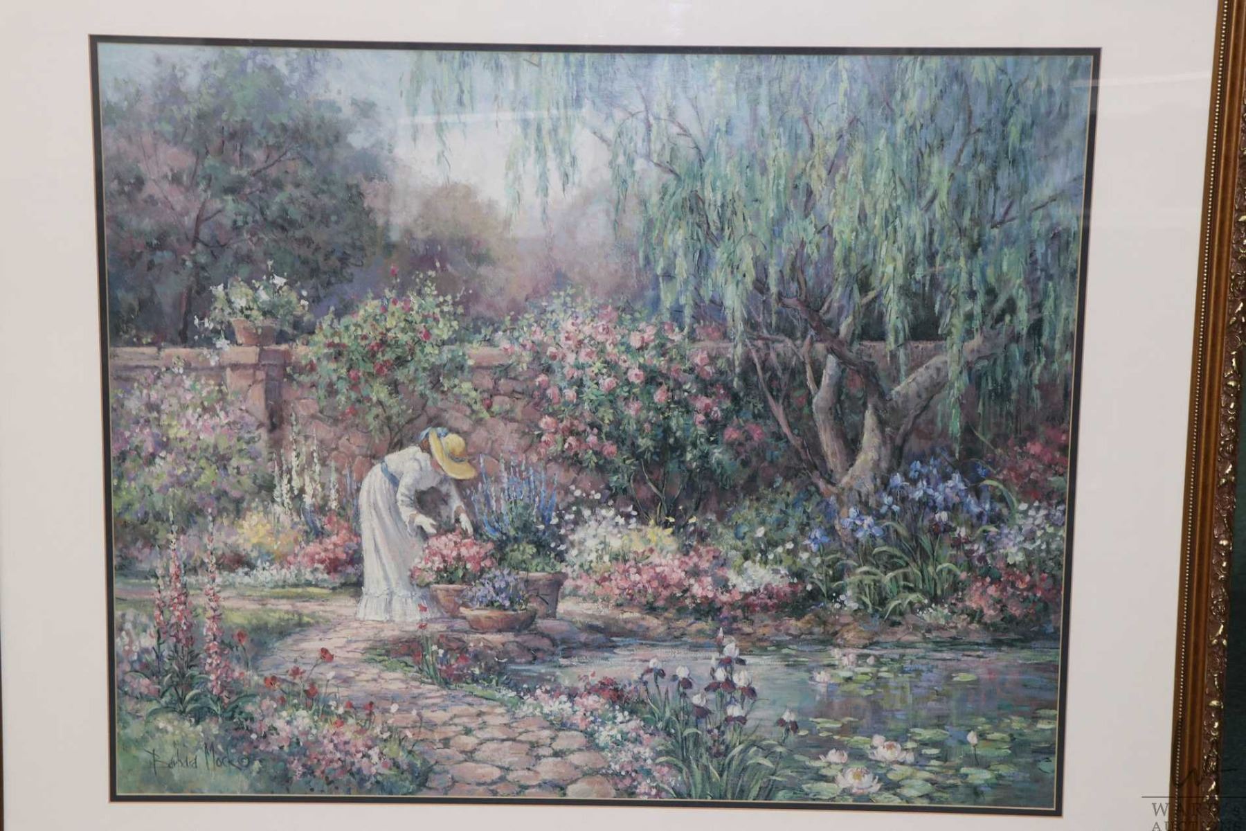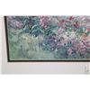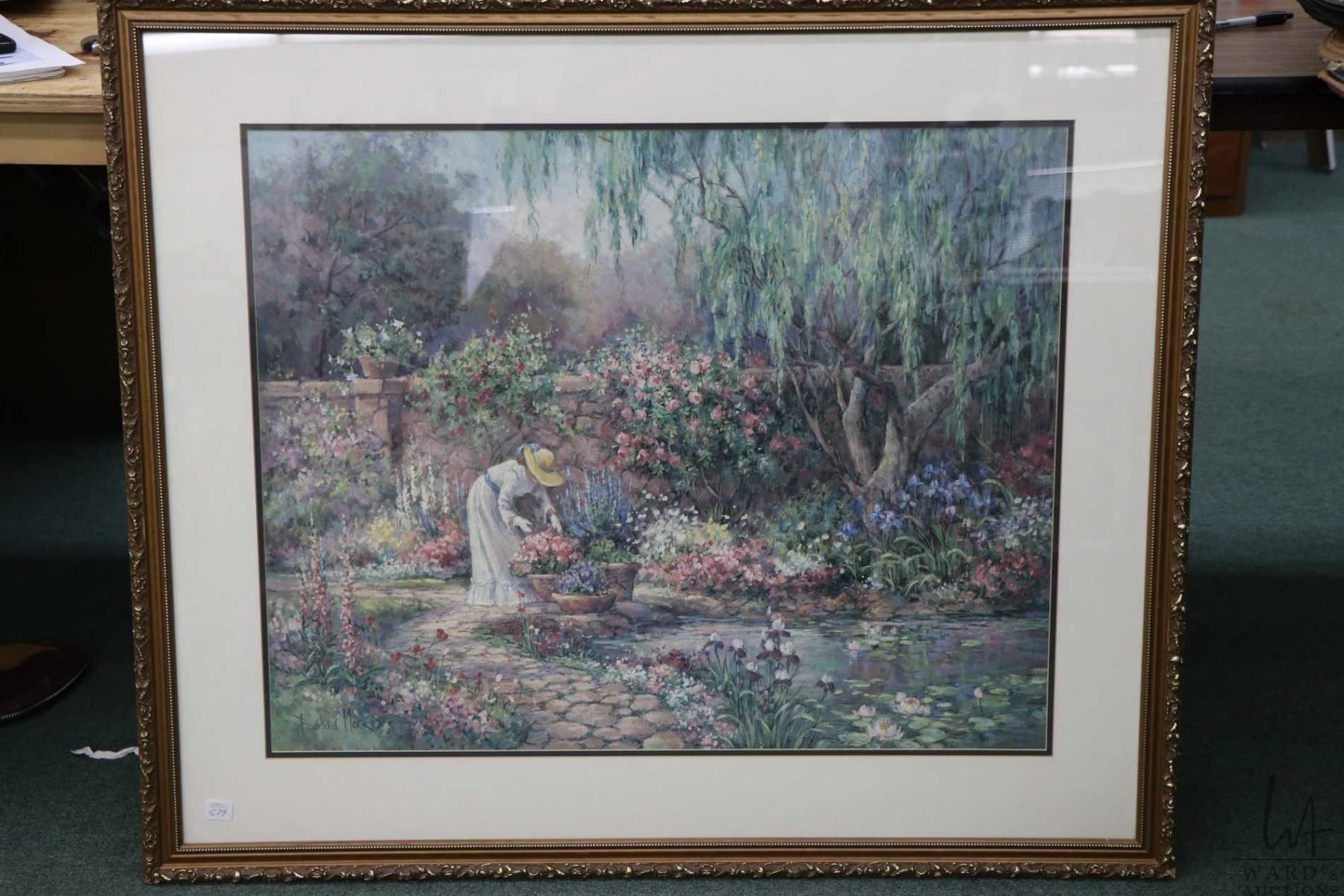 Gilt framed decor print featuring a flower garden with figure. Note: Not available for shipping. Local pickup only
