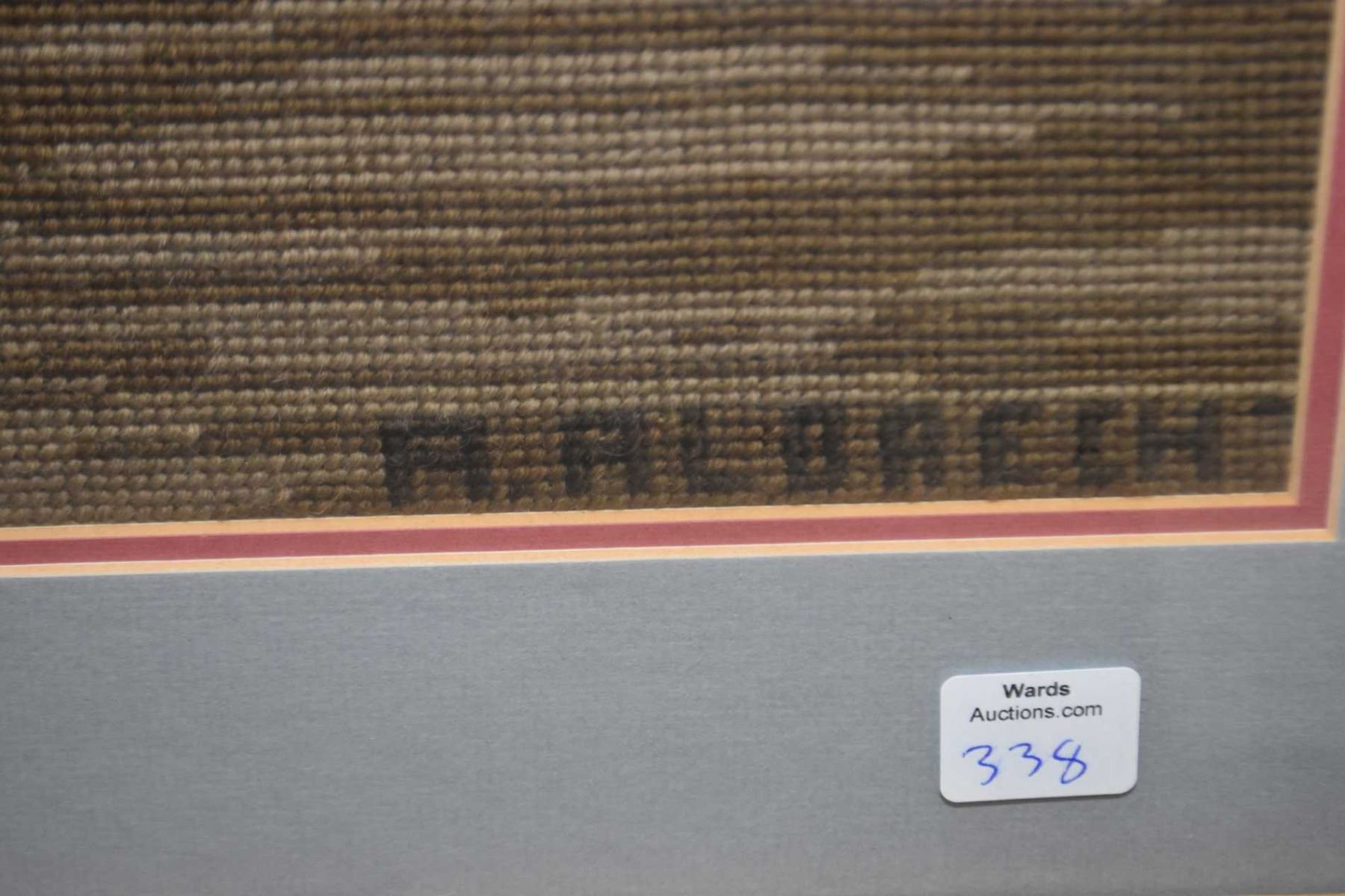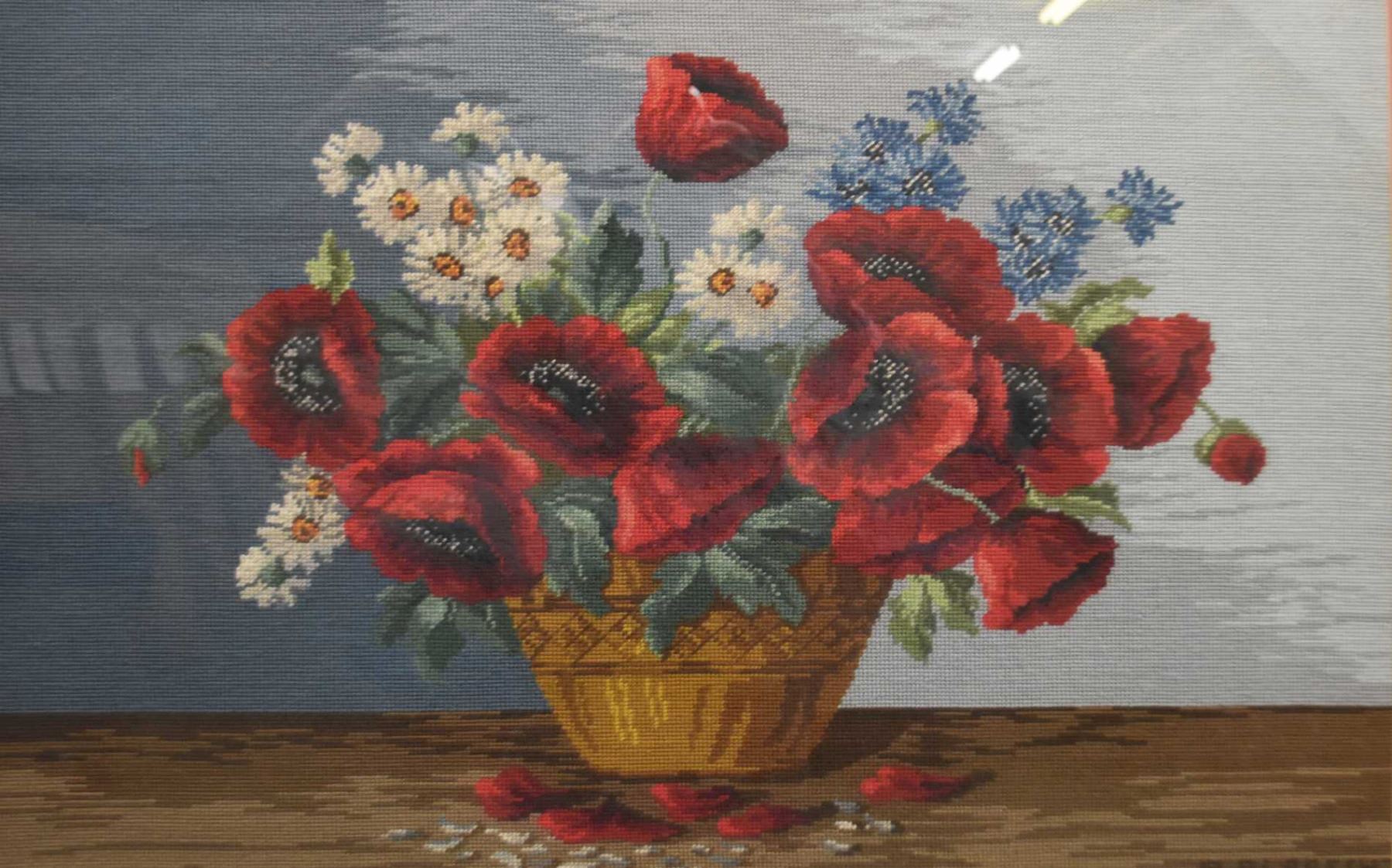 Gilt framed needlework featuring poppies and daisies, signed A. Albrecht, 21" X 31"